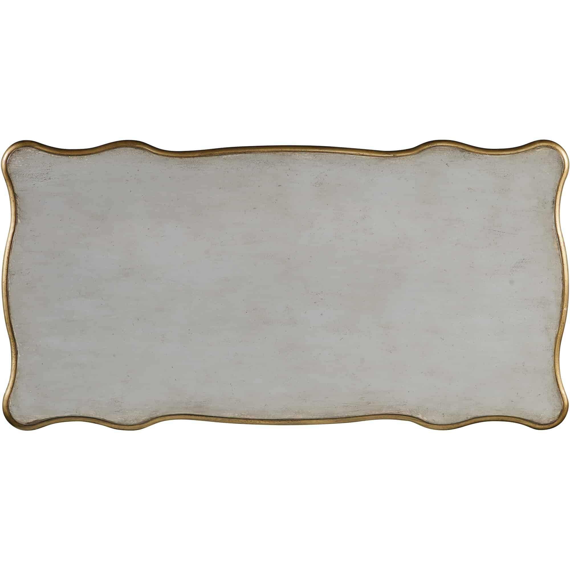 Finish: Gray finish with gold accents. Distressing includes cow-tailing, rub-through and emulsion.