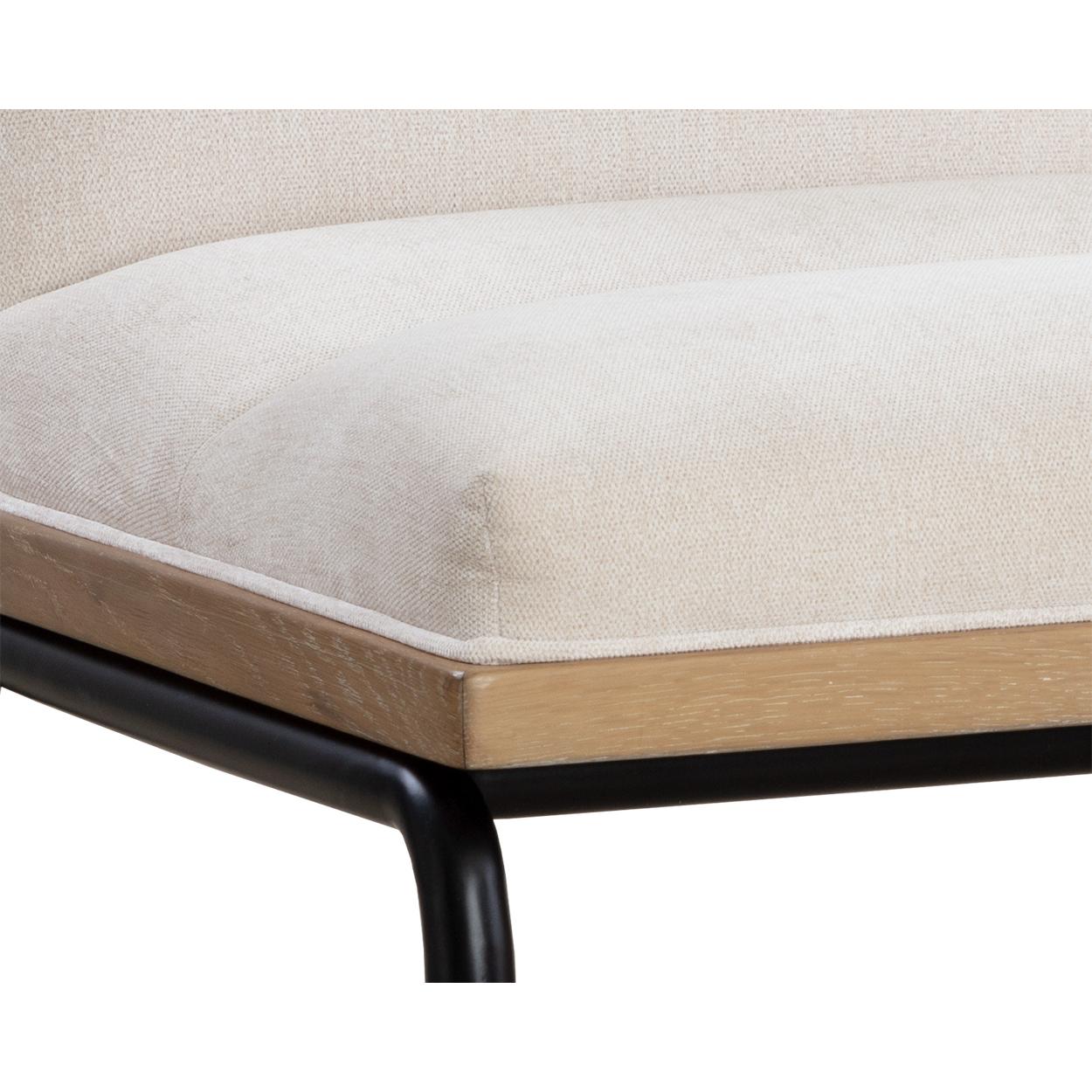 Plush seating and a simple frame make the Abilene Dining Chair versatile and incredibly comfortable. A mixed material seat features our polo club muslin performance fabric on top of a rustic oak wood frame. Paper rope detailing at the back of the chair gives an understated coastal influence while also acting as a functional handle. Powder-coated matte black legs contrast with the light-coloured materials.
