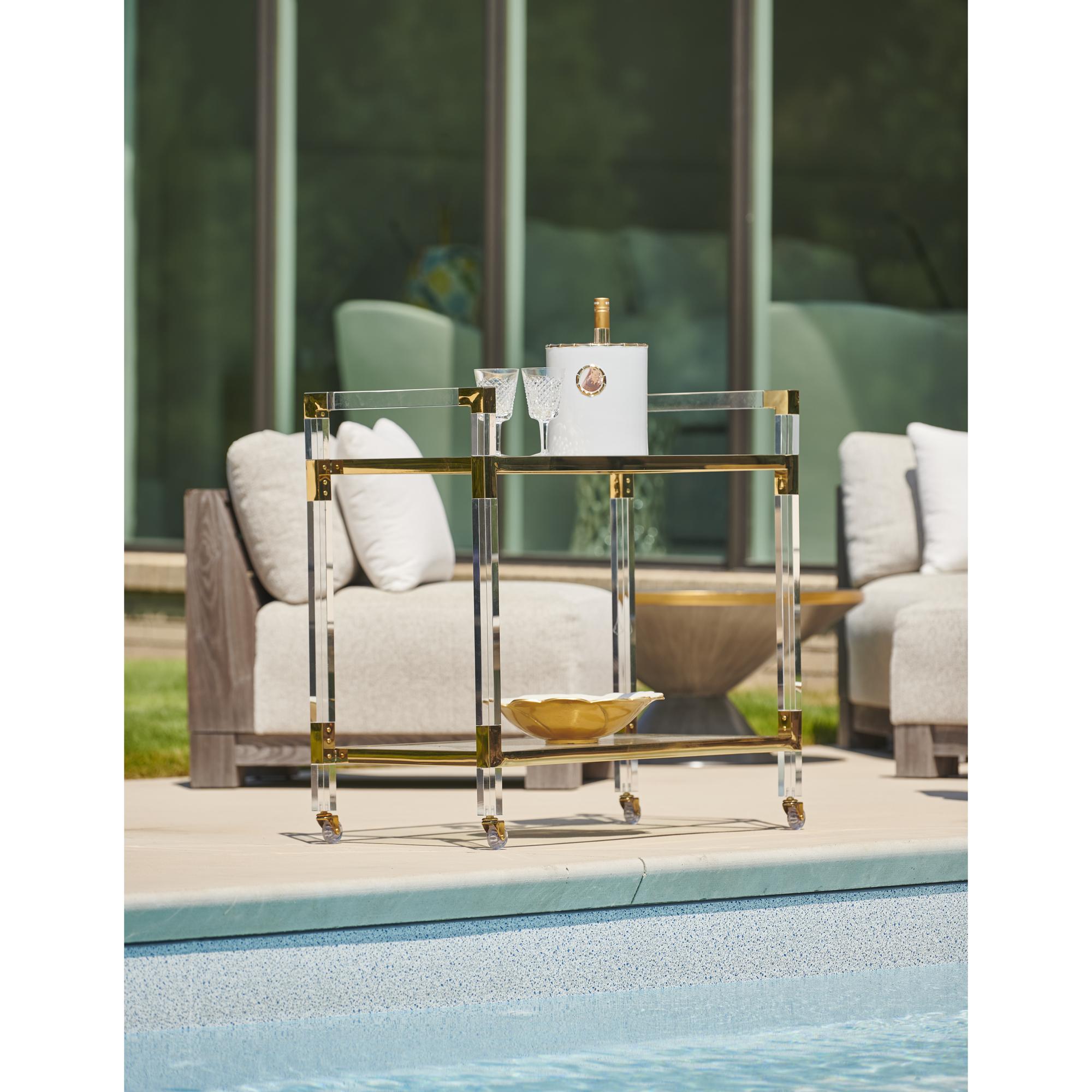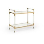 Clear acrylic with clear tempered glass shelves and polished brass finished iron edging