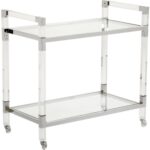 Wonderfully useful acrylic bar cart with tempered beveled glass shelves and nickel supports.