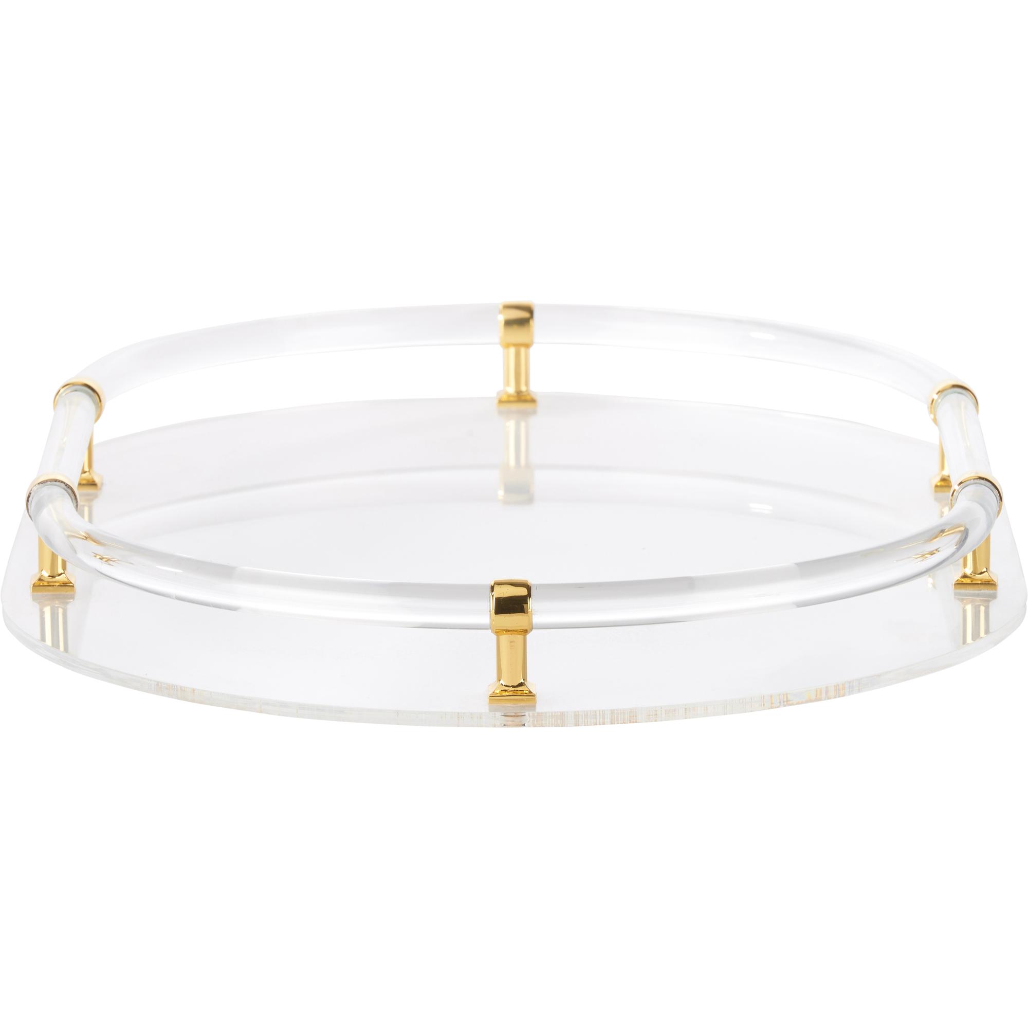 Elegant and modern, this oval clear acrylic tray features sleek brass accents that add a touch of sophistication. Perfect for organizing vanity items, serving cocktails, or styling a chic coffee table display.