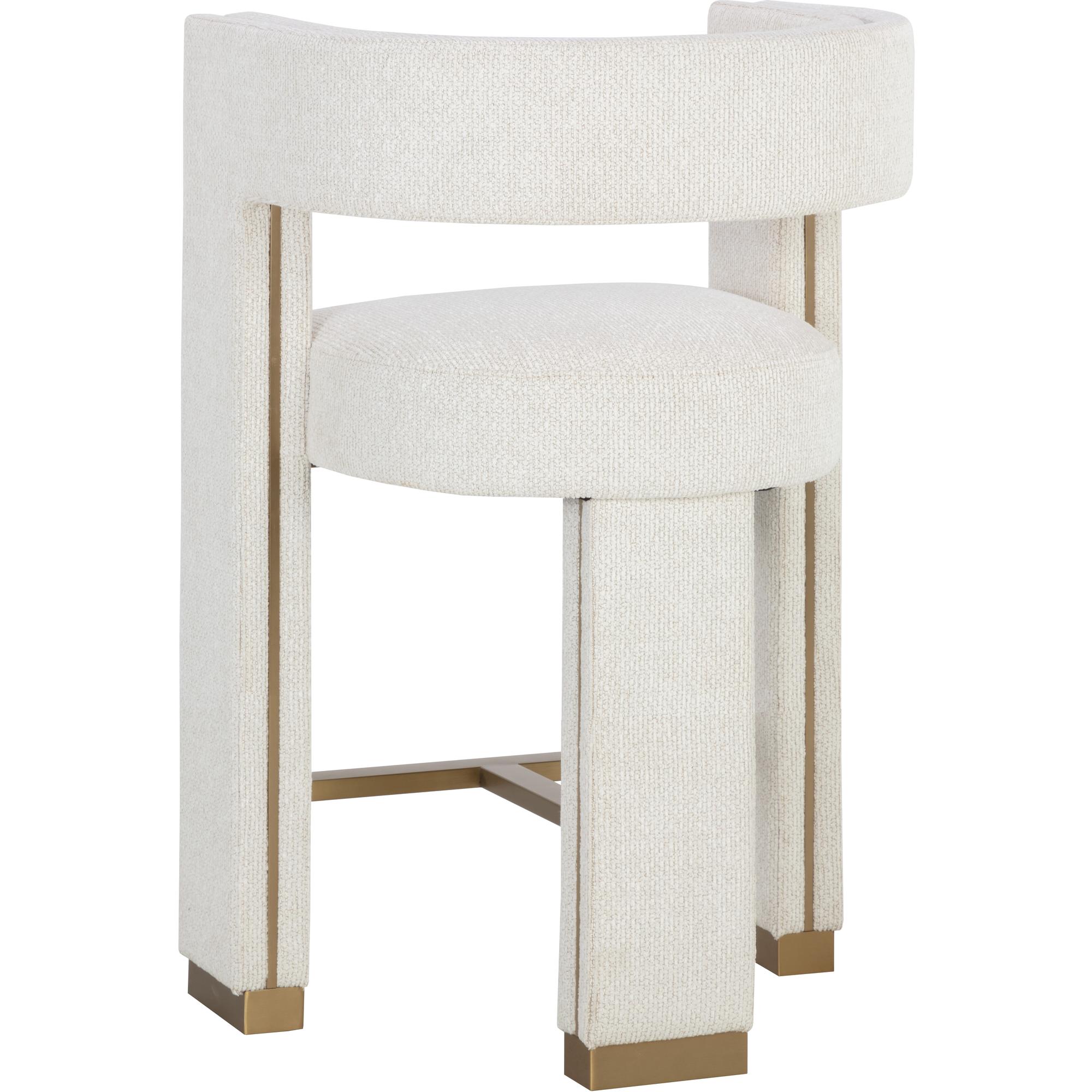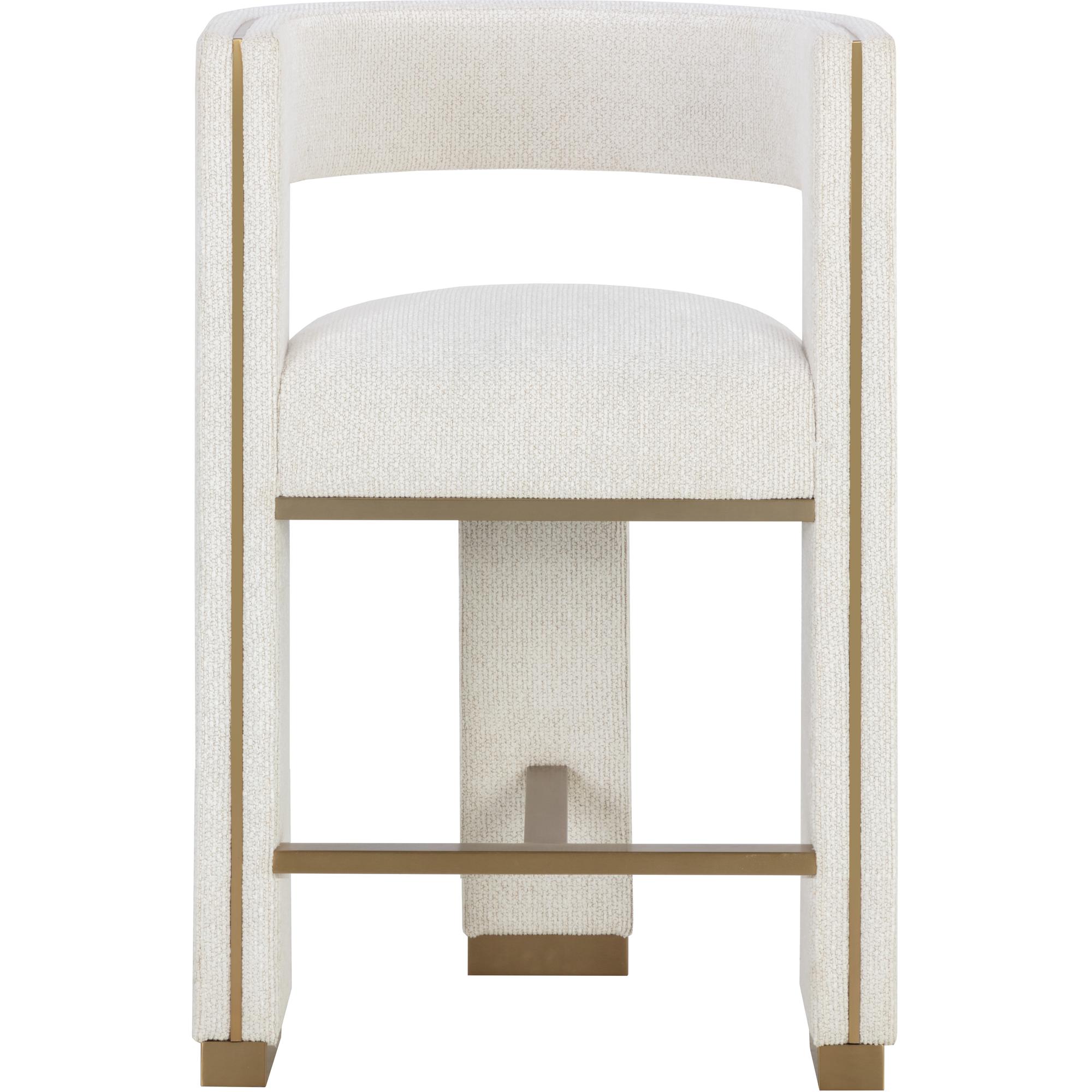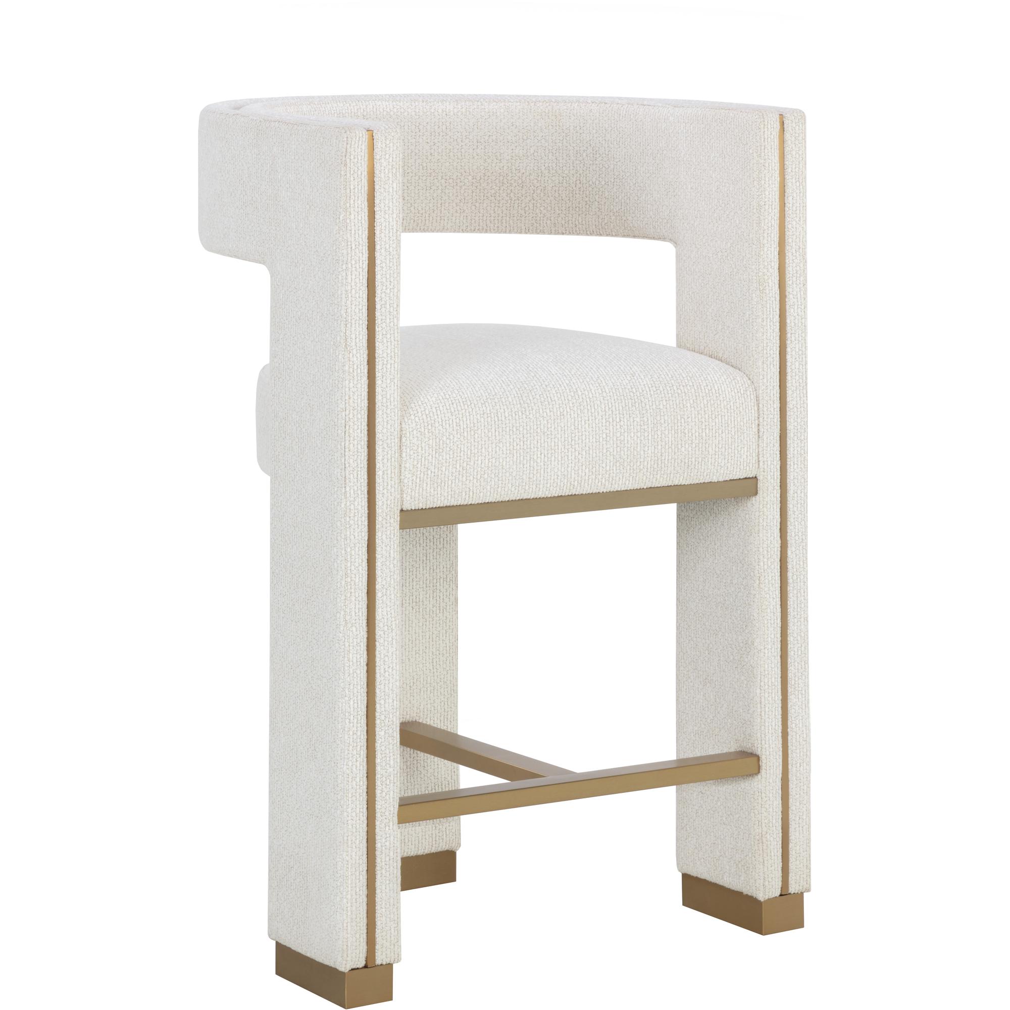 Perfectly poised with a distinct three-legged design, the Adamina Counter Stool will leave a lasting impression. Powder-coated gold metal detailing enhances the plush texture of our rhea light barley performance fabric for a stylish seating solution. Performance fabric is moisture repellent, durable and easy to clean.