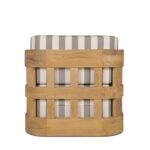 - brown & white stripe upholstered cushioning with a solid tone toss cushions