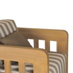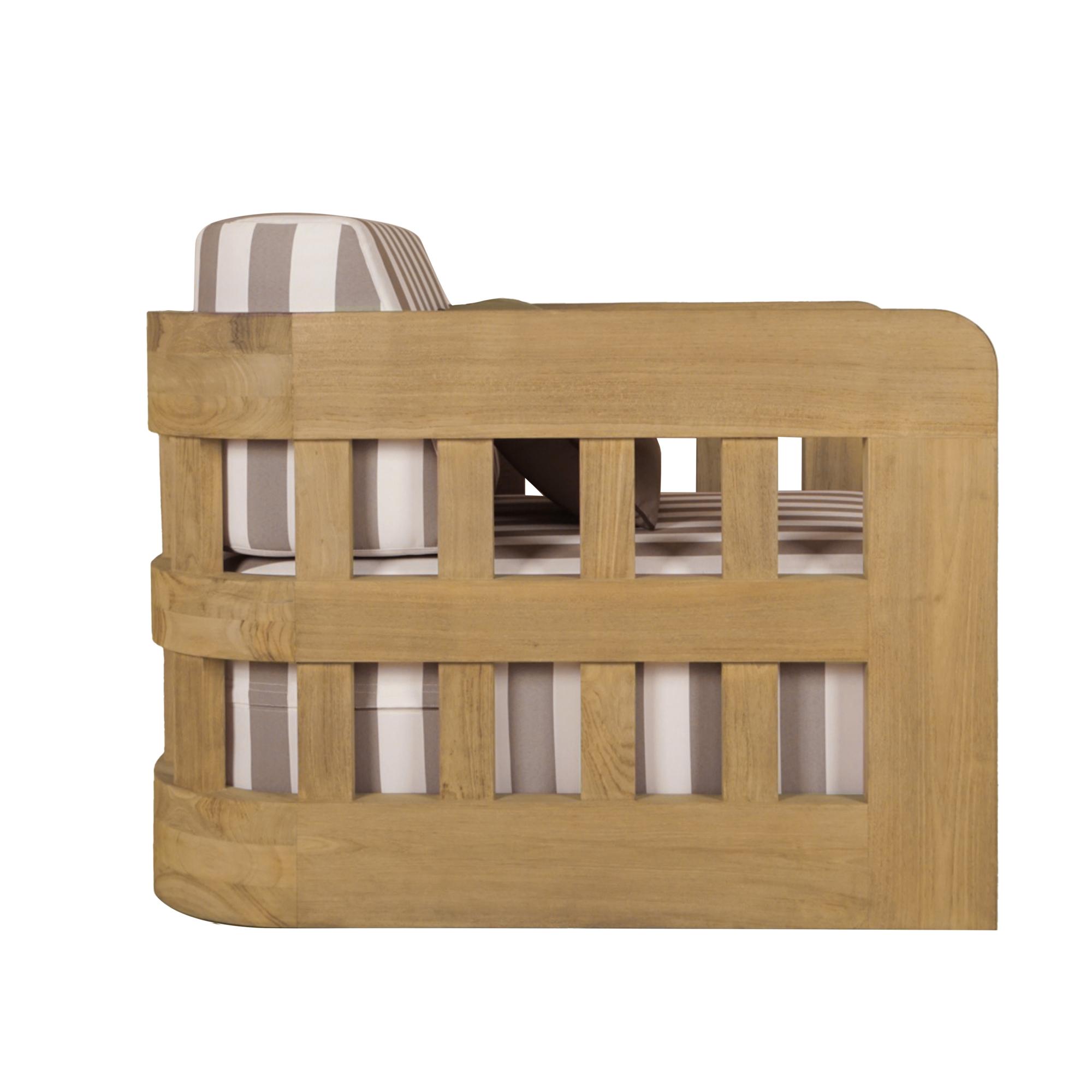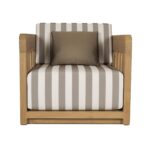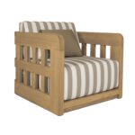 The Adelaide outdoor accent chair infuses the outdoor space with vintage-inspired charm. This contemporary accent chair features a solid teak frame and quick-dry foam cushions upholstered in 100% Olefin fabric. The brown and white striped cushions, accented with a solid tone toss pillow, create visual interest without overwhelming. The curved windowpane detailing nods to vintage designs while maintaining a modern aesthetic.