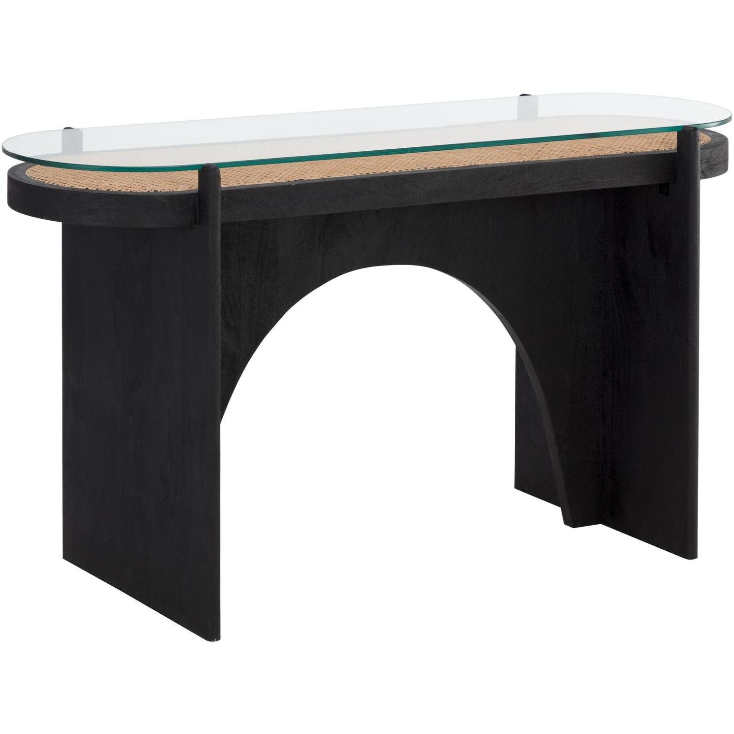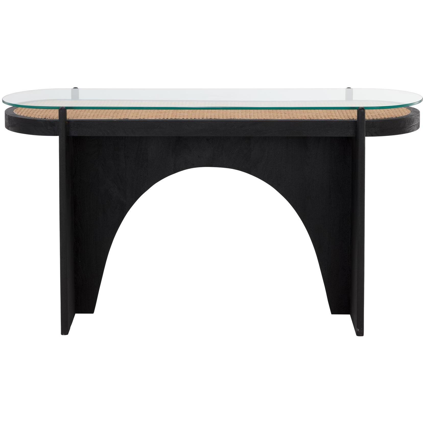 Inspired by global travels, the Adora Console Table combines old world influence with modern style. Features natural rattan top covered with clear glass and a sculpted black mango wood base. An intriguing design from all angles. Coordinating coffee table also available. Made in India. With refined craftsmanship, this design was brought to life by skilled local artisans. By nature, these materials develop unique imperfections such as fissures, markings and colour variations for a truly one-of-a-kind piece. Handle With Care: This design has been crafted with rattan. This artisan-crafted material features intricate weaving that results in natural variations where no two pieces are alike. Colour and texture differences are to be expected and embraced with this natural material. Due to the weaving process used, the fibres in this material may display shorter or longer lengths where the weaving ends. Visit our Product Care page for more information on how to ensure the lasting beauty of this piece.