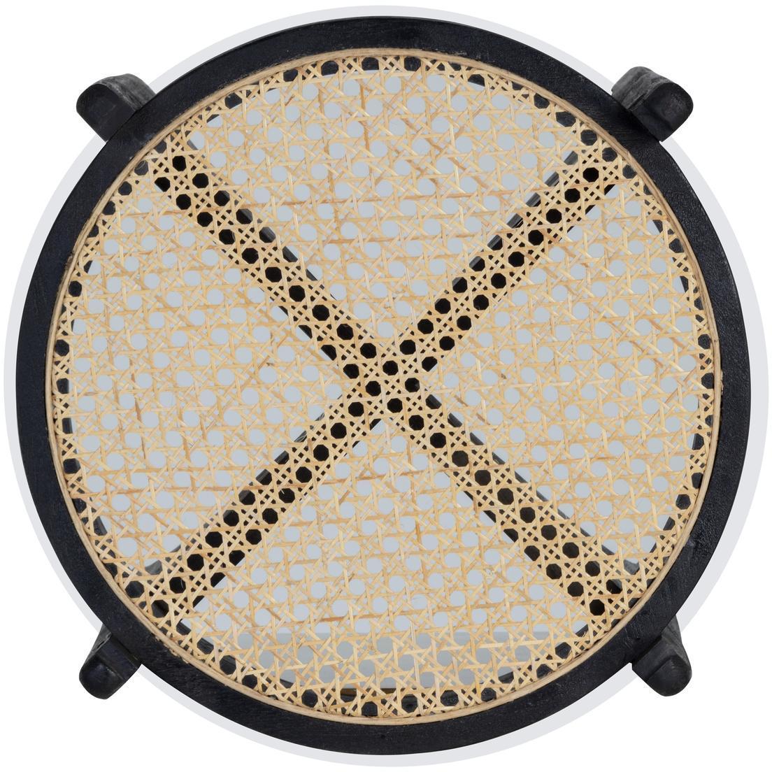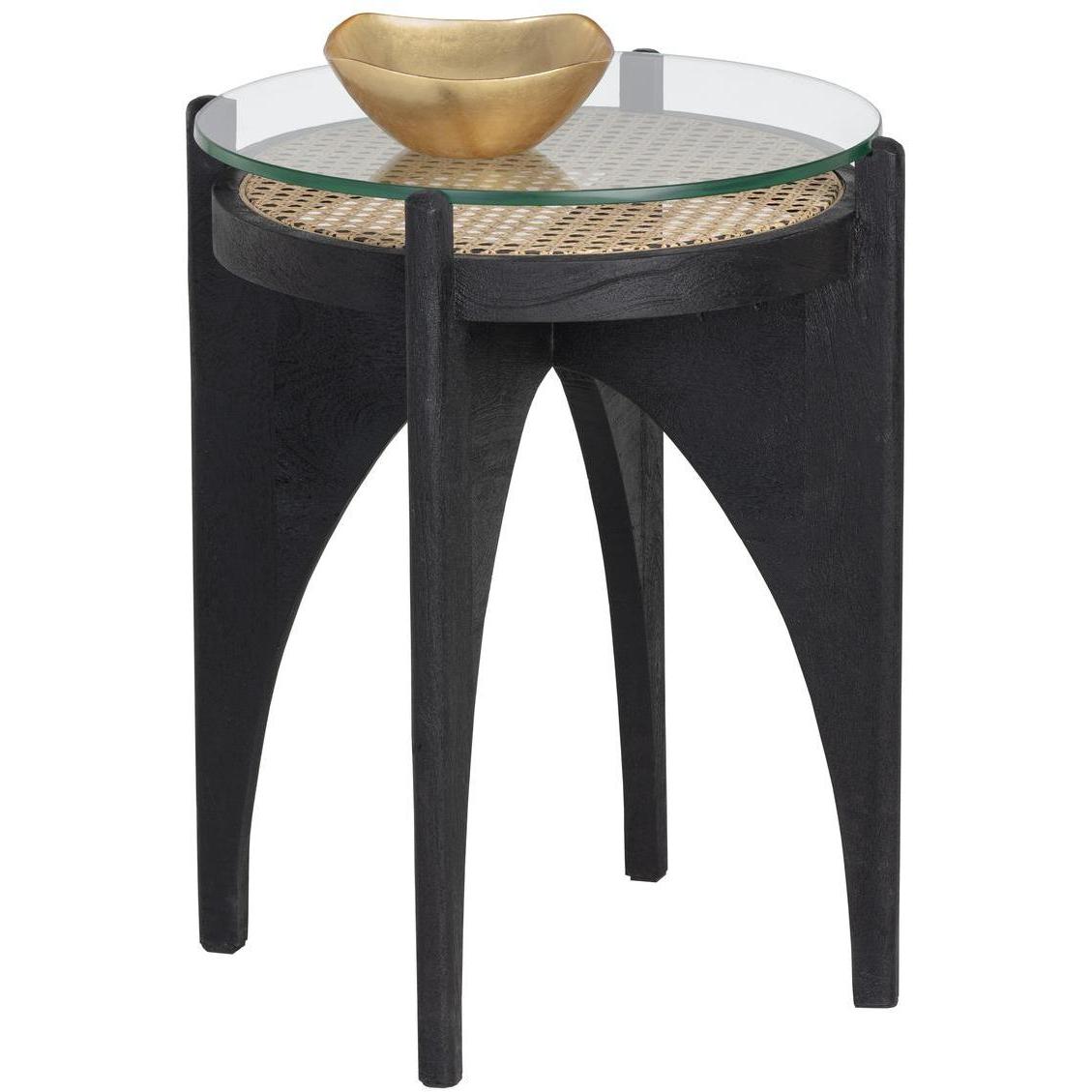 Inspired by global travels, this round end table combines old world influence with modern style. Features natural rattan top covered with clear glass and a sculpted black mango wood base. An intriguing design from all angles. Coordinating coffee table also available. Made in India. With refined craftsmanship, this design was brought to life by skilled local artisans. By nature, these materials develop unique imperfections such as fissures, markings and colour variations for a truly one-of-a-kind piece. Handle With Care: This design has been crafted with rattan. This artisan-crafted material features intricate weaving that results in natural variations where no two pieces are alike. Colour and texture differences are to be expected and embraced with this natural material. Due to the weaving process used, the fibres in this material may display shorter or longer lengths where the weaving ends. Visit our Product Care page for more information on how to ensure the lasting beauty of this piece.