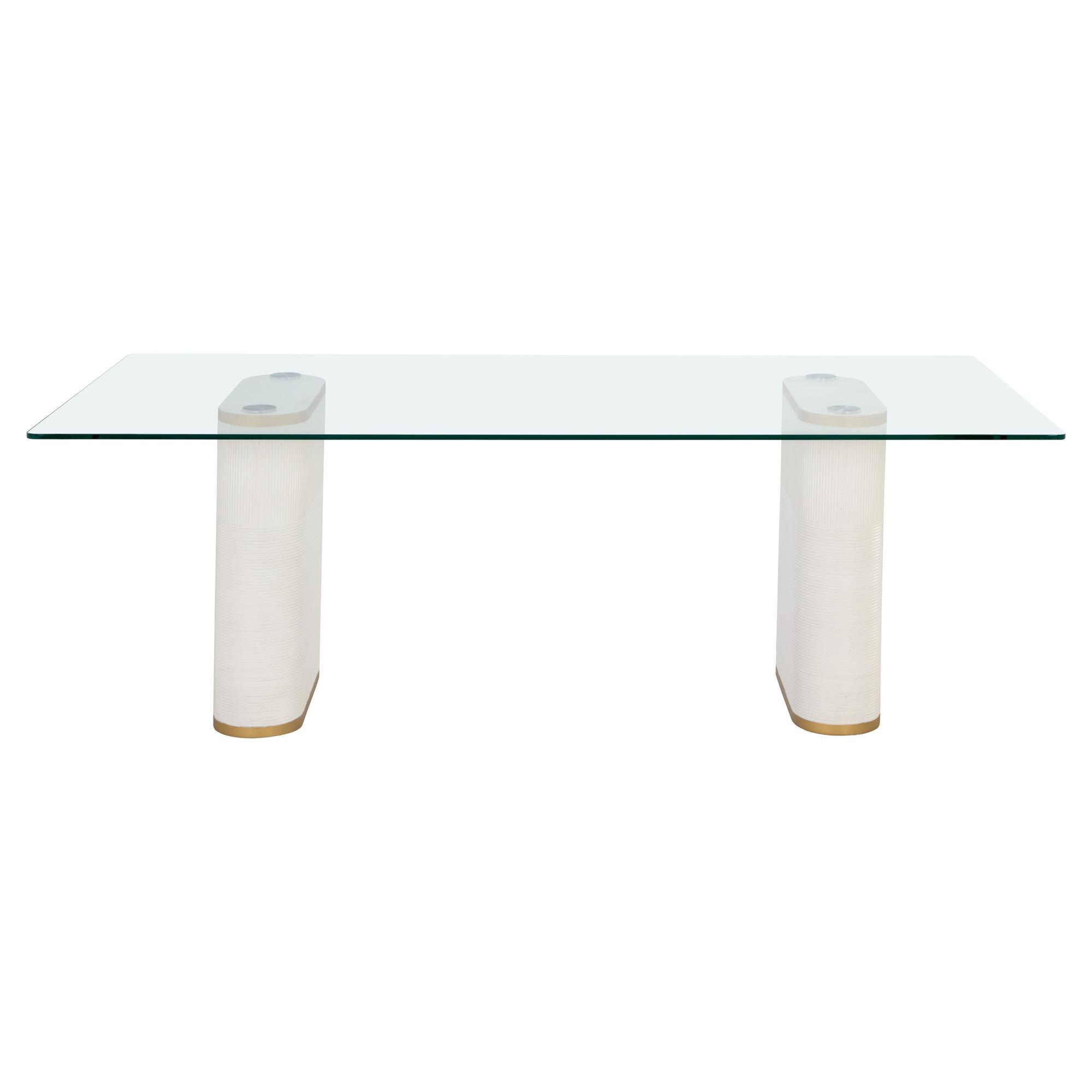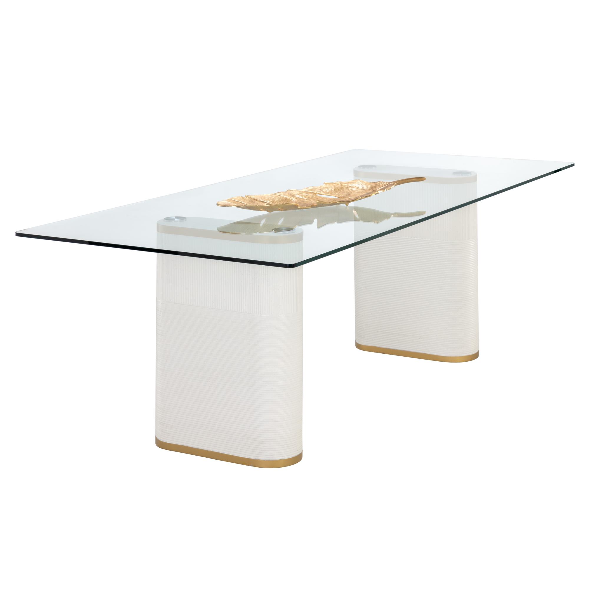 The Aemond Dining Table will add a touch of elegance to any dining space. Features a rectangular clear glass tabletop that sits on two white concrete legs. Features lined detailing and gold accents on the base for added dimension to the look.