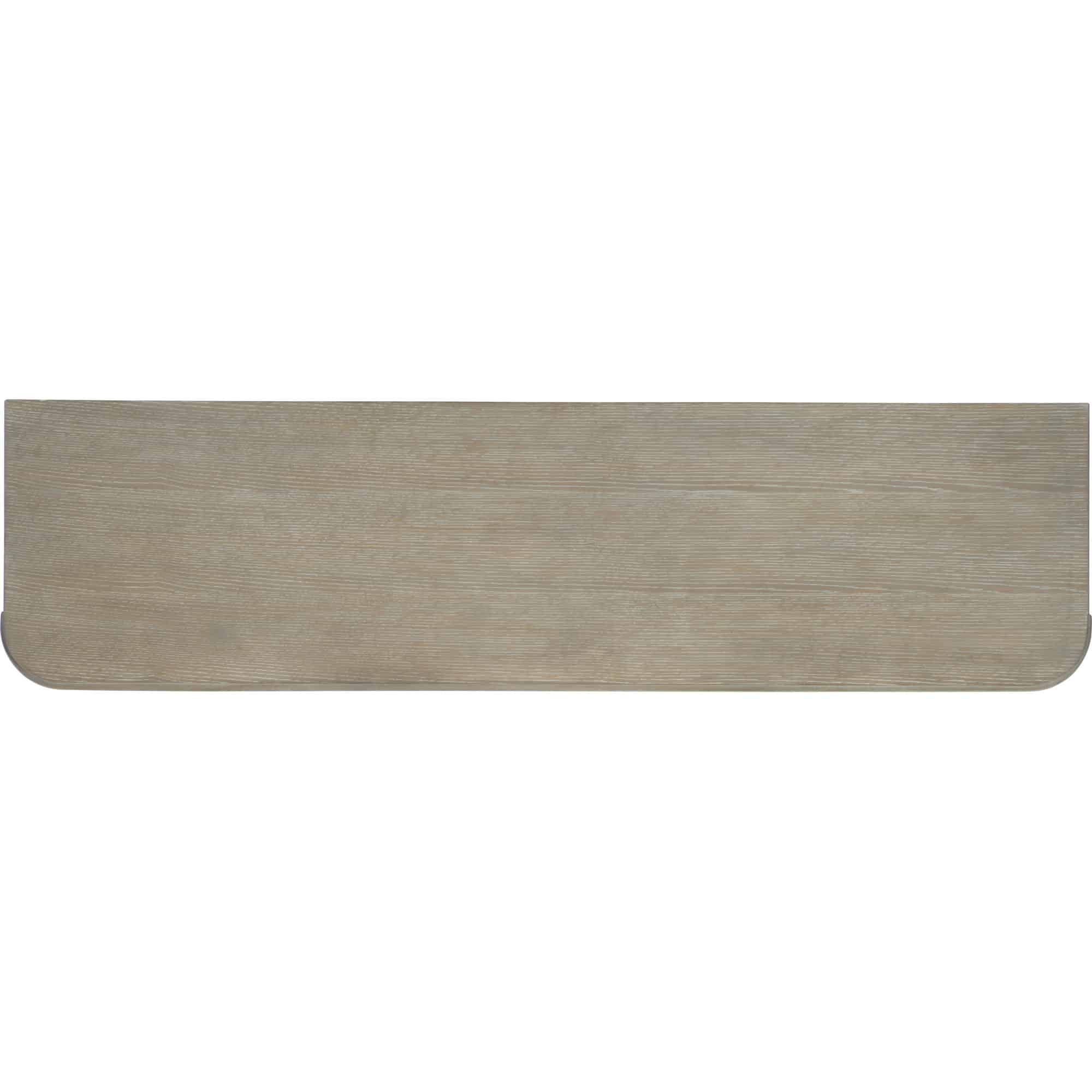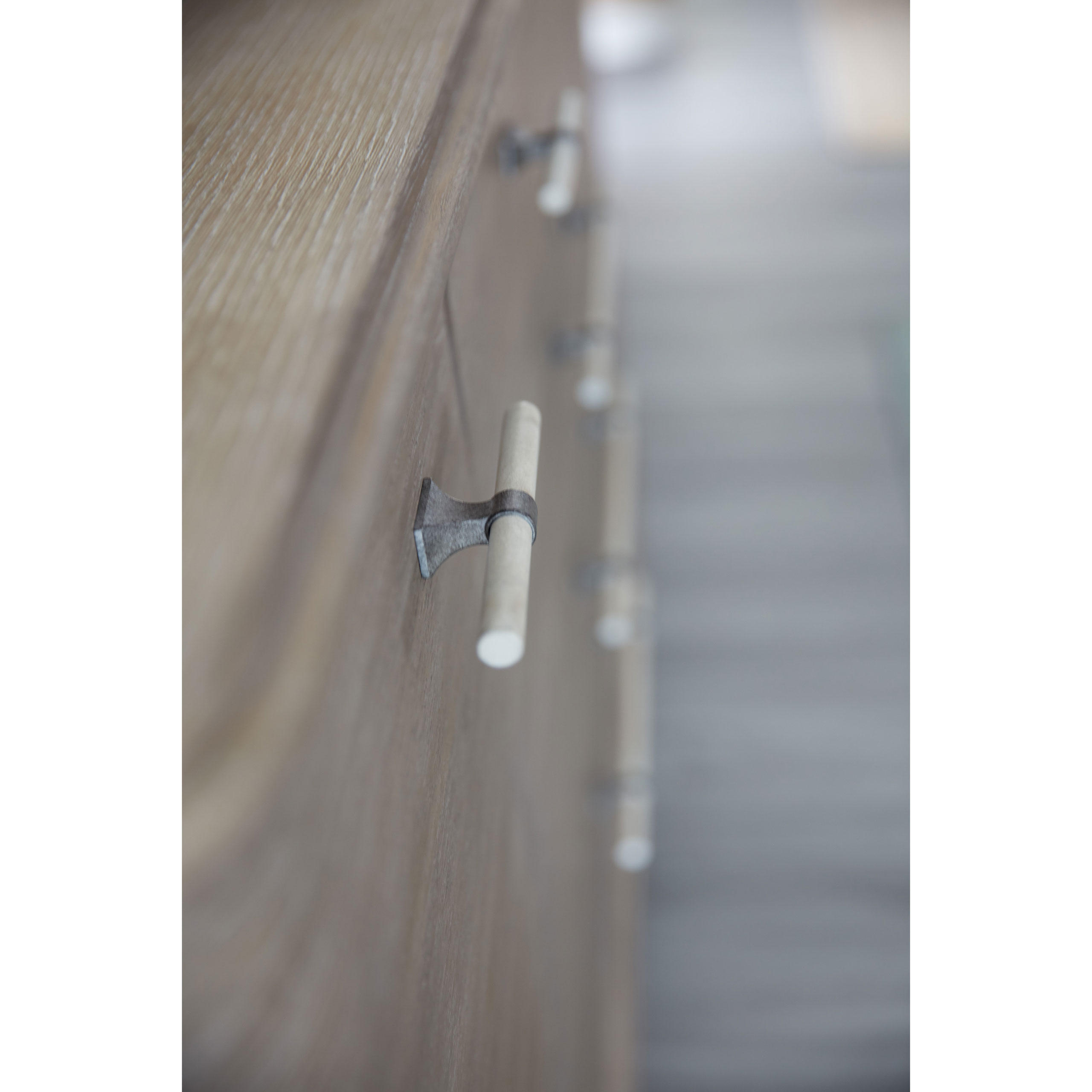 Finish: Greige sand-blasted finish on quartered oak veneers with cream and pewter bar pulls