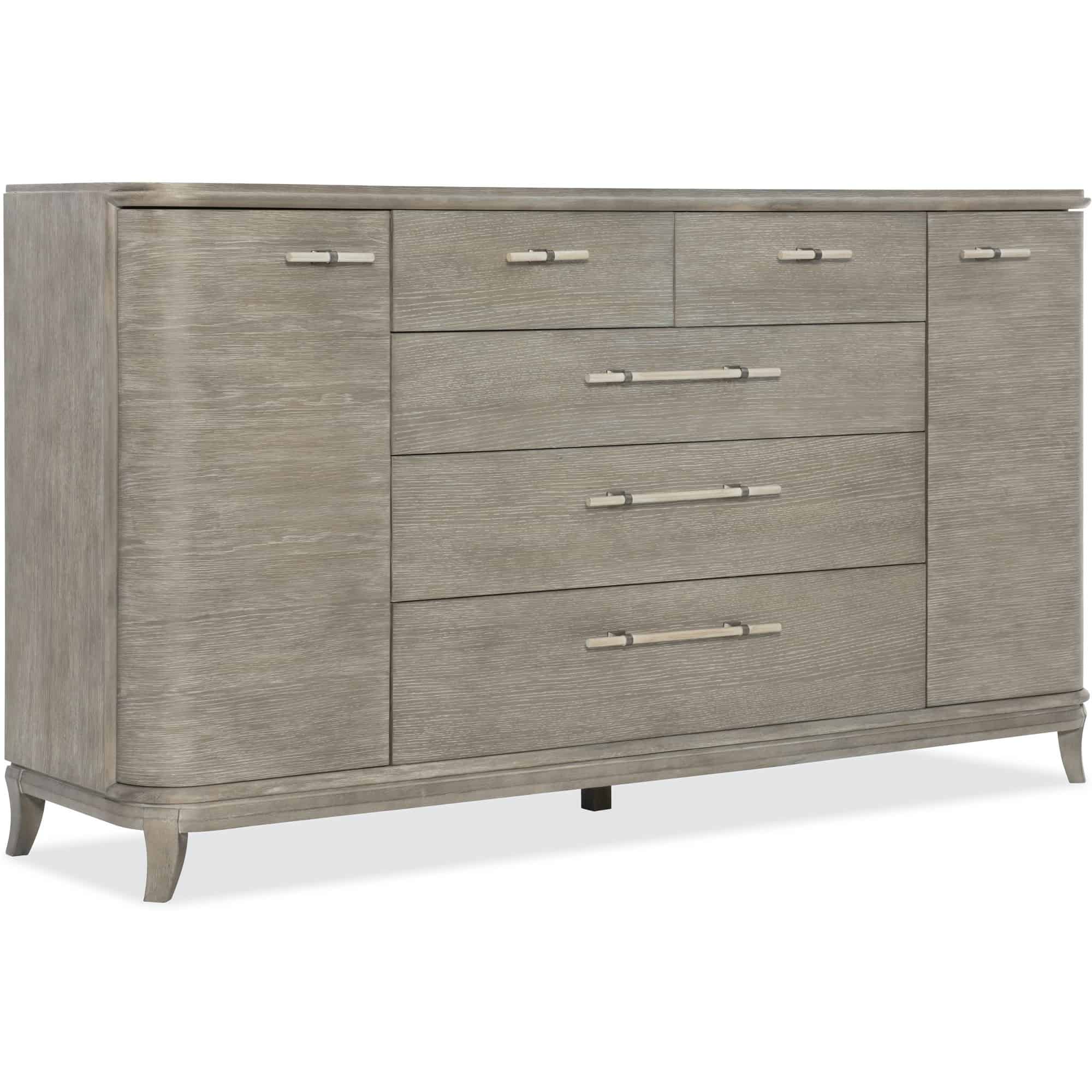 - Finish: Greige sand-blasted finish on quartered oak veneers with cream and pewter bar pulls. Distressing includes wire brushing.