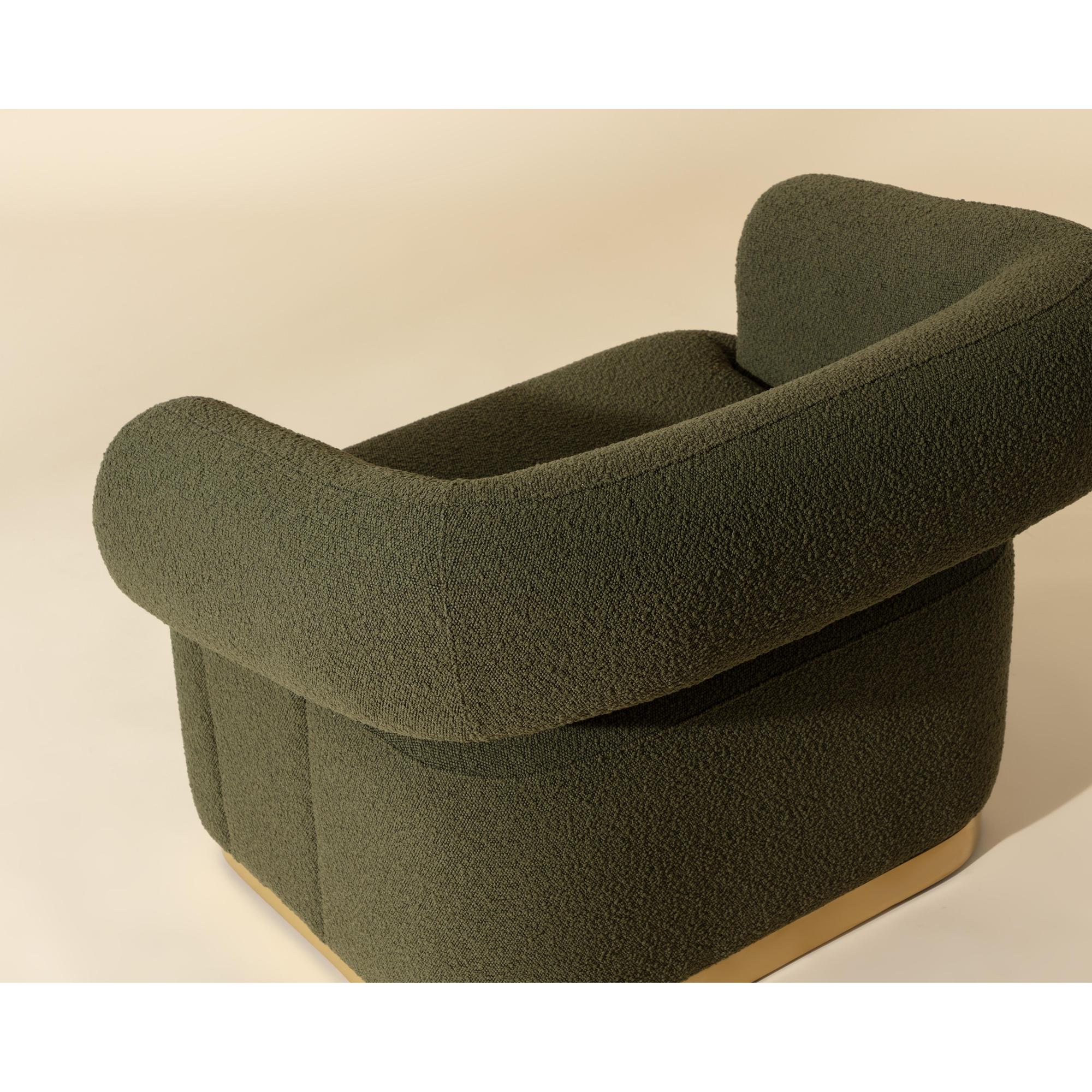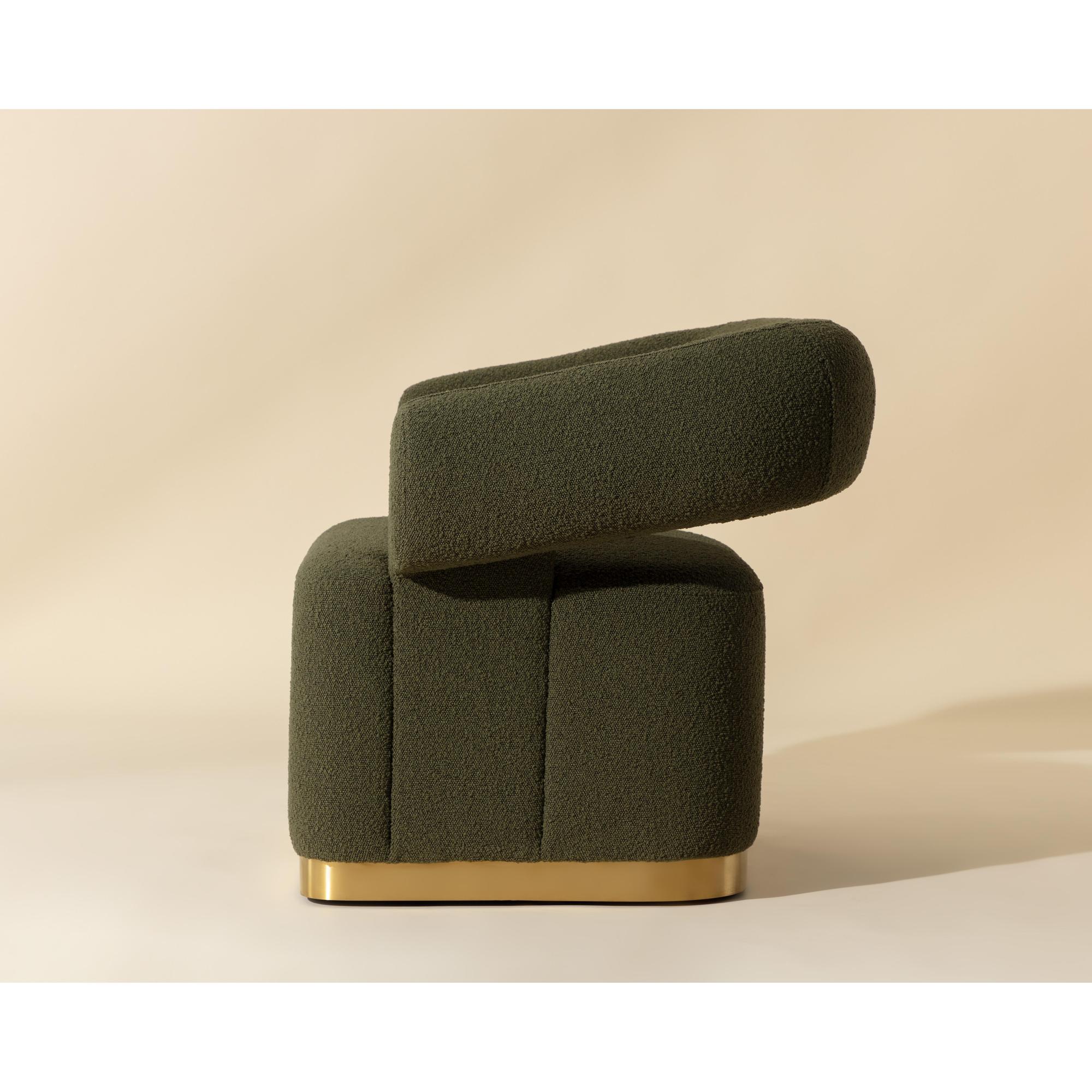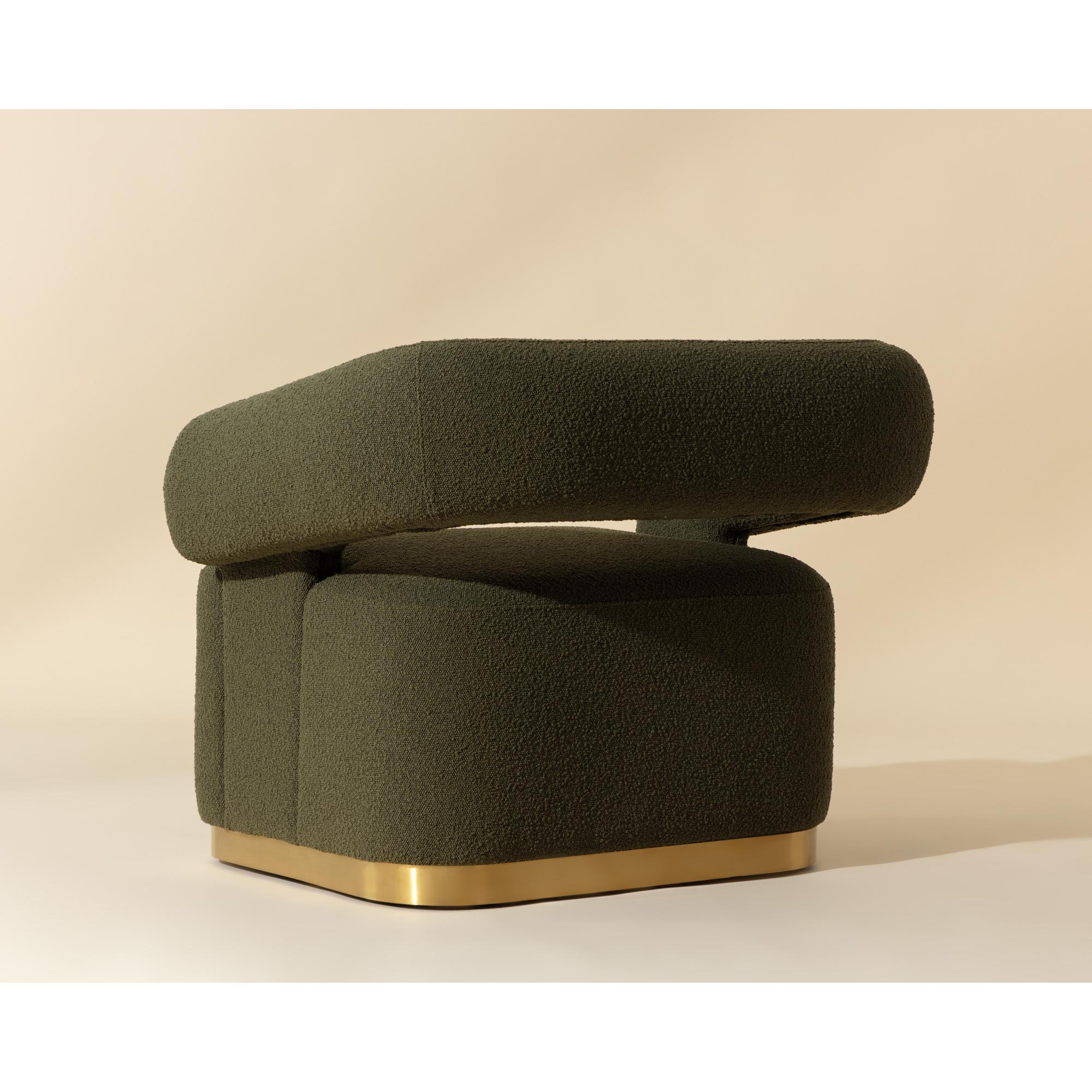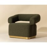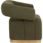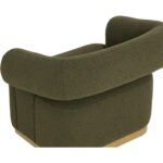 The Aggie Swivel Lounge chair is a statement-making mid-century accent chair with curves in all the right places. Upholstered in copenhagen olive fabric with a brushed gold stainless steel base, this lounge chair is a beautiful spectacle with its harmonious mix of textures.