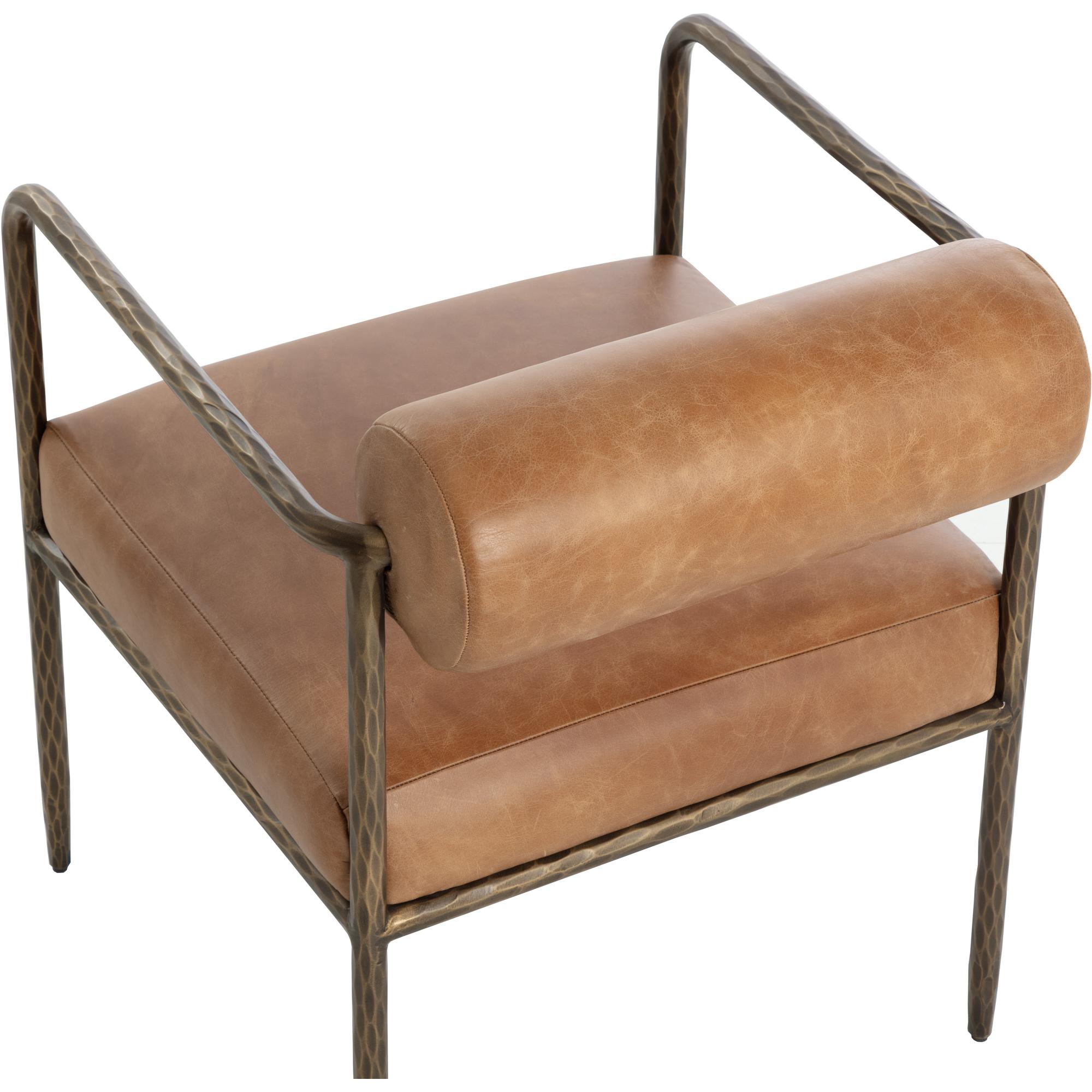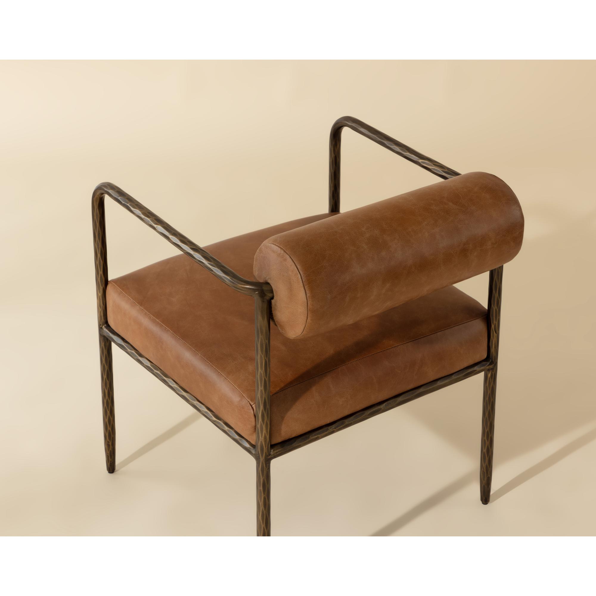 The simple frame of the Ajani Dining Armchair lets the finer details do the talking. Crafted from iron with a hand-hammered finish, this piece showcases a distinctly textured look. Tan leather and a bolster back add the perfect touch of comfort, making it a great dining room addition.