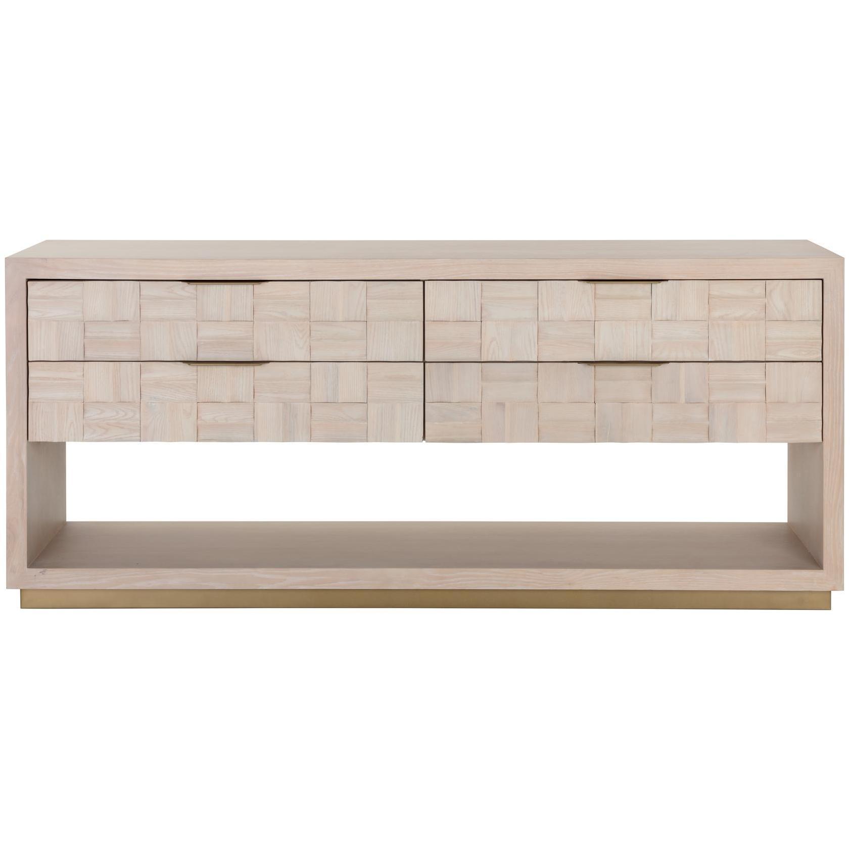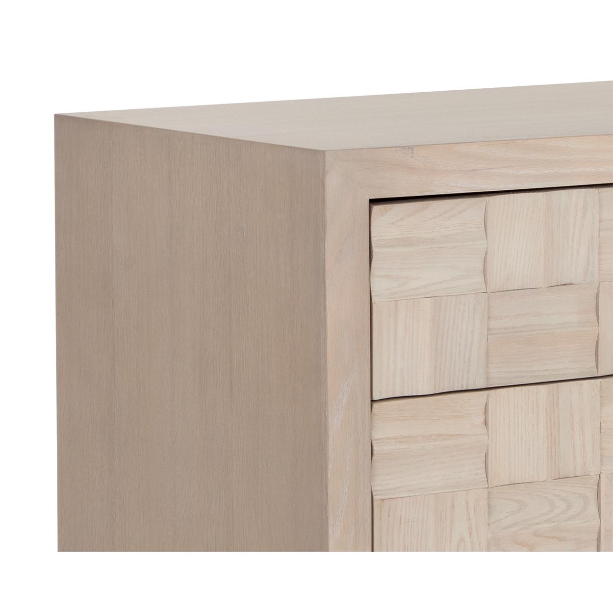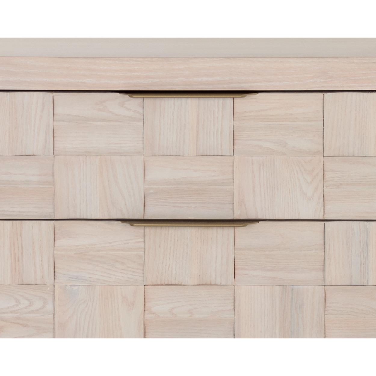 The Akava Dresser will add intrigue to any bedroom space. Features a minimal linear frame crafted with a light oak wood veneer. Wood tiling on the front drawer brings texture and visual interest to the overall look. Completed with light gold aluminum handles and a matching steel base. As wood is an organic, porous material, these pieces will contain natural variation of texture and may also exhibit fine indentations and cracks. Wood pieces will also display a disparity of colour and grain, and visible knots and burls that add to the character of each piece.