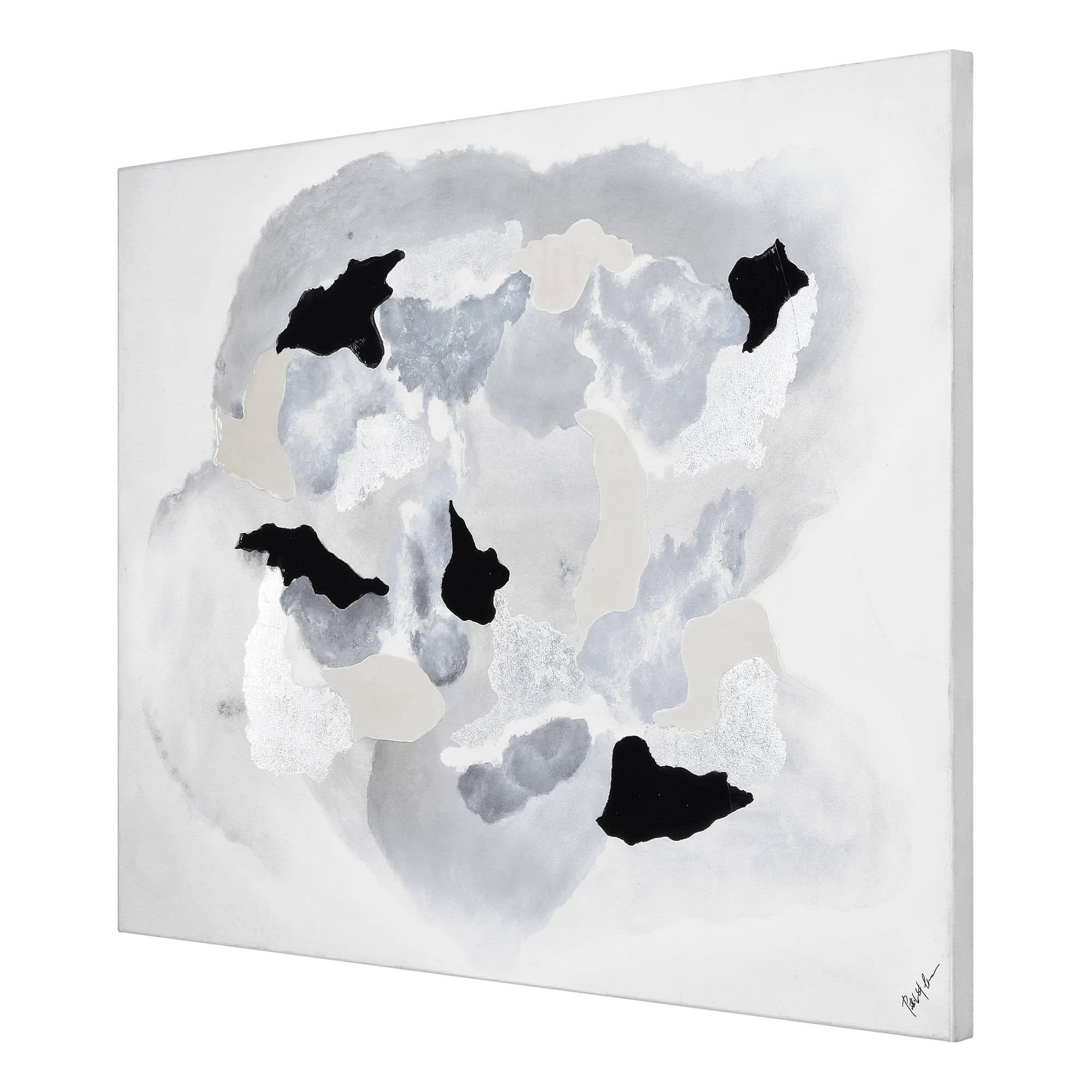 Clients dreaming of creating an ethereal yet modern space in their home or business will find all their needs met in this piece of canvas art. Hanging horizontally or vertically, its abstract shapes and contrasting palette take on a new life at each angle. Best styled with dark, minimalist furnishings and decor, the dark brush strokes on the art painting allow for the living room or bedroom it’s set within to feel cohesive.