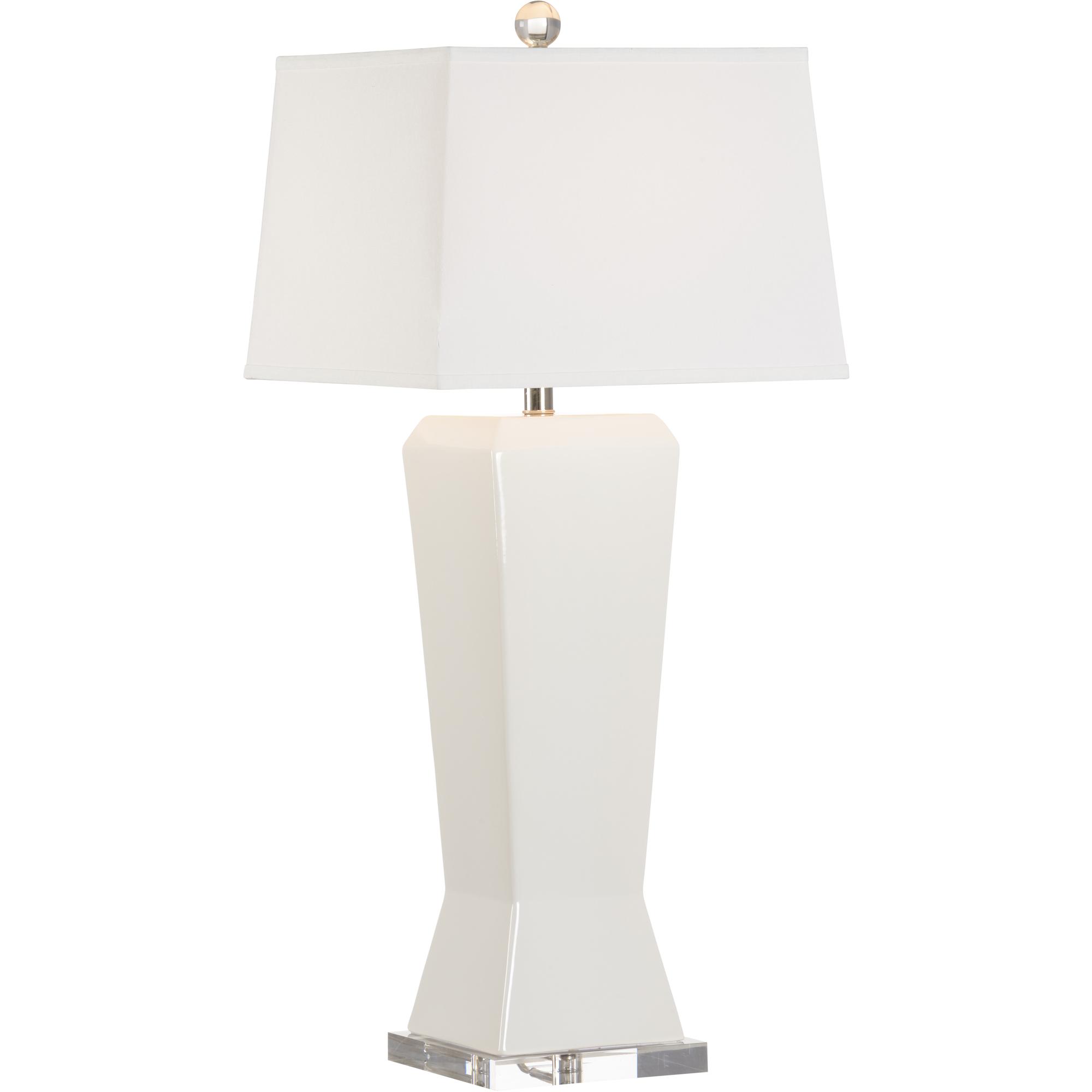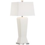 Handsome angular ceramic lamp in gentle white on a clear acrylic base. The epitome of tailored elegance. Designed by Jamie Merida.