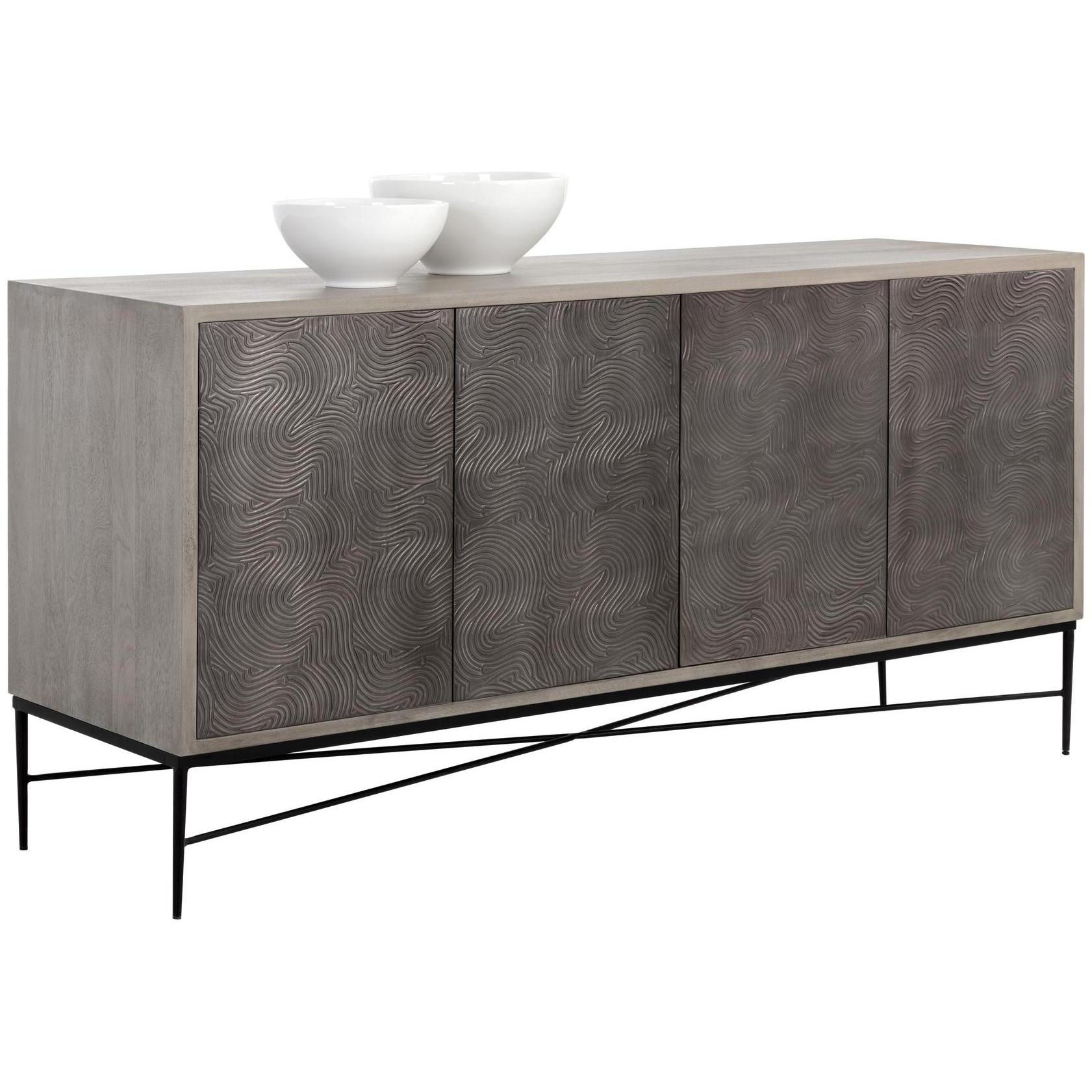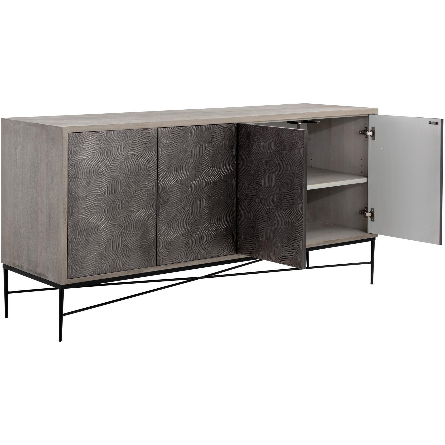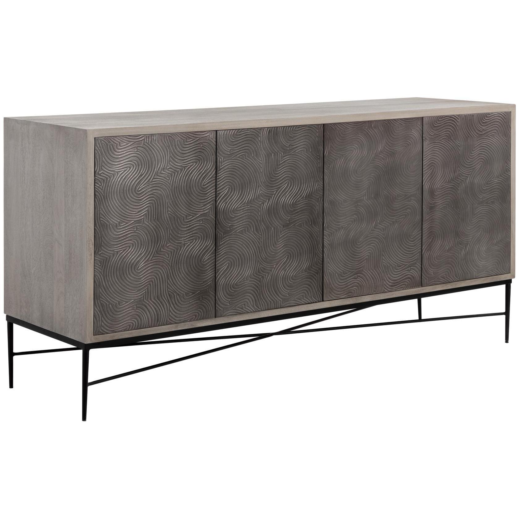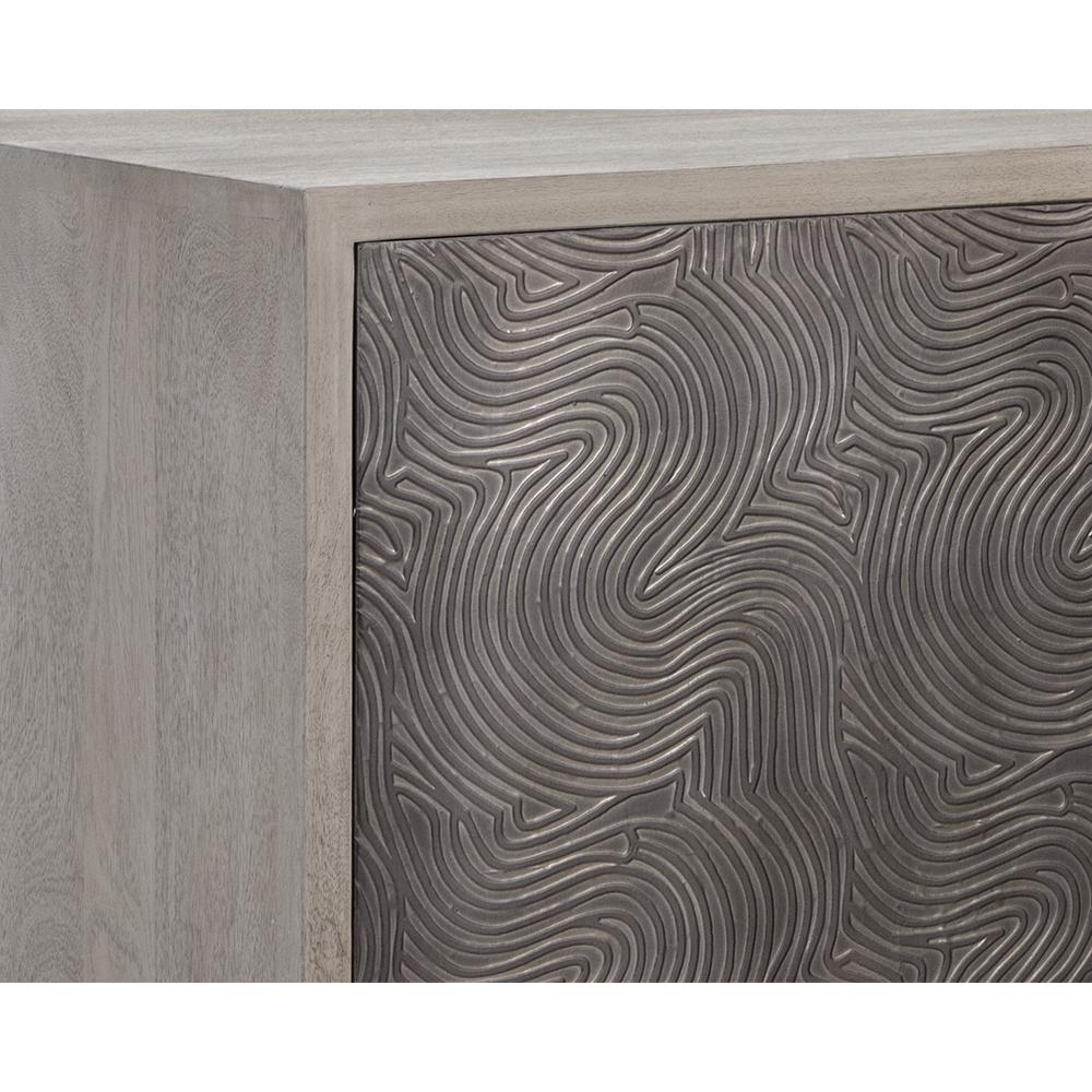 Infused with rich texture, this beautiful sideboard combines the timelessness of mid-century design with a modern twist. Features a solid mango wood frame with a grey finish and complemented with aluminum cladding on door fronts. Completed with a black iron base. Anti-tipping kit included. Made in India. With refined craftsmanship, this design was brought to life by skilled local artisans. By nature, these materials develop unique imperfections such as fissures, markings and colour variations for a truly one-of-a-kind piece. As wood is an organic, porous material, these pieces will contain natural variation of texture and may also exhibit fine indentations and cracks. Wood pieces will also display a disparity of colour and grain, and visible knots and burls that add to the character of each piece.