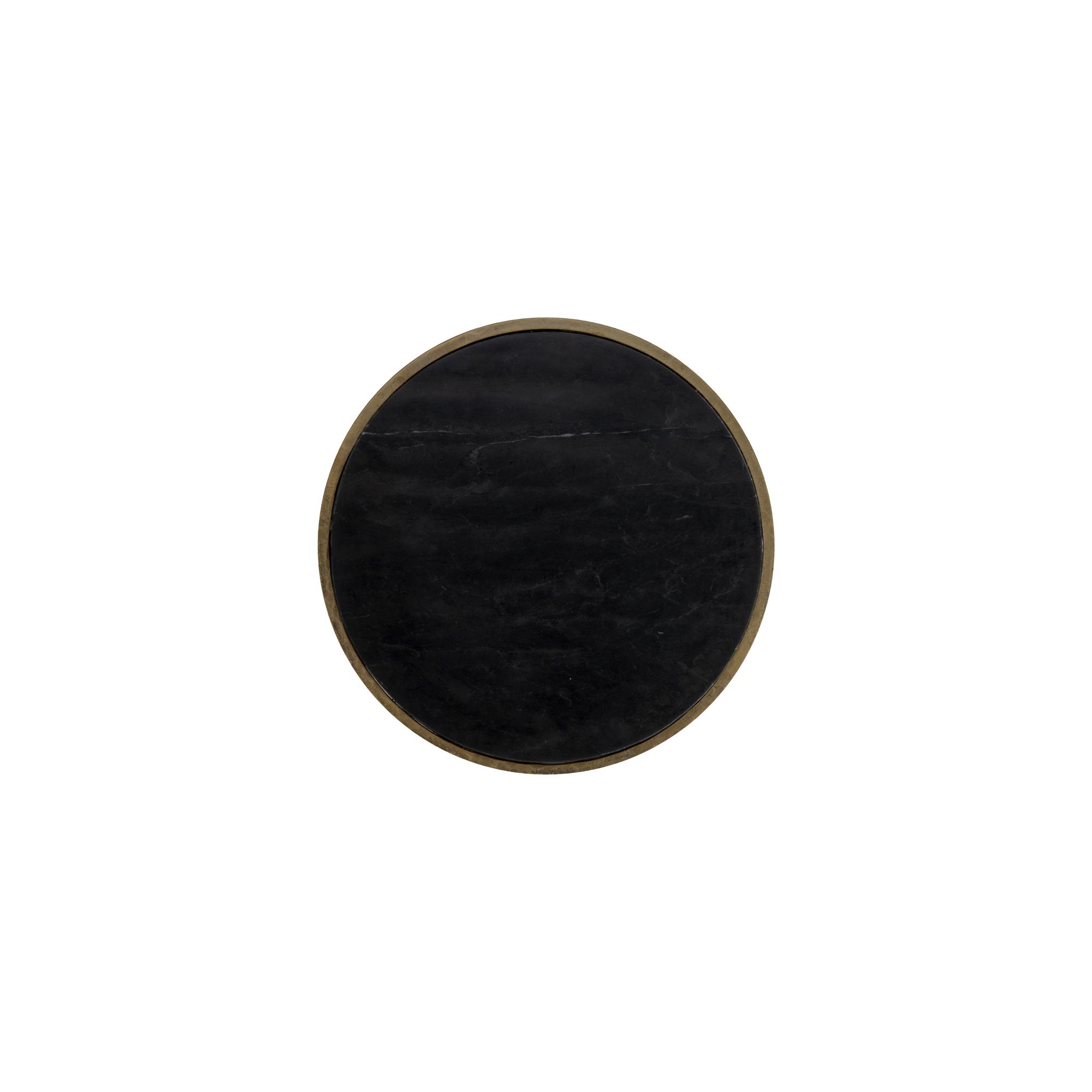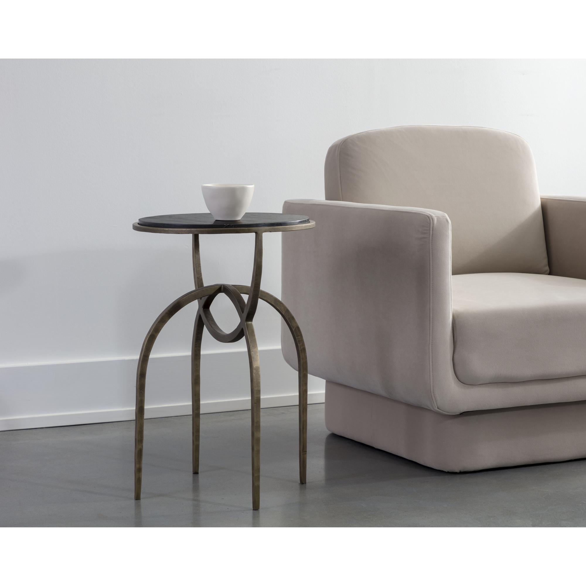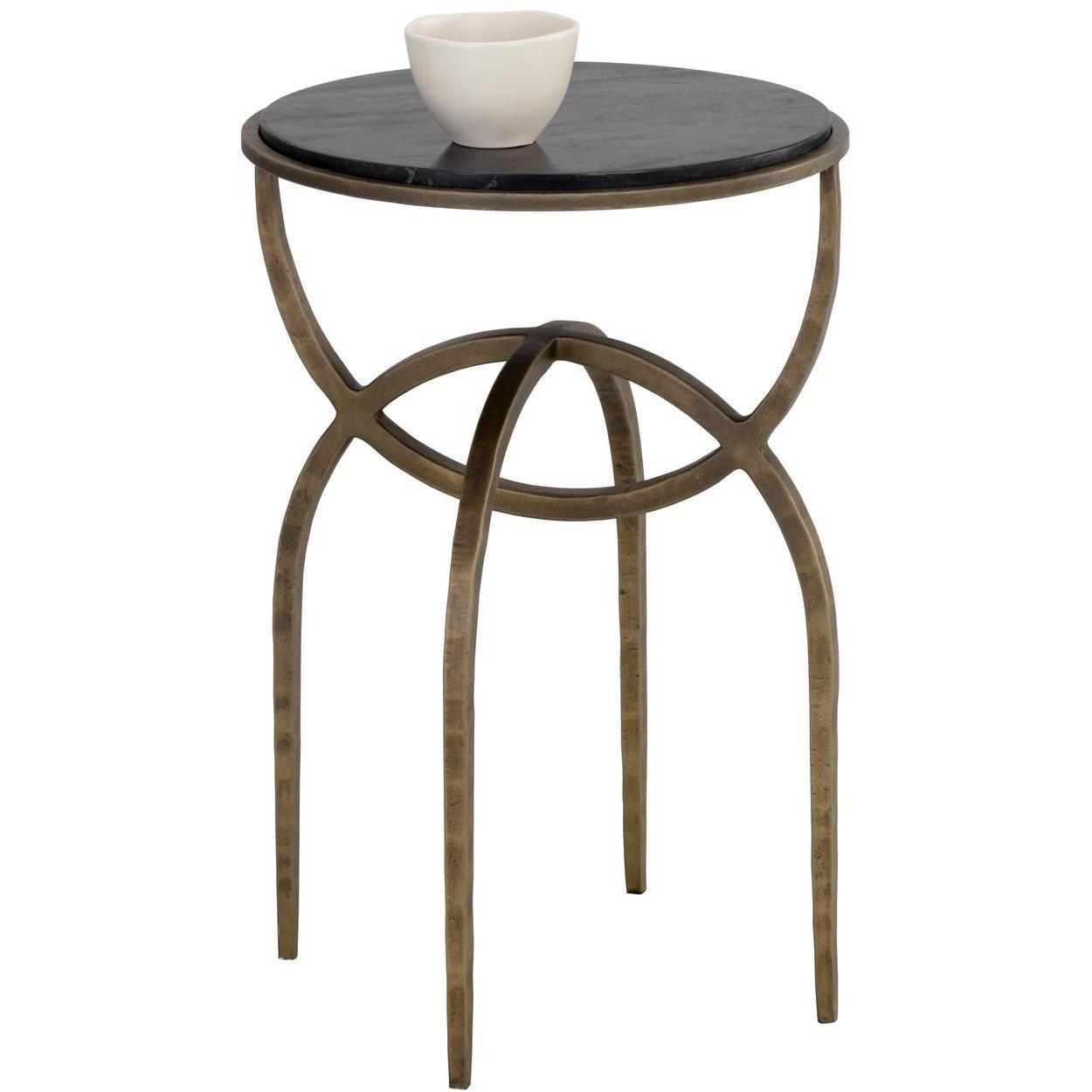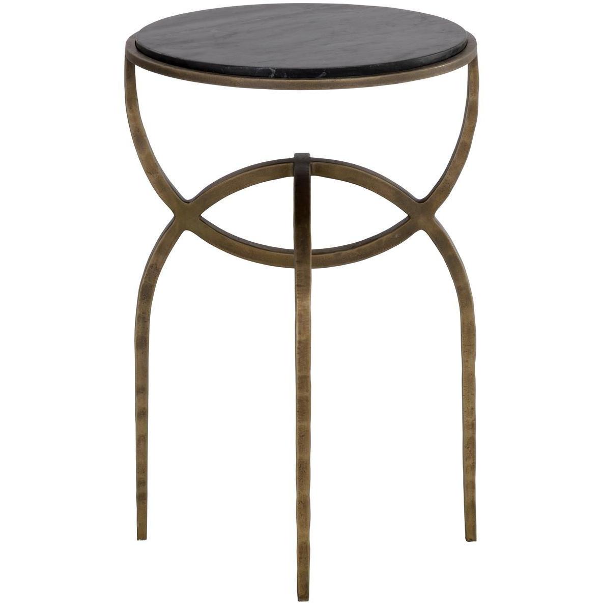 Eye-catching from all angles, the Alicent End Table is sure to draw attention. Features a round black marble table top with an antique brass iron base. Expertly crafted with an artful design. As marble is a natural material, unique veining, pitting, fissures, micro-cracks and colour variations are all characteristics that add to the uniqueness and beauty of each piece.