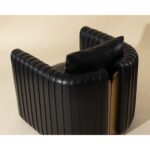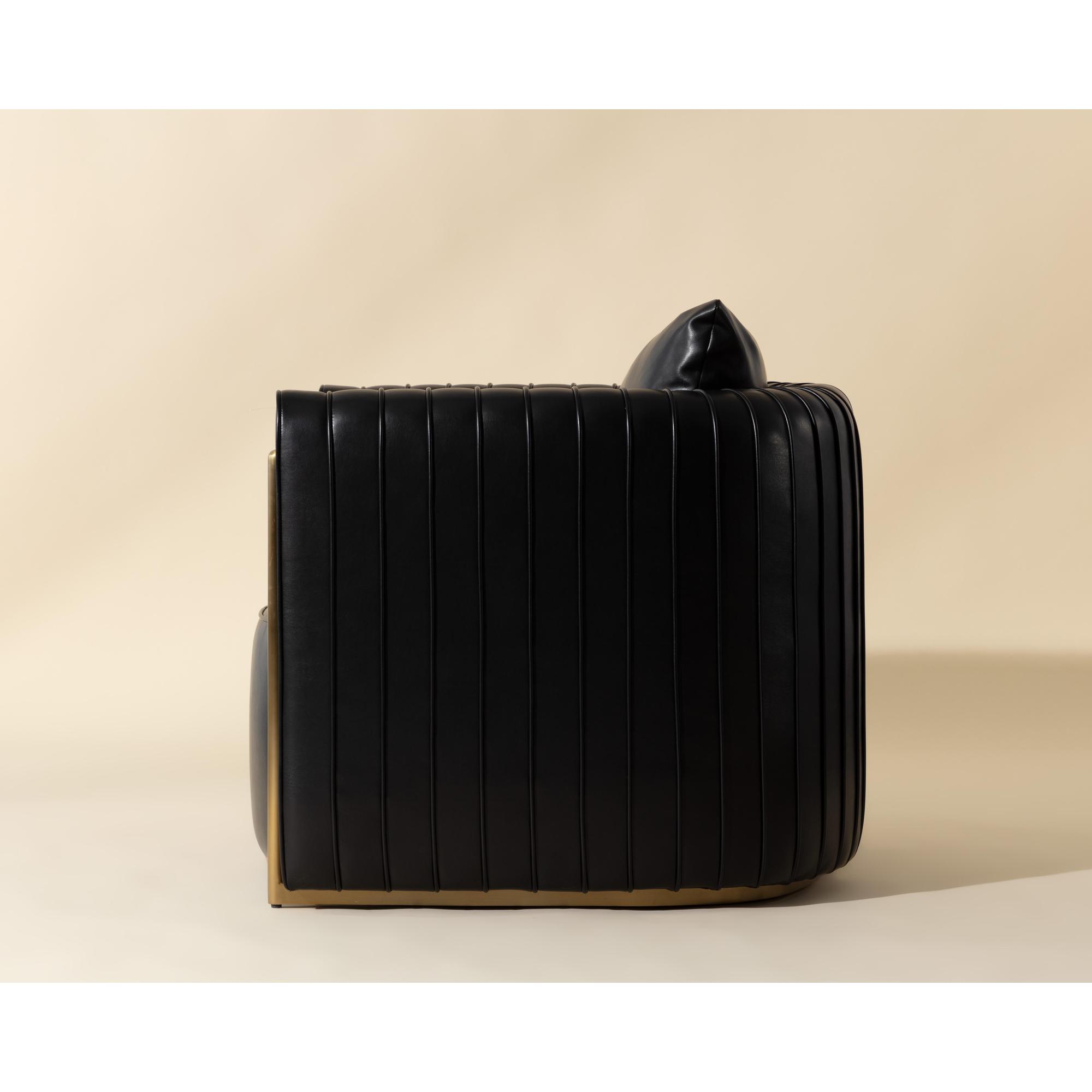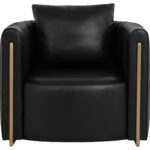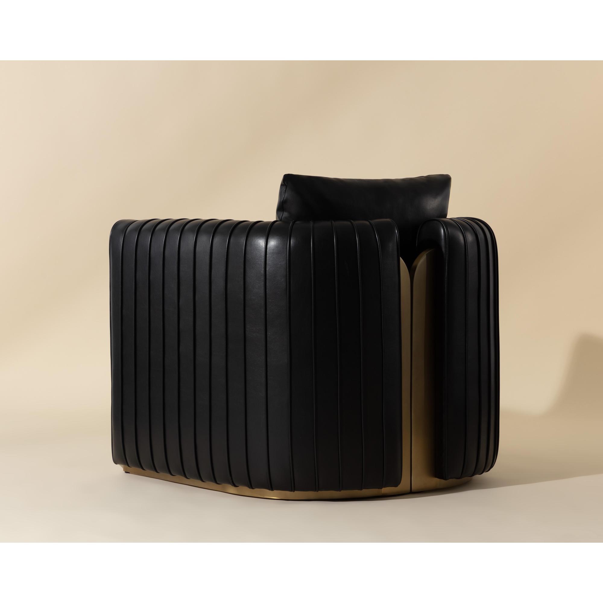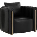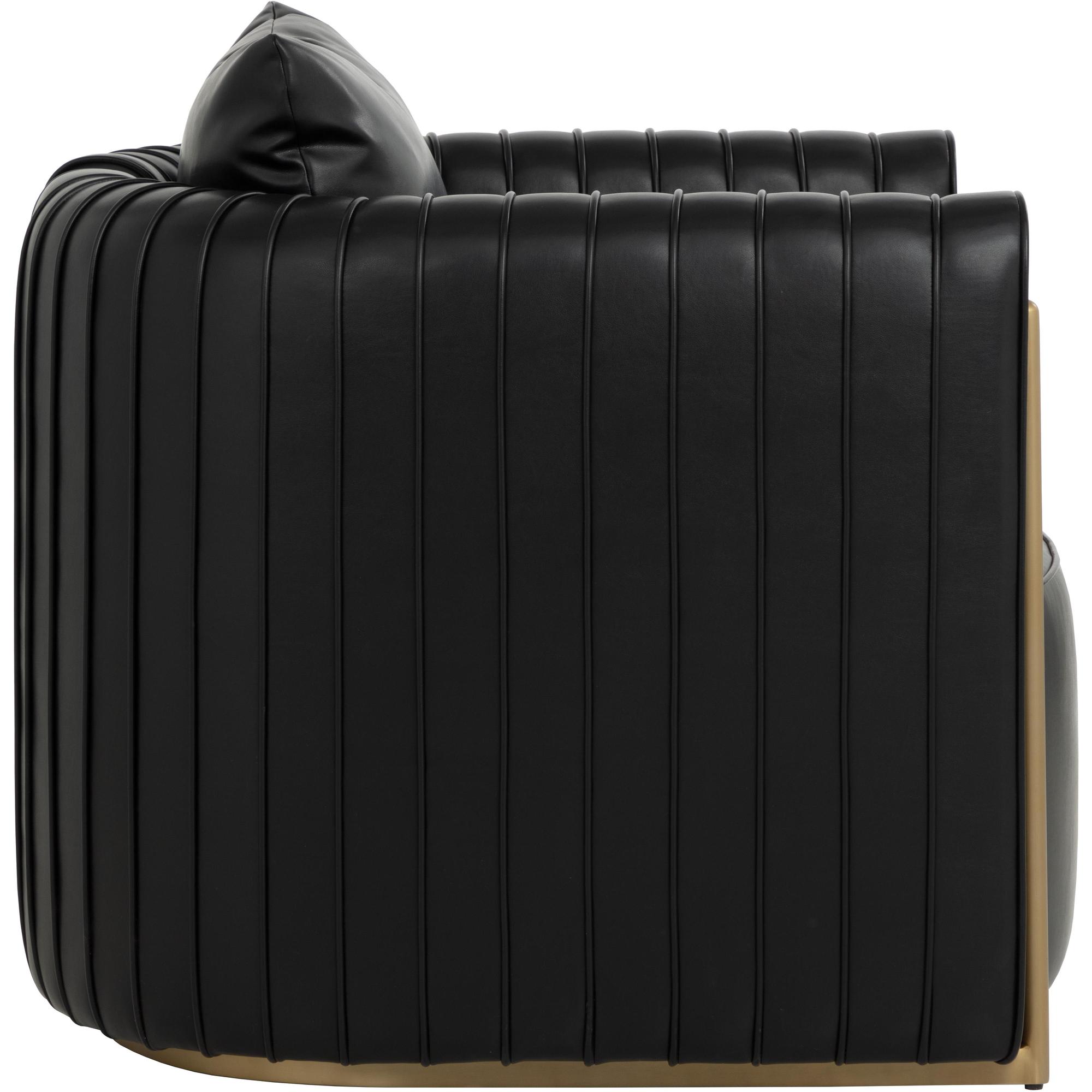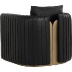 The Alix Lounge Chair is elevated comfort with a touch of glamour. A luxuriously rounded frame is upholstered in cantina black faux leather. Channeled piping and gold stainless steel detailing on the front and back add visual allure from every angle.