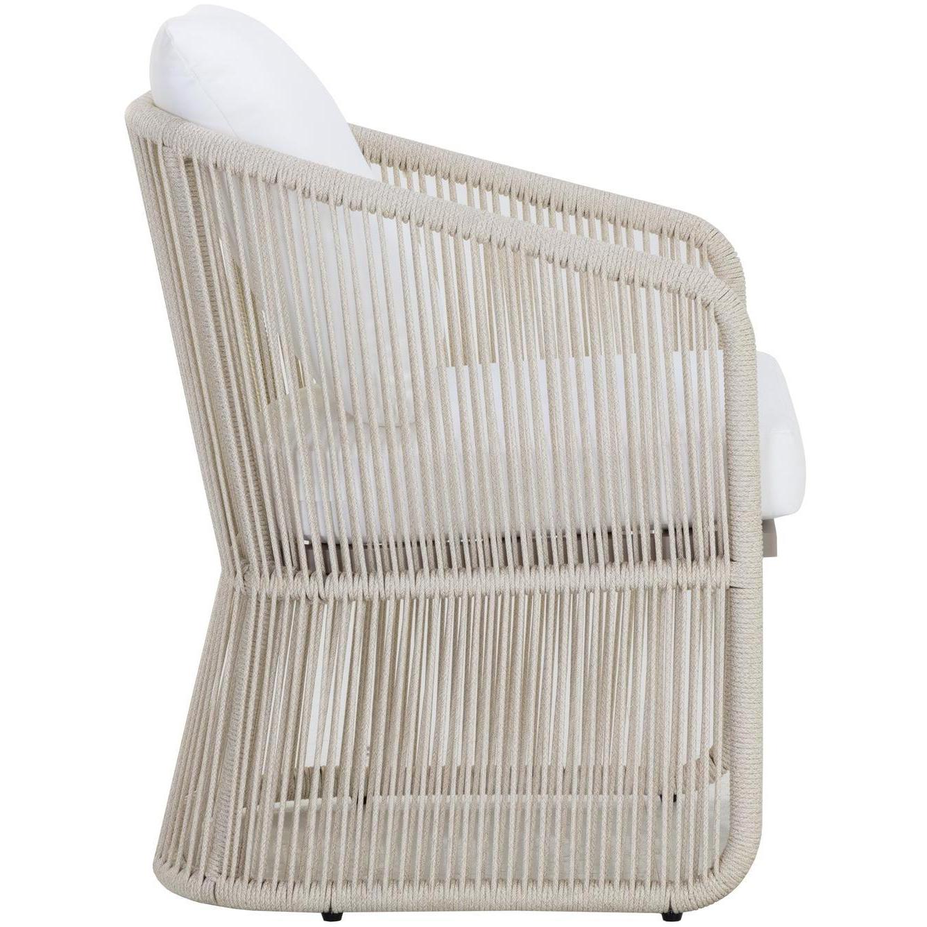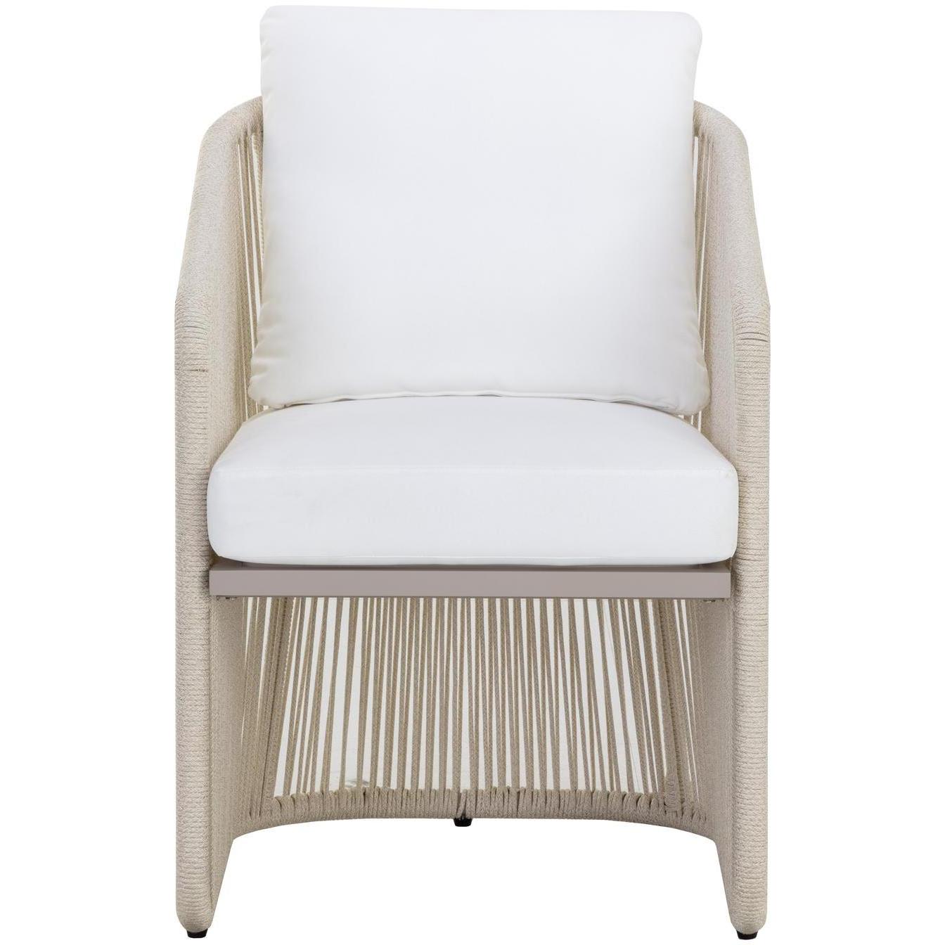 Introduce refined modern style outside with the impressive Allariz Dining Armchair. Upholstered in stinson white fabric with a powder-coated greige aluminum frame. Completed with cream rope weaving on the seat exterior.
