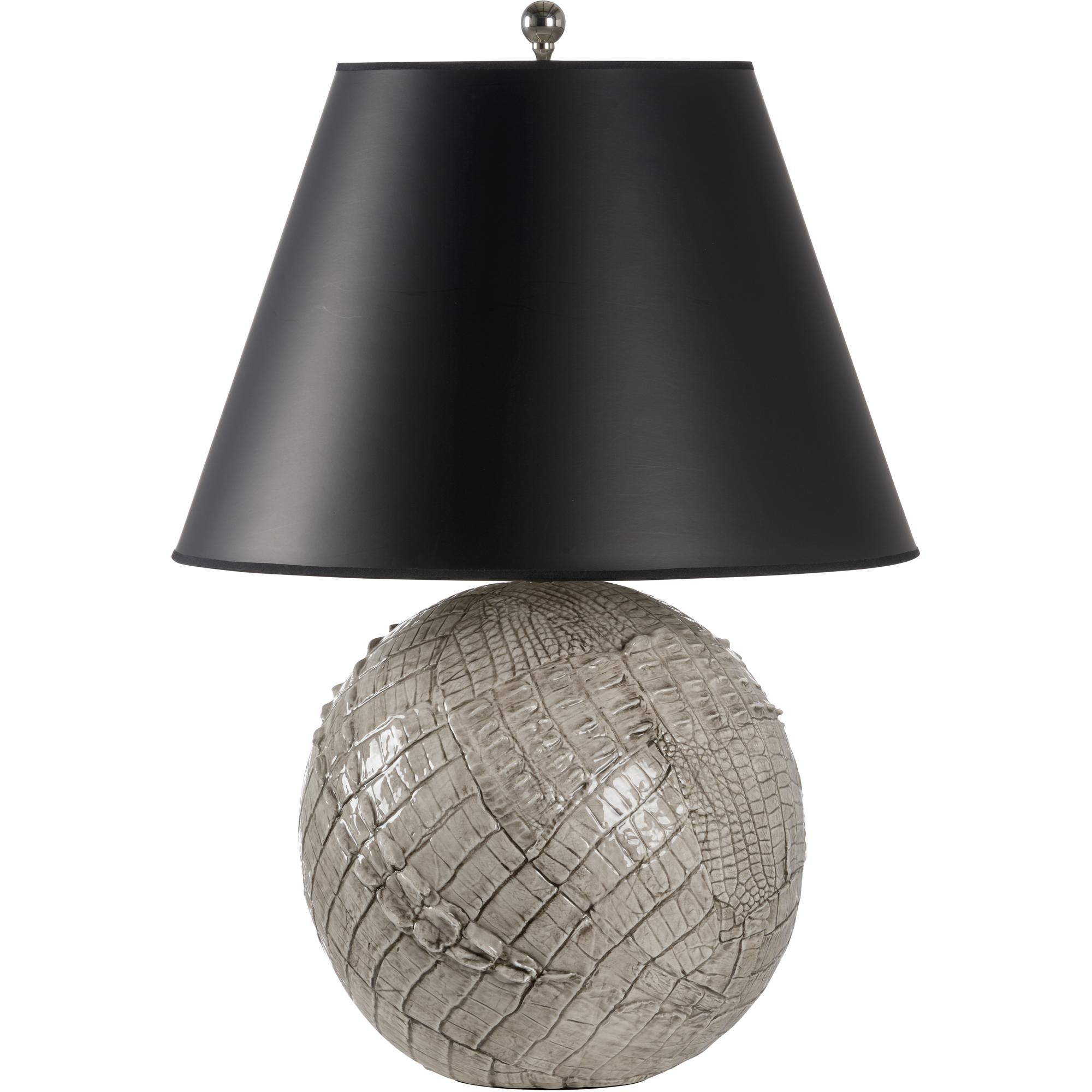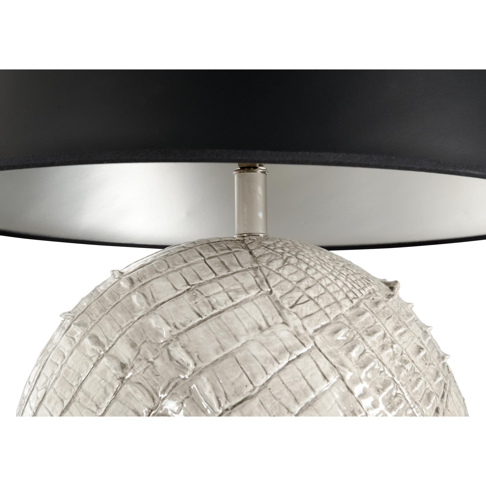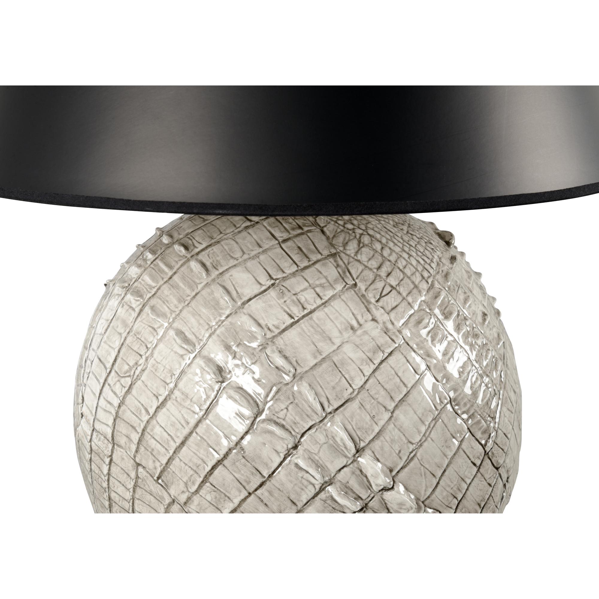 Hand crafted by Italian artisans, ally gray lamp will enhance your decor with its luxurious elegance. Featuring a detailed alligator skin texture highlighted with a glossy gray glaze, this exquisite accent lamp will catch the eye of your guests. The black empire shade directs light downward as it keeps the focus on the high quality ceramic.