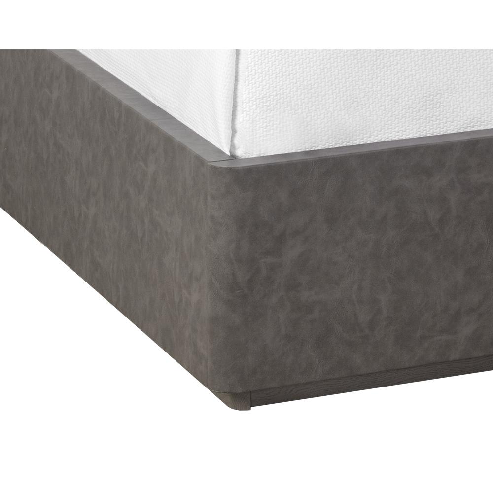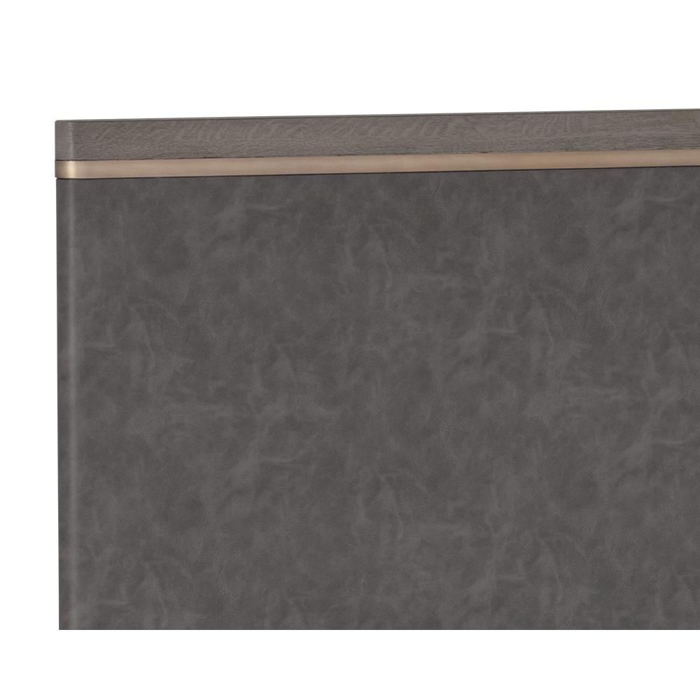 With clean lines and an alluring textured look, the Altman Bed reflects a refined expression of shape and form. Designed with a faux leather wrapped headboard. A dark grey oak veneer wood frame and a brass stainless steel inlay complete the look. No box spring is required and folding slats are included.