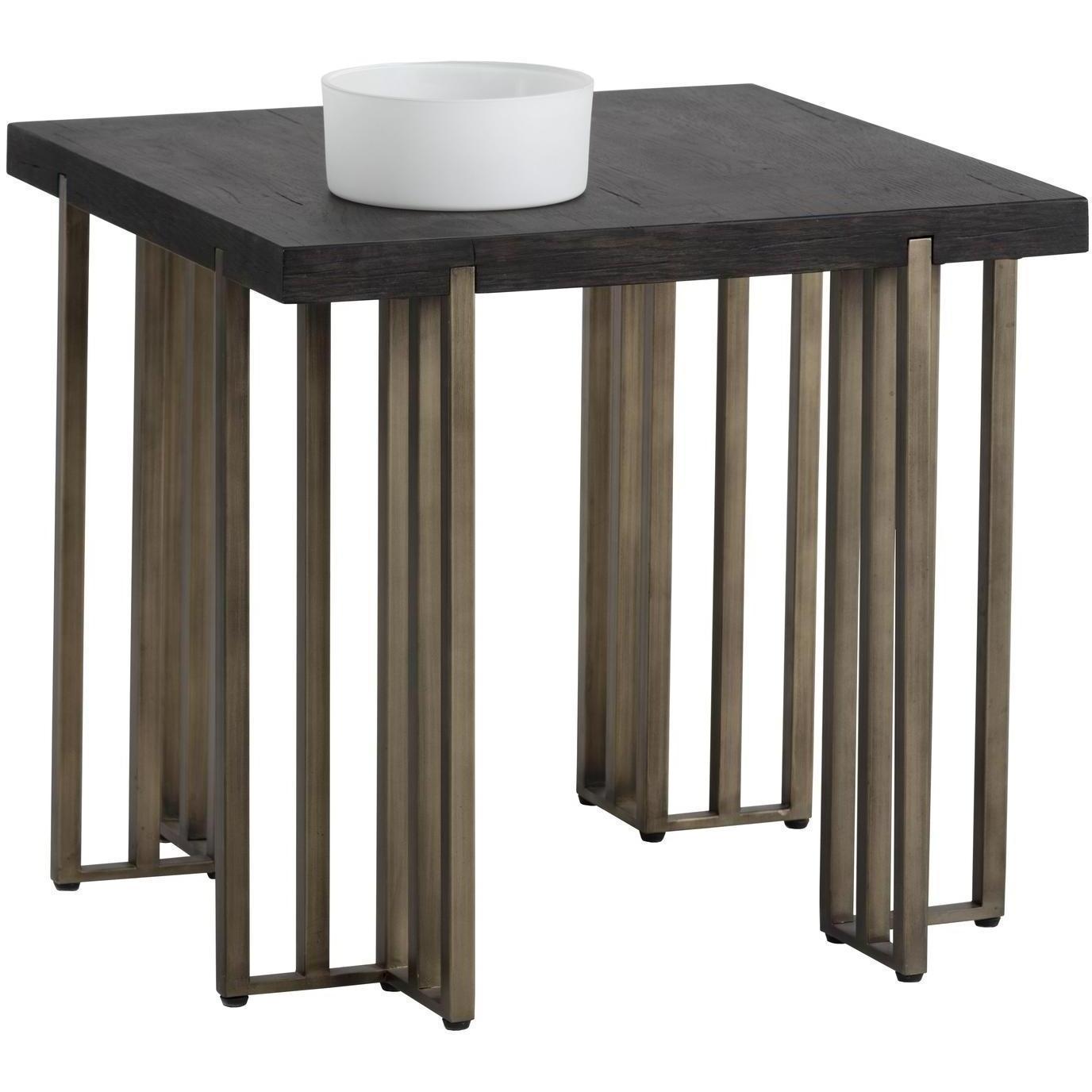 This square end table will bring warmth and style to various living and lounge spaces. The oak wood veneer top is complemented with architectural antique brass iron legs for added appeal. Cracks and deep lines in finish are part of the distressed look. Suitable for residential and contract environments.