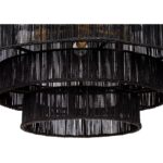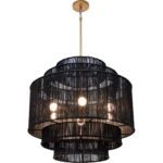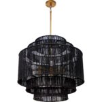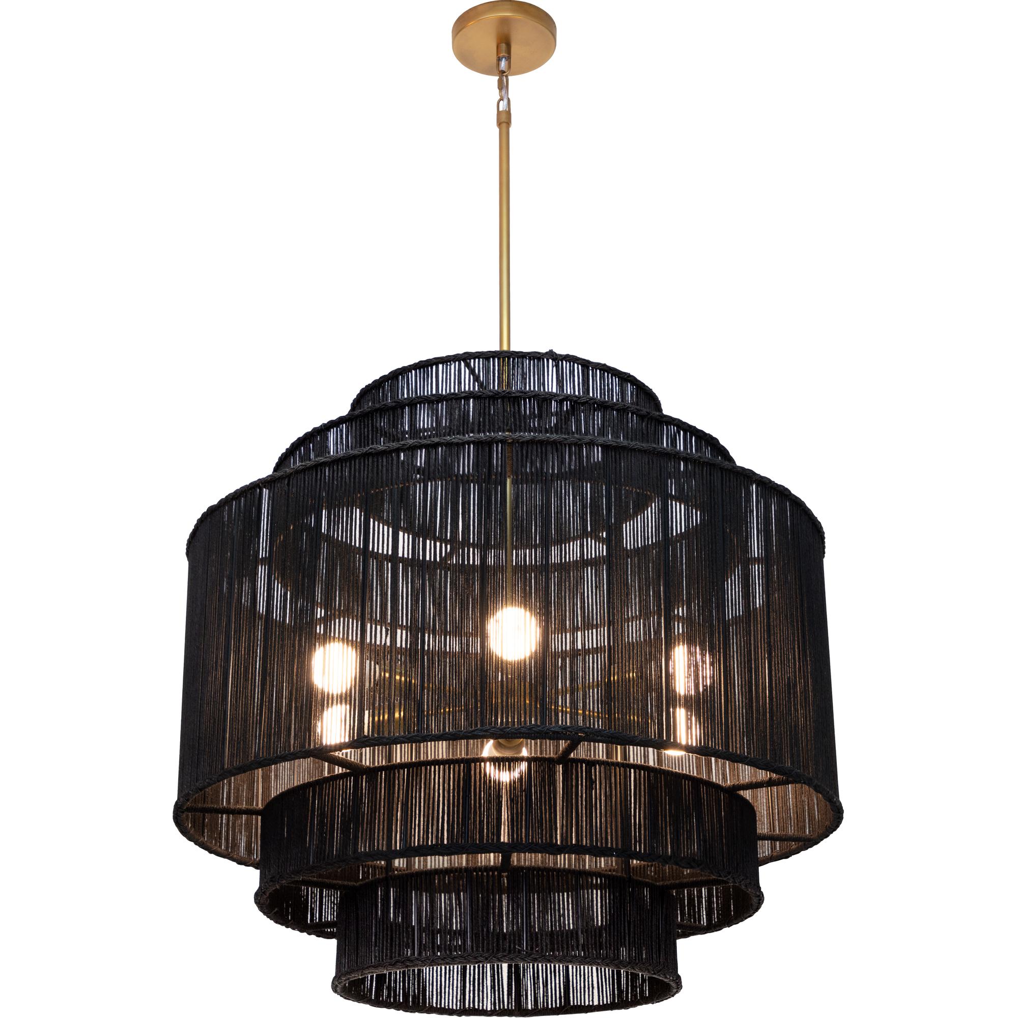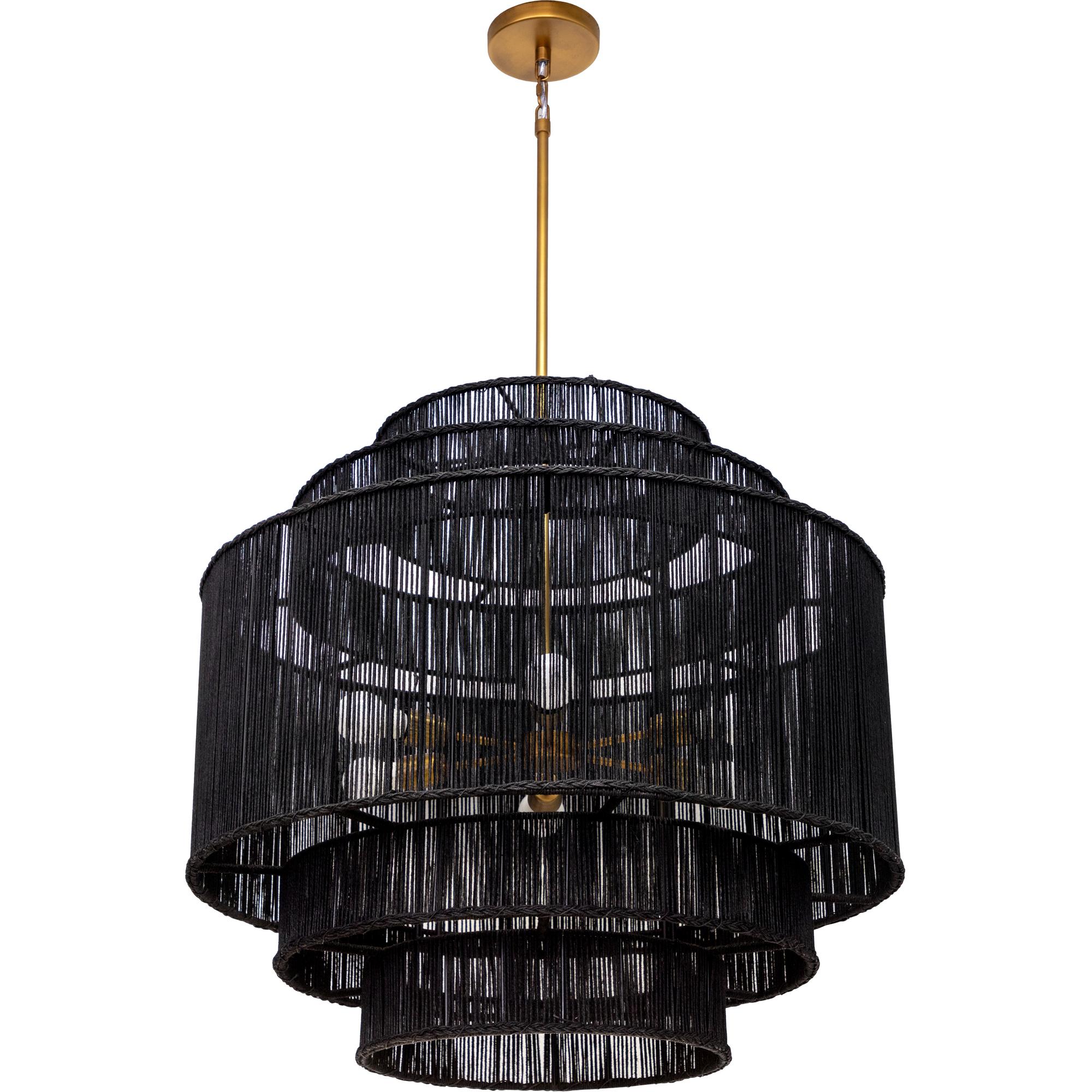 Each of the five tiers of the Alyssa Chandelier is carefully handwoven with black jute, highlighting its enduring beauty. Suspended from an antique brass rod, this chandelier brings a light airy look to any room it is placed in.