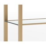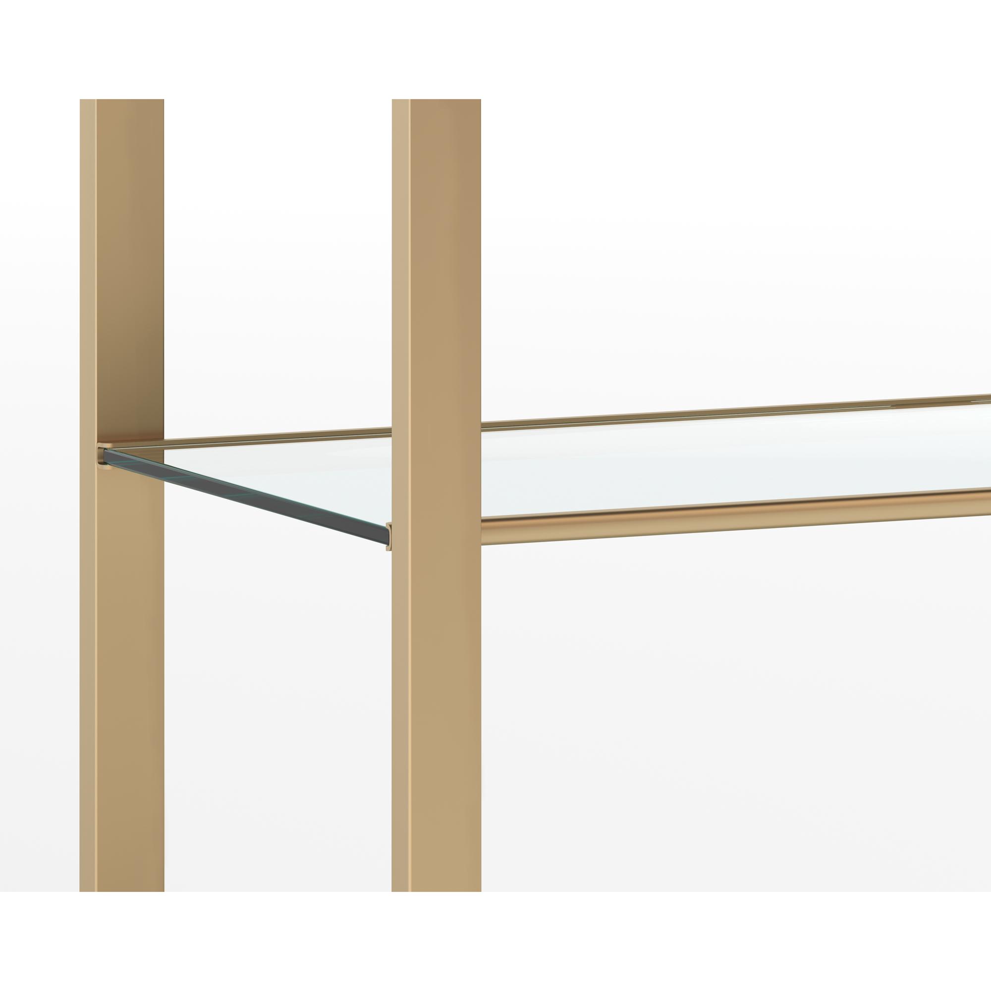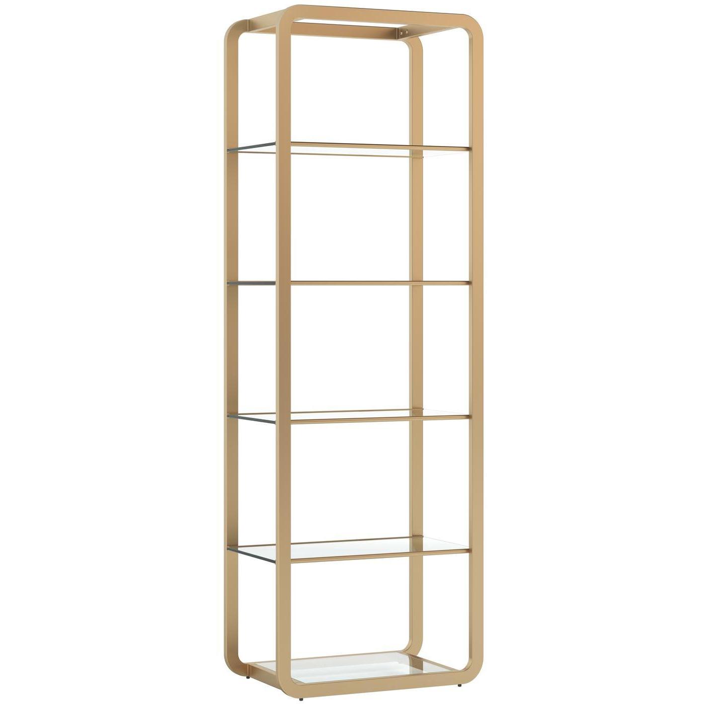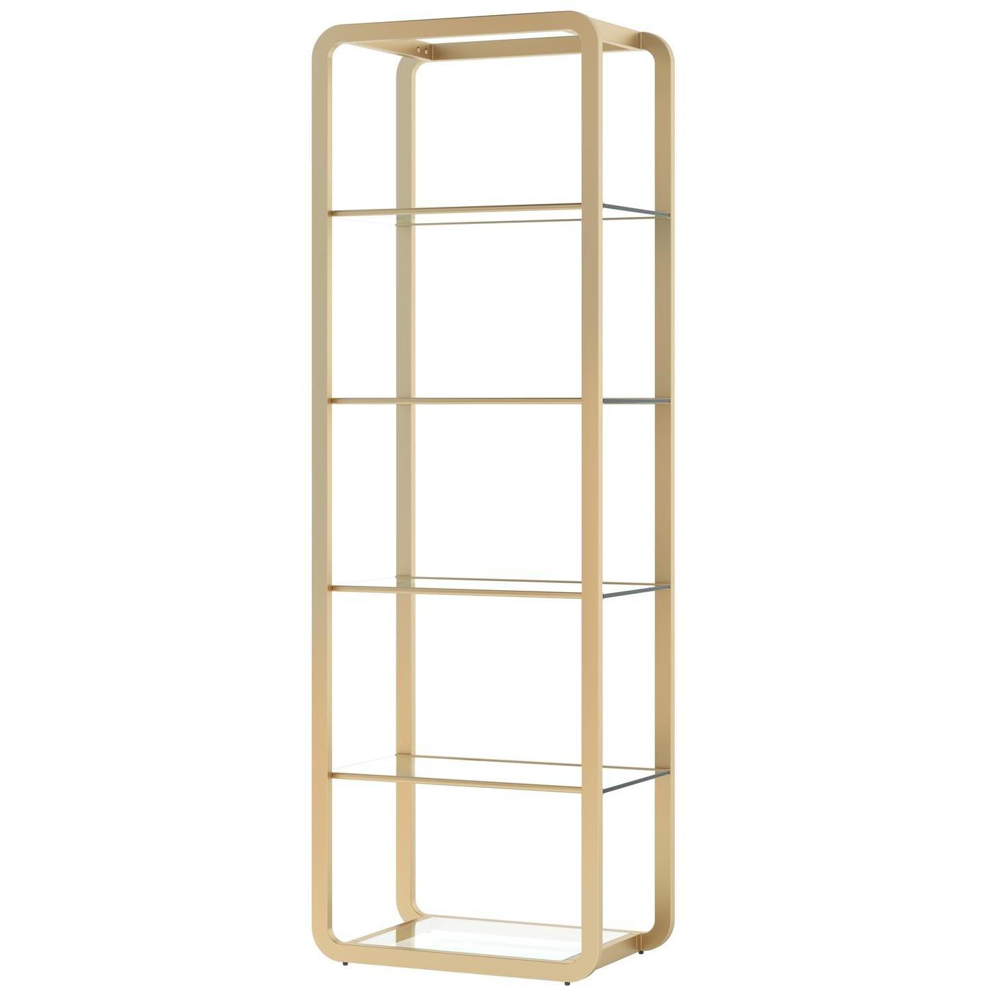 This small, modern bookcase will bring elegance and sophistication to home office, living, lounge spaces and more. Features four clear glass shelves and a mirrored bottom shelf for ample storage. The design also features a round edge frame in brushed gold stainless steel. Also available in a large version. Made in India: With refined craftsmanship, this design was brought to life by skilled local artisans. By nature, these materials develop unique imperfections such as fissures, markings and colour variations for a truly one-of-a-kind piece.