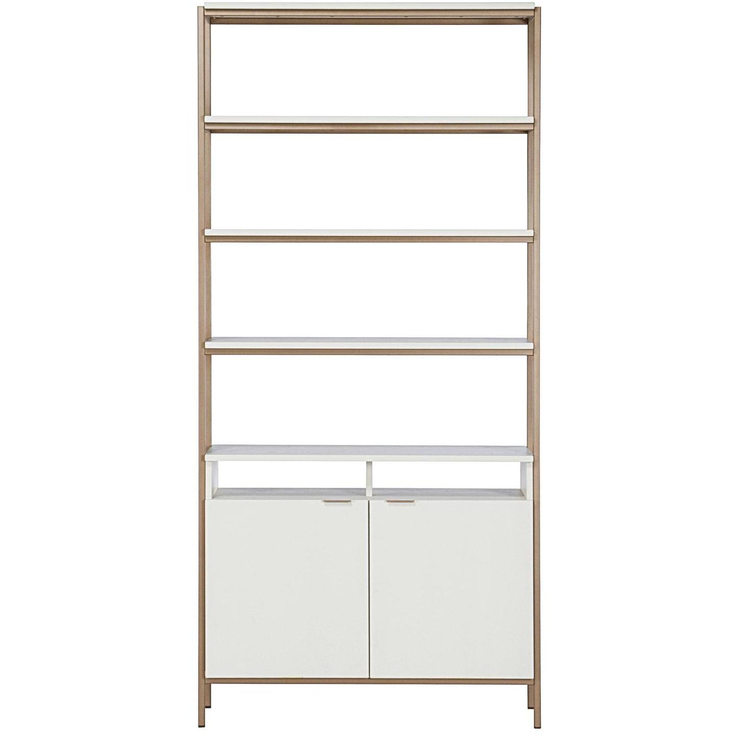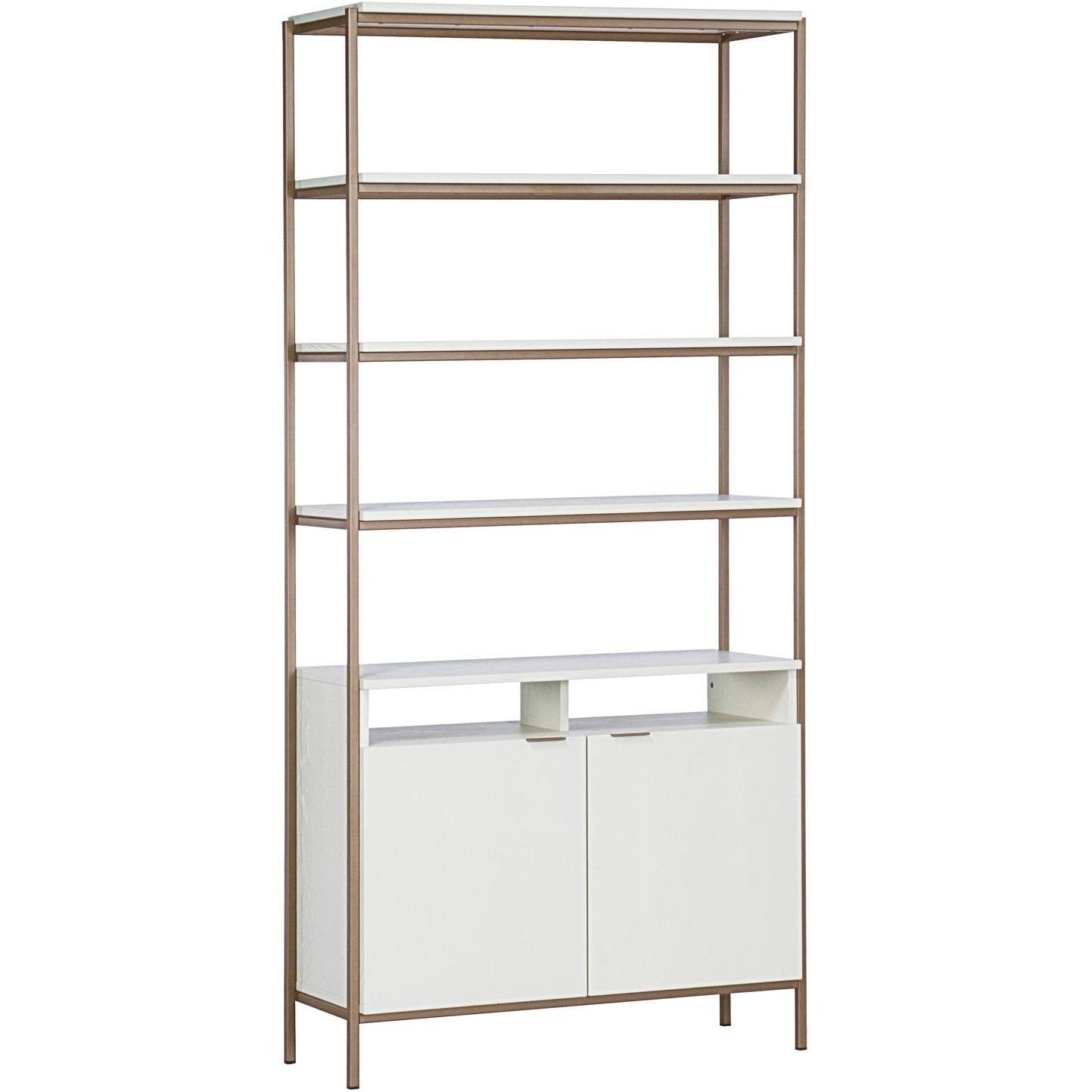Crafted in Indonesia, this beautiful large bookcase will bring modern style and elegance to living, lounge, dining and home office spaces. Designed with cream finished oak wood and a champagne gold iron frame. Features five shelves and two cabinets for added style and function. Coordinate with the Ambrose modular wall desk, and large and small bookcases for a space saving design. Media console and cabinet also available. As wood is an organic, porous material, these pieces will contain natural variation of texture and may also exhibit fine indentations and cracks. Wood pieces will also display a disparity of colour and grain, and visible knots and burls that add to the character of each piece.