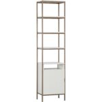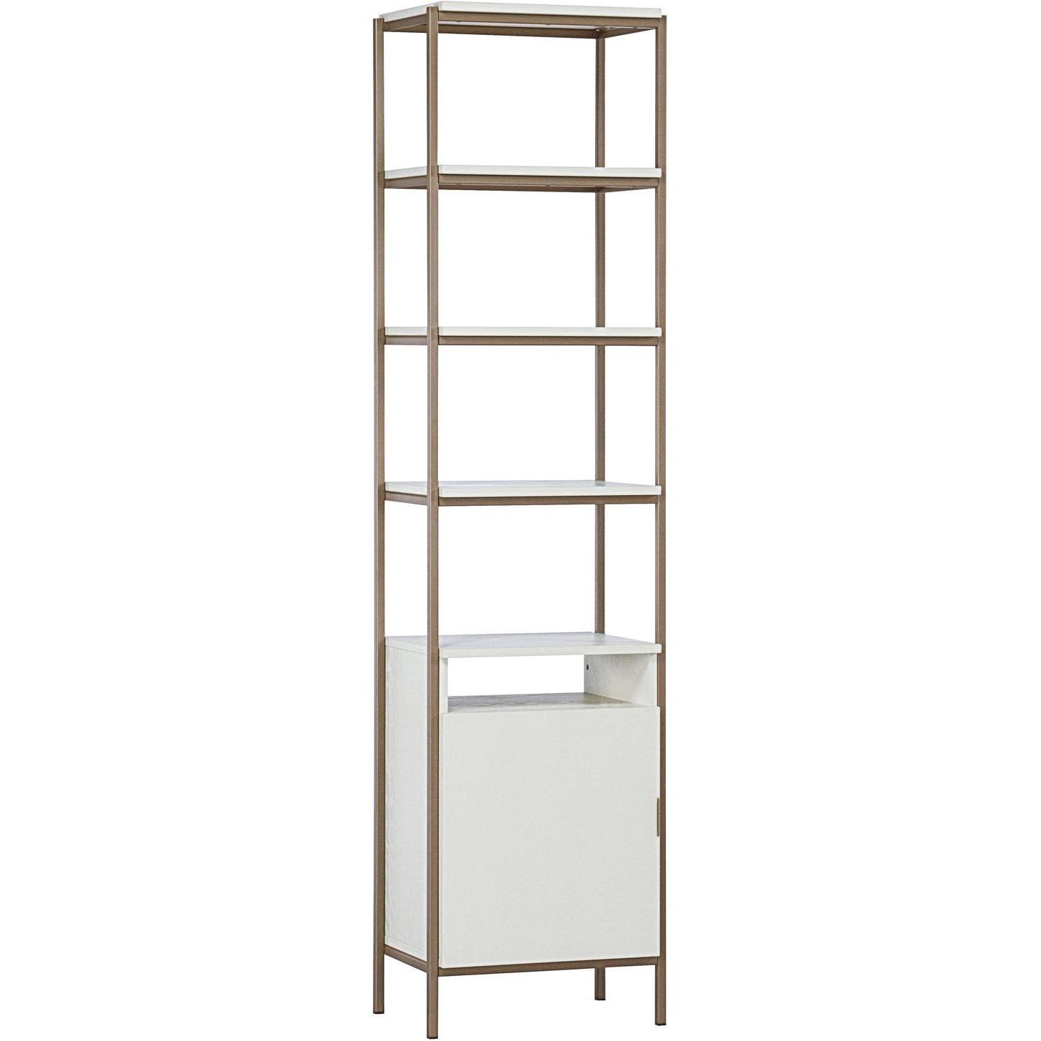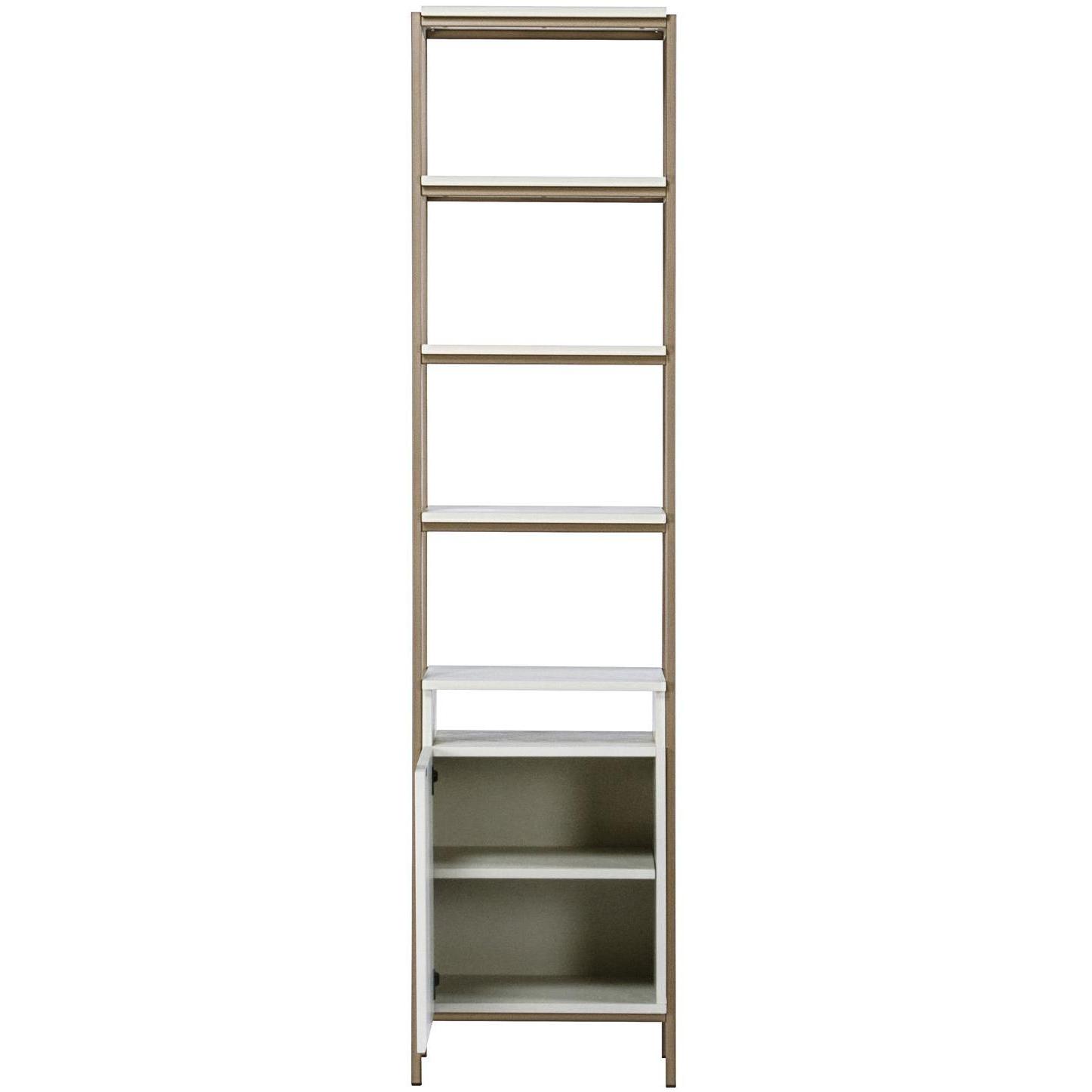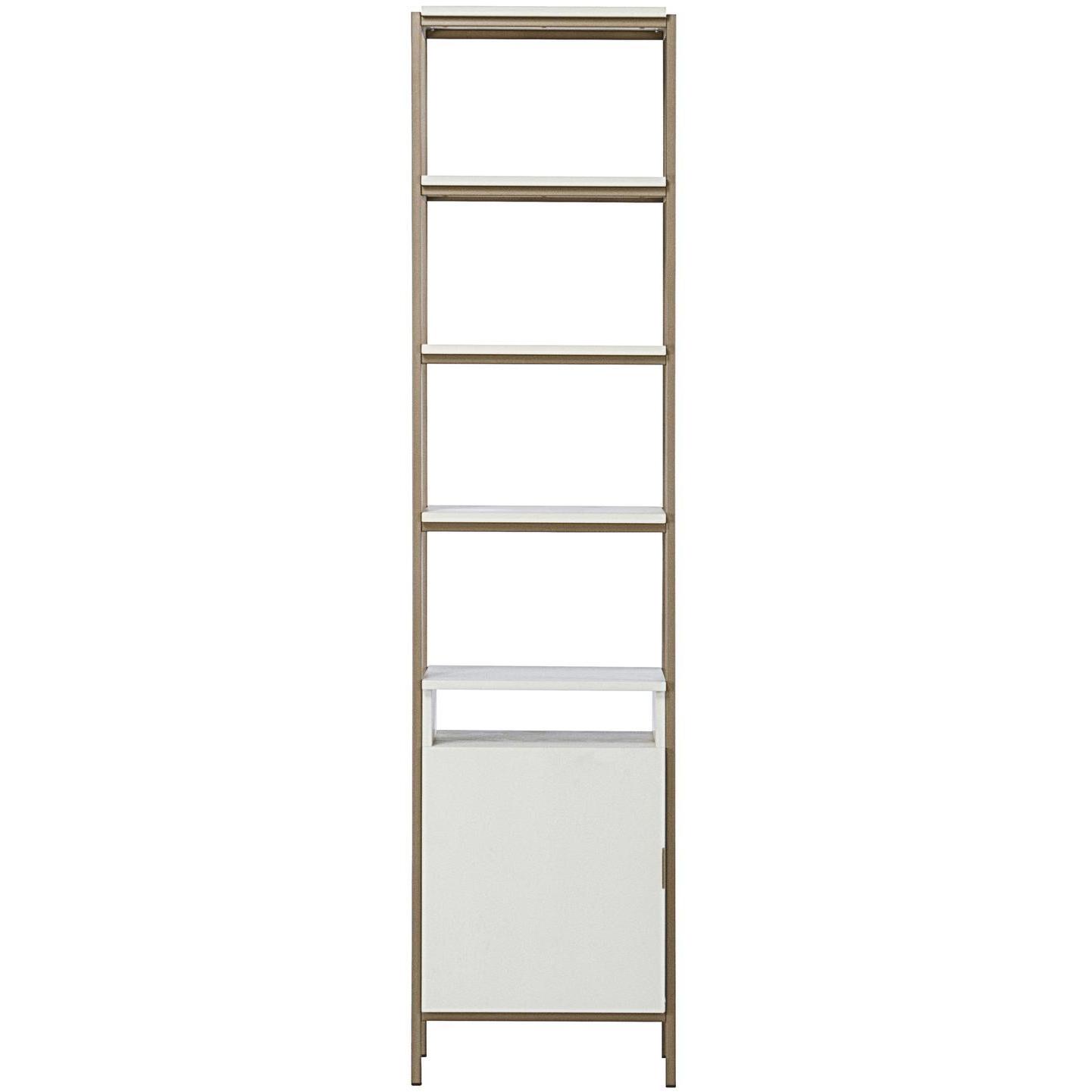 Crafted in Indonesia, this beautiful small bookcase will bring modern style and elegance to living, lounge, dining and home office spaces. Designed with cream finished oak wood and a champagne gold iron frame. Features five shelves and a single cabinet for added style and function. Coordinate with the Ambrose modular wall desk, and large and small bookcases for a space saving design. Media console and cabinet also available. As wood is an organic, porous material, these pieces will contain natural variation of texture and may also exhibit fine indentations and cracks. Wood pieces will also display a disparity of colour and grain, and visible knots and burls that add to the character of each piece.