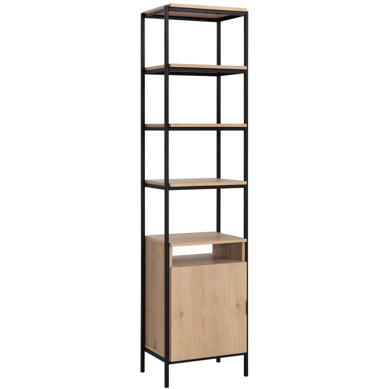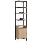 Crafted in Indonesia, this beautiful small bookcase will bring modern style and elegance to living, lounge, dining and home office spaces. Designed with naturally rustic finished oak wood and a matte black iron frame. Features five shelves and a single cabinet for added style and function. Coordinate with the Ambrose modular wall desk, and large and small bookcases for a space saving design. Media console and cabinet also available. As wood is an organic, porous material, these pieces will contain natural variation of texture and may also exhibit fine indentations and cracks. Wood pieces will also display a disparity of colour and grain, and visible knots and burls that add to the character of each piece.