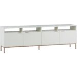 Crafted in Indonesia, this beautiful media console and cabinet will bring modern style and elegance to living, lounge and home office spaces. Designed with cream finished oak wood and a champagne gold iron frame. Features four cabinets for added style and function. Coordinate with the Ambrose modular wall desk, and large and small bookcases for a space saving design. As wood is an organic, porous material, these pieces will contain natural variation of texture and may also exhibit fine indentations and cracks. Wood pieces will also display a disparity of colour and grain, and visible knots and burls that add to the character of each piece.