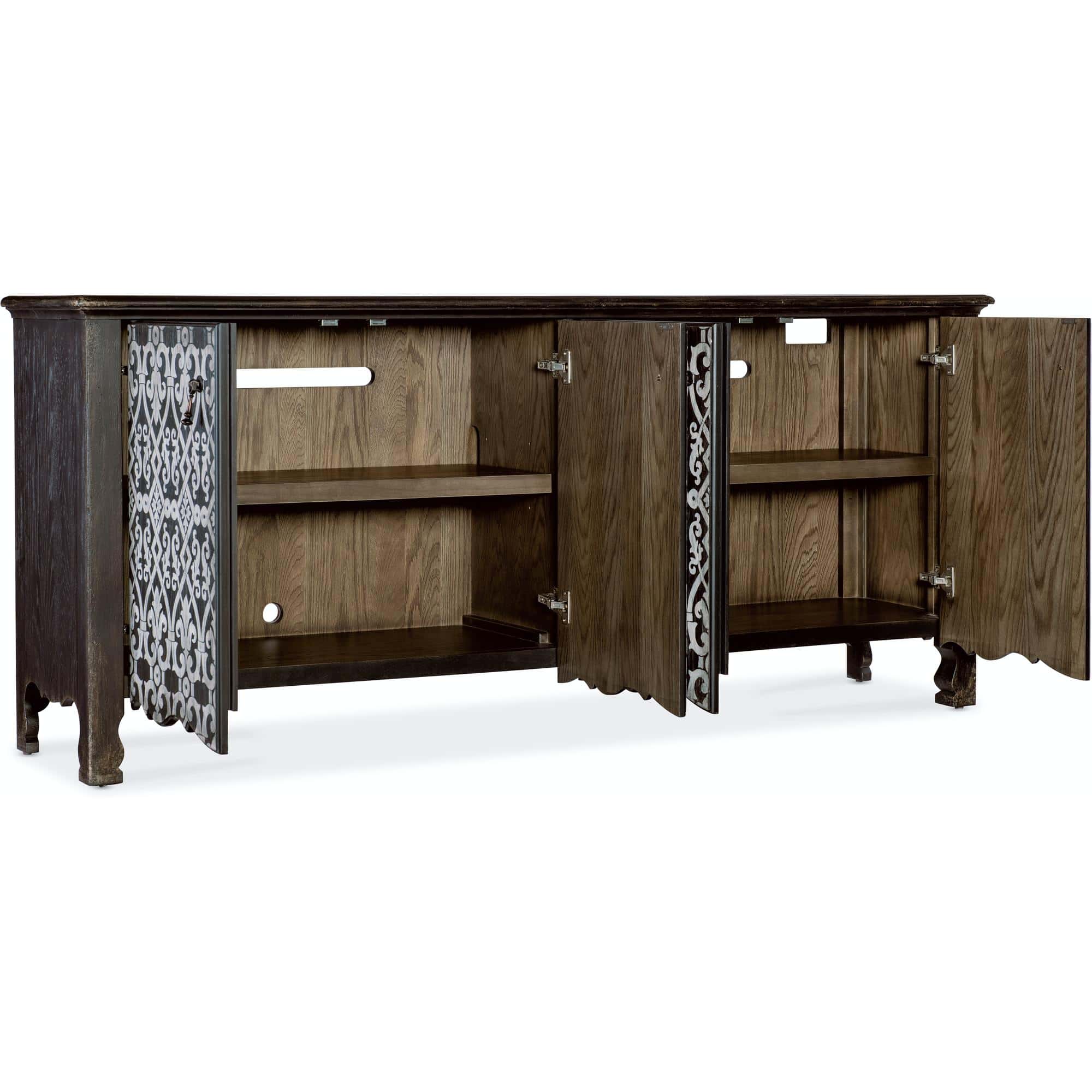 Finish: The Americana Molasses finish captures the essence of a well-loved heirloom, passed down through generations. The deep, dark tone over cathedral oak veneers add warmth, while the variations in color reveal the natural beauty of the wood beneath. The credenza also features a white finished pattern on door fronts. Honey finish on interior. Metal alloy tear-drop pulls in an antique bronze finish.
