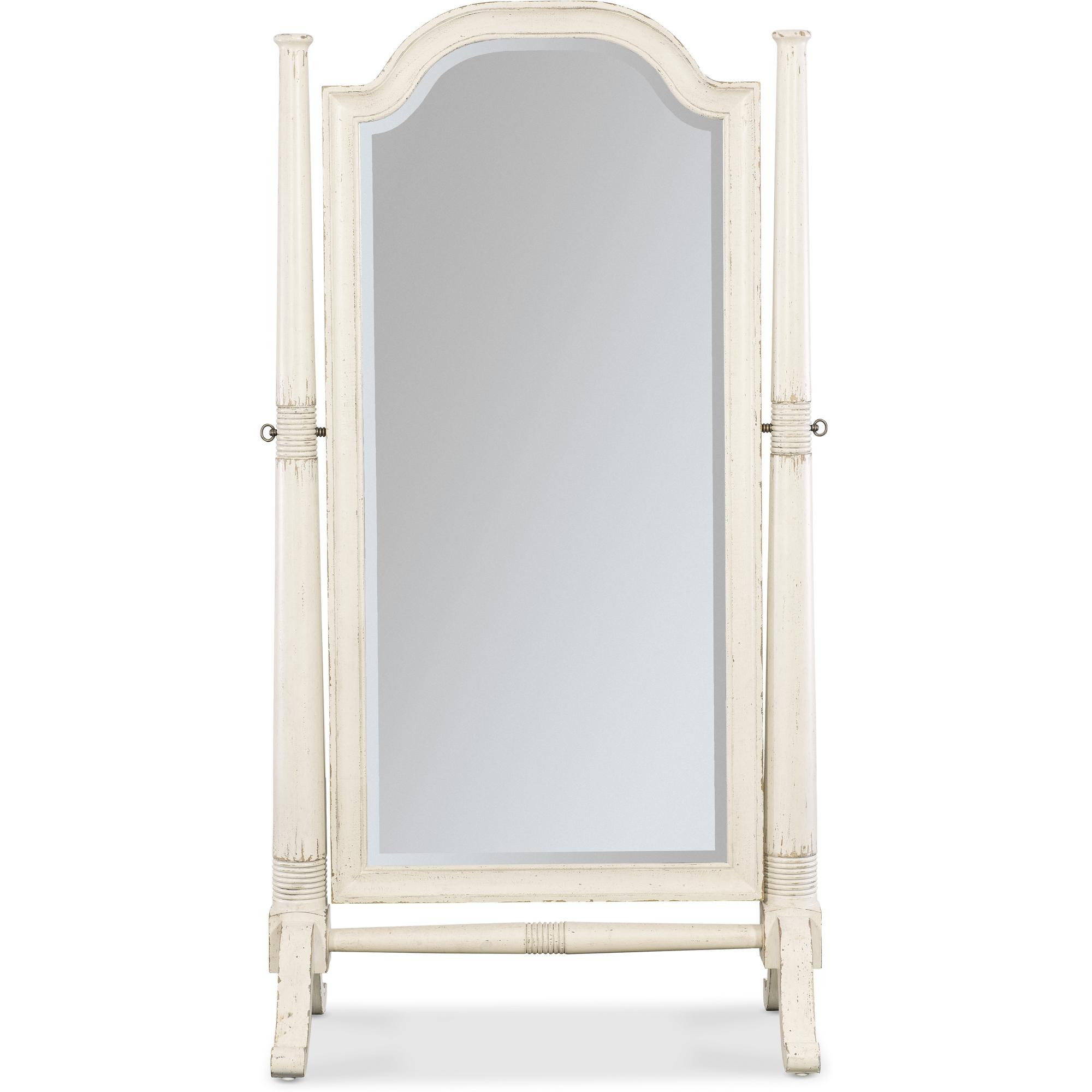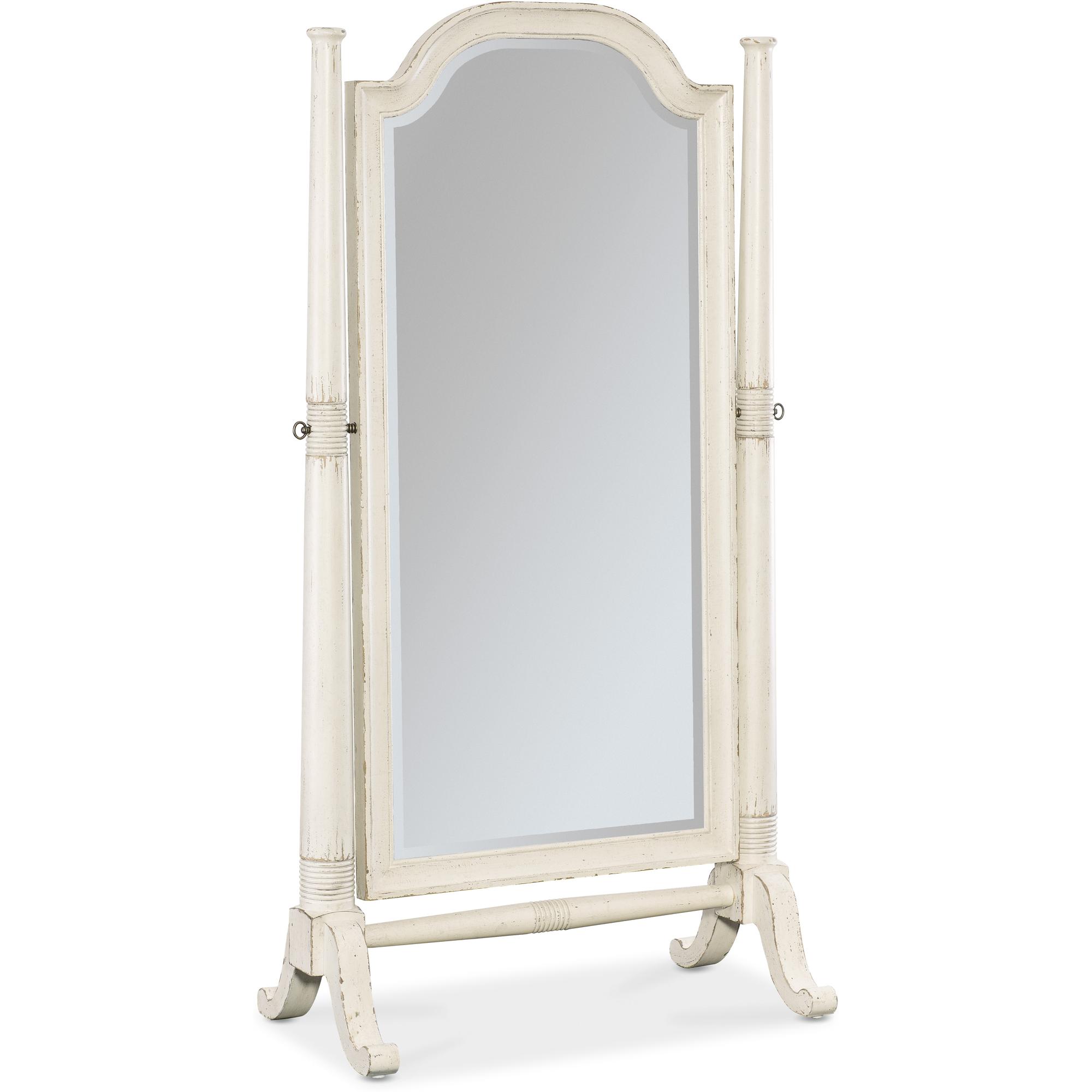 Features: Tilting mirror Beveled mirror glass Carved accents on posts and stretcher Levelers