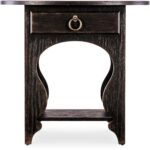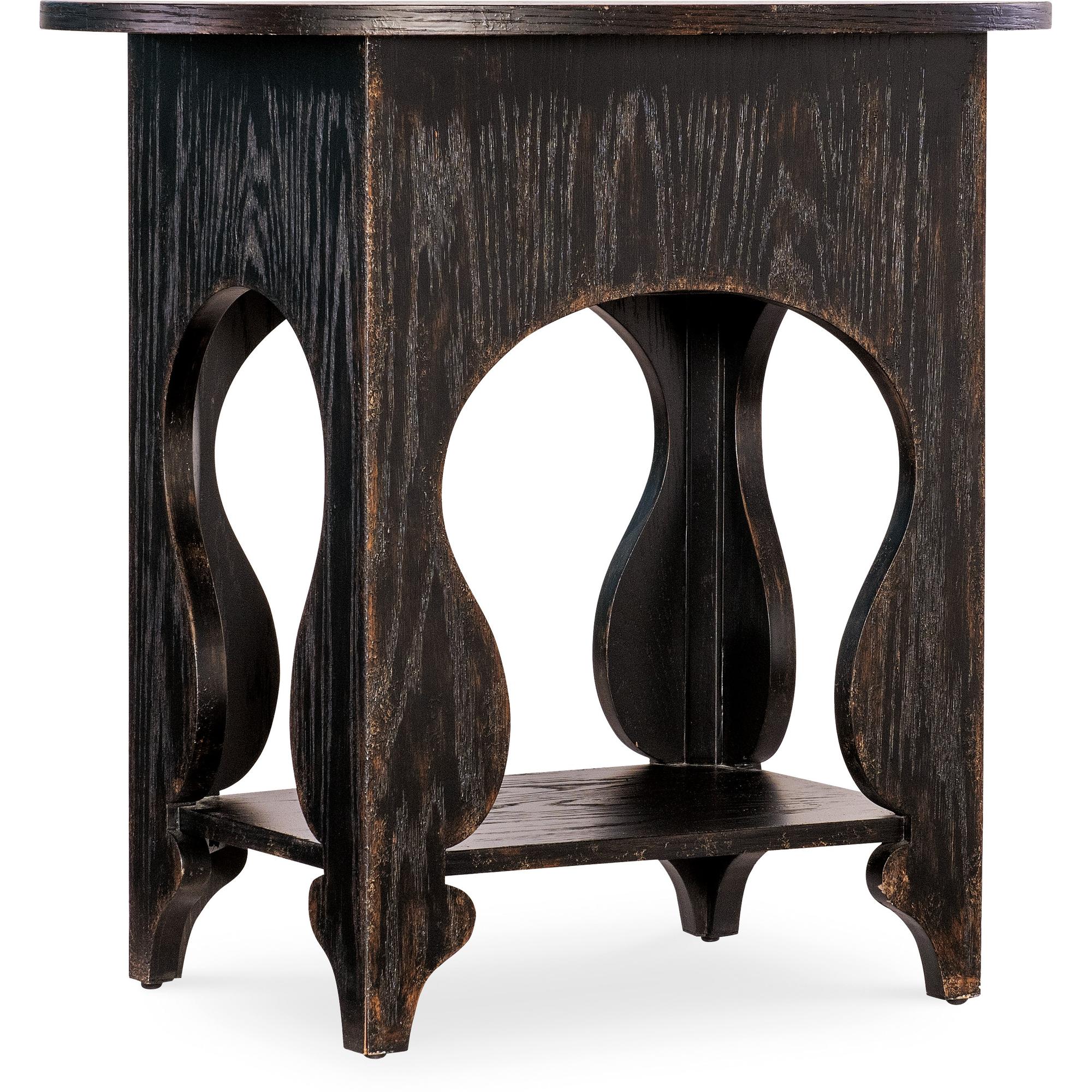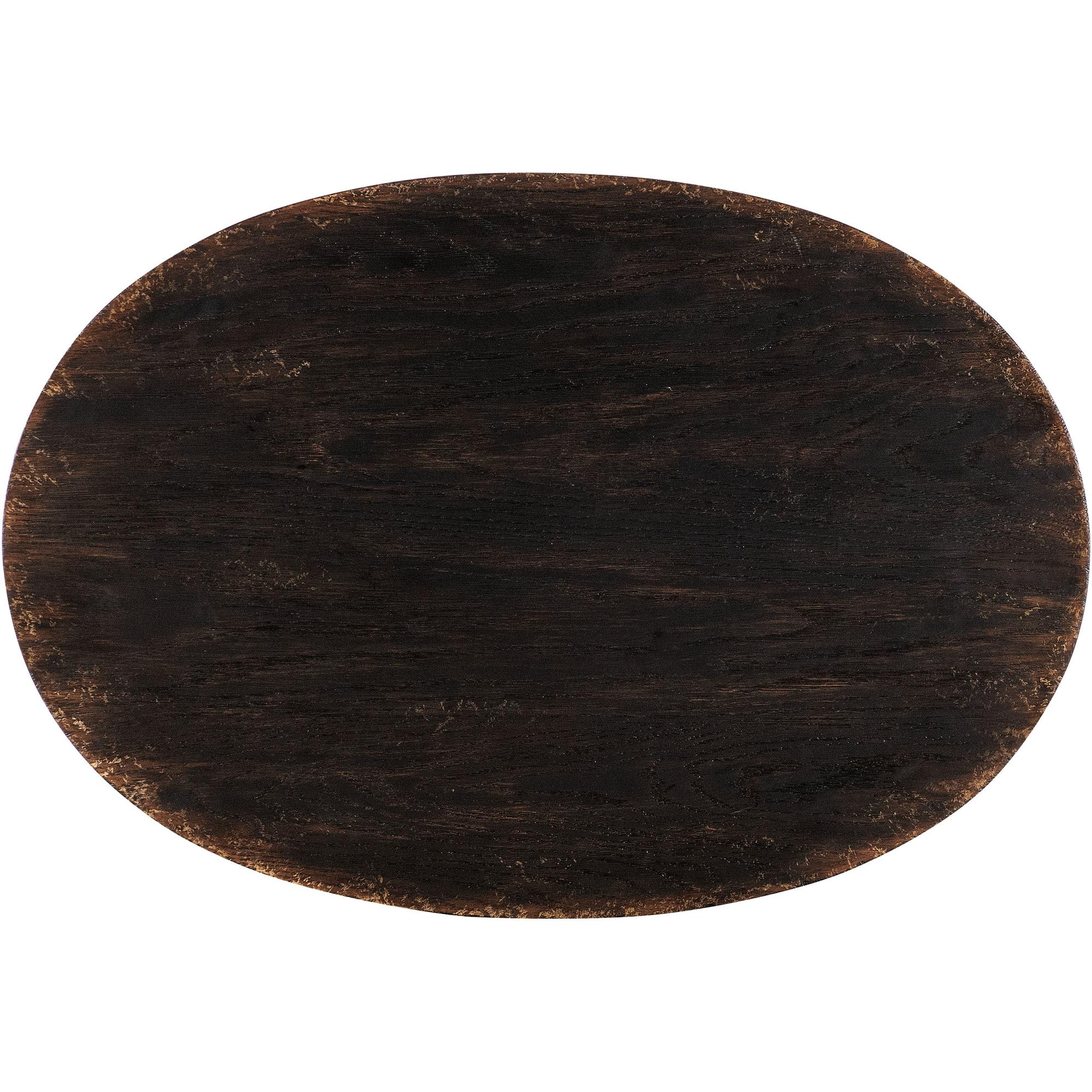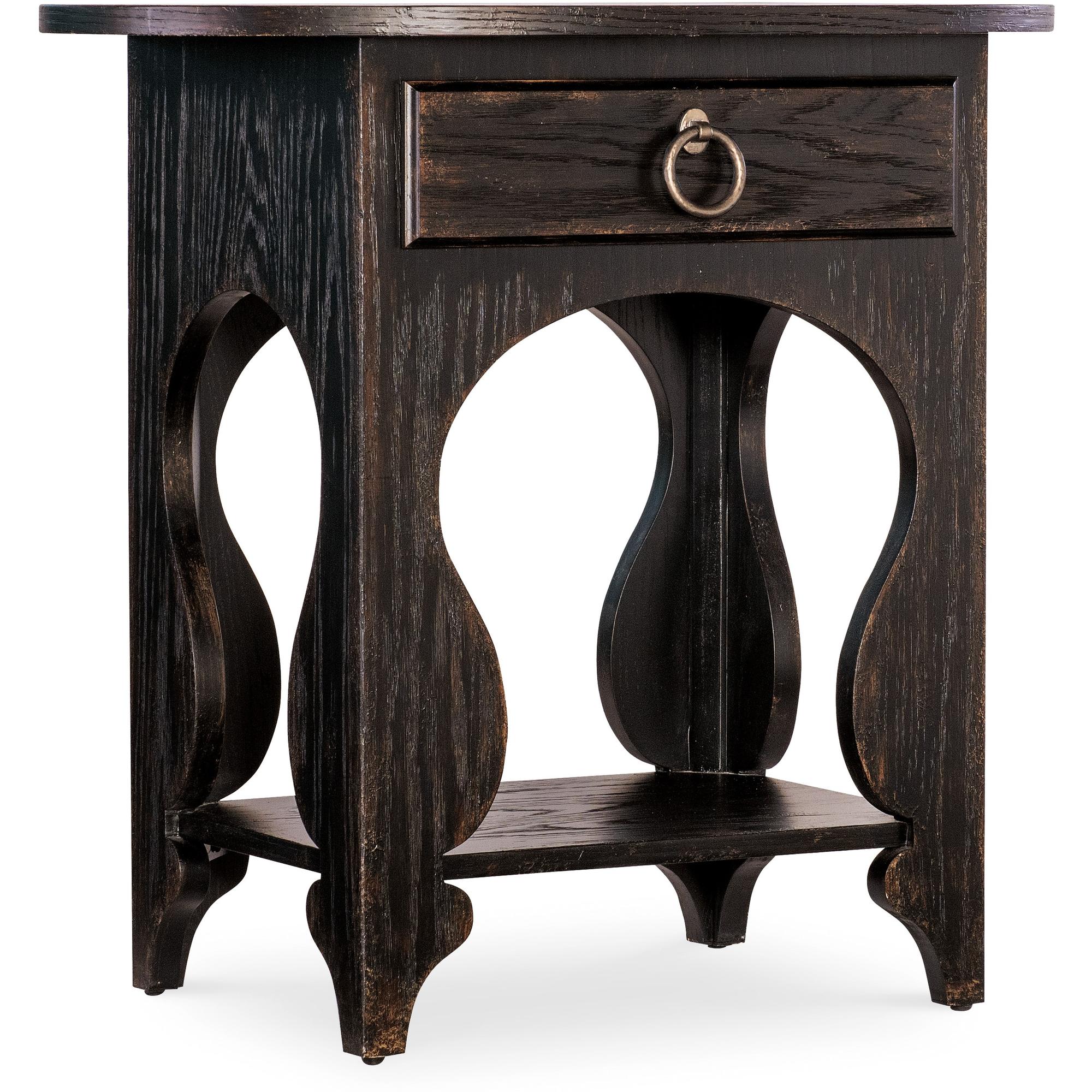 Features: One self-closing drawer Interior drawer finish in Honey One fixed shelf Shapely carved legs Oval shaped top