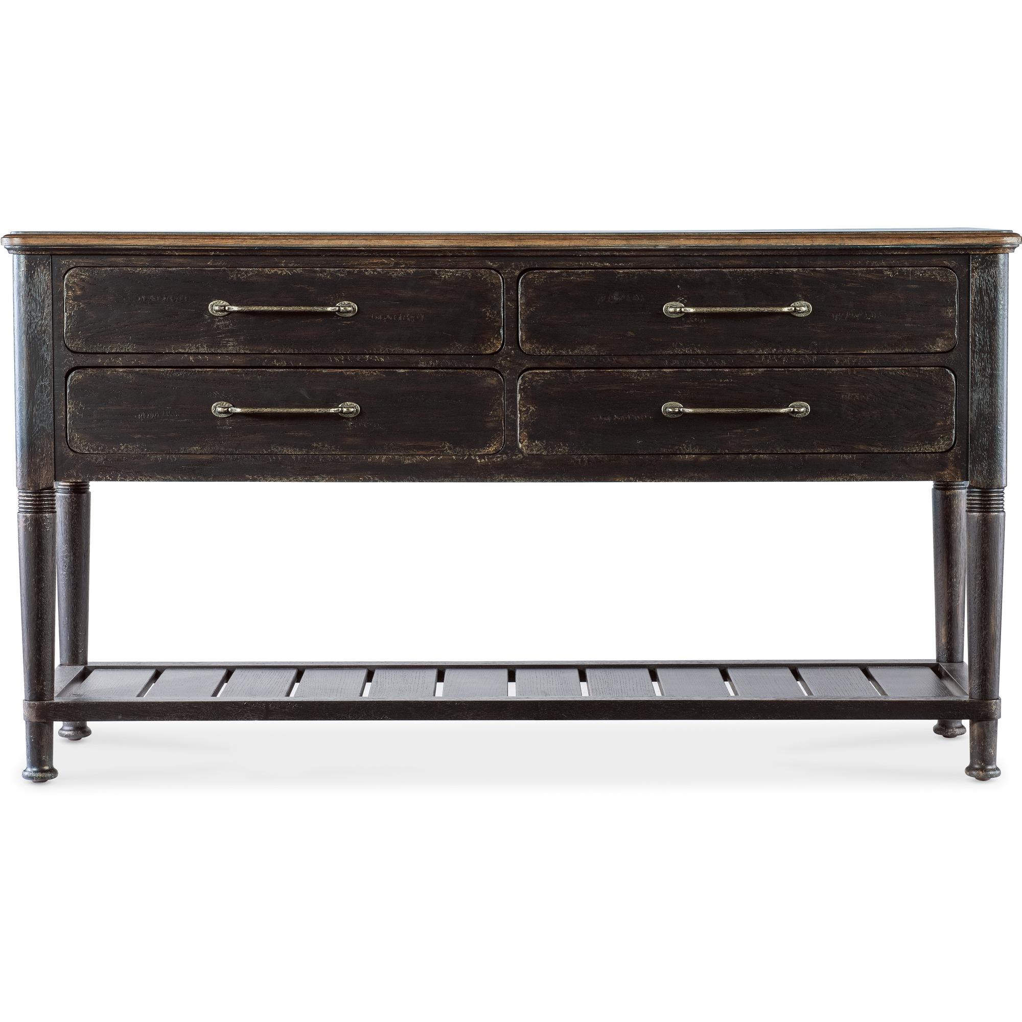 Features: Four self-closing drawers Top left drawer has black removable felt liner Top right drawer has removable felt lined silverware tray Interior finish is Honey One fixed planked shelf on bottom Carved accents on legs