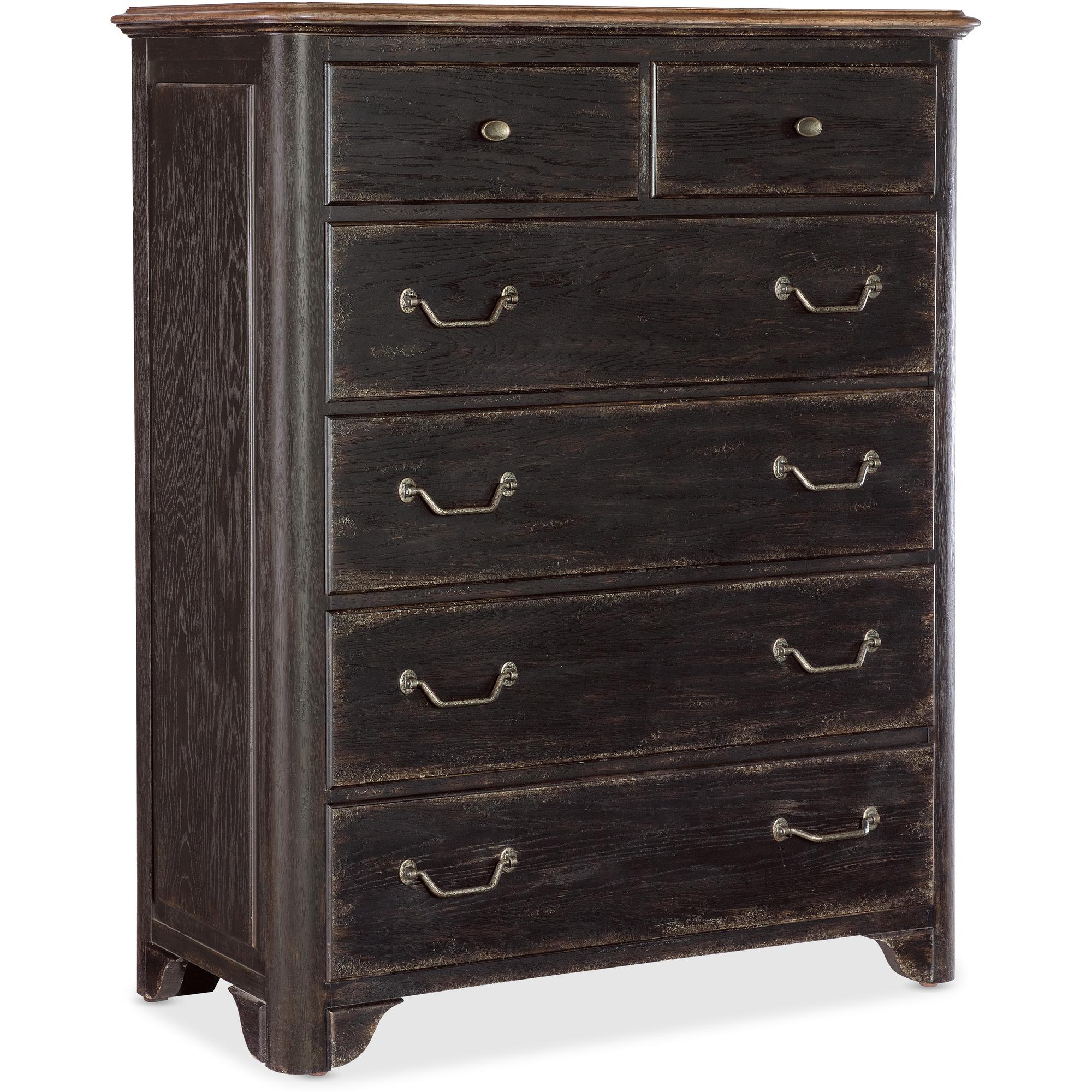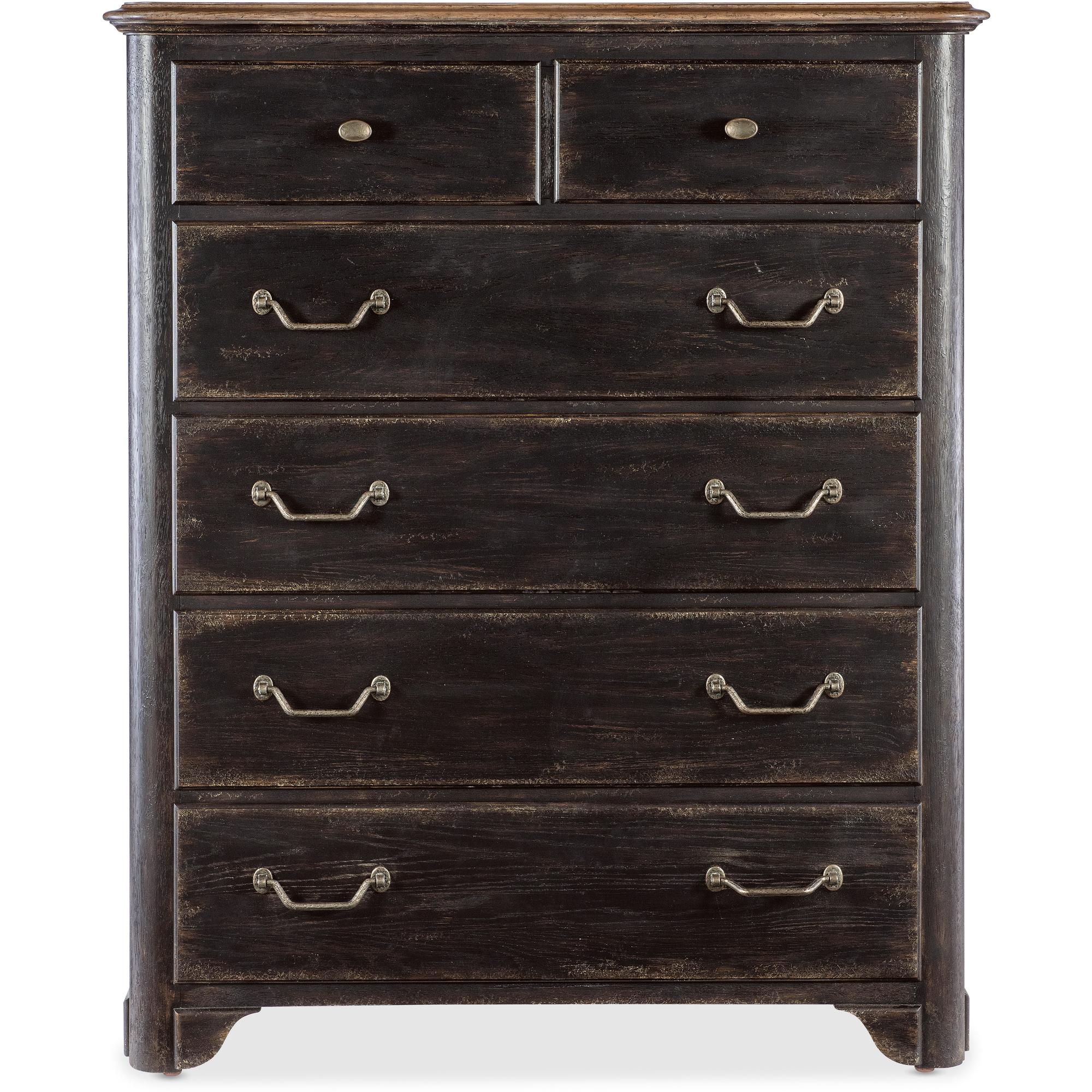 Features: Six self-closing drawers Top drawers with black removable felt liner Bottom drawer is cedar lined Drawer interior is in Honey finish Two-tone finish