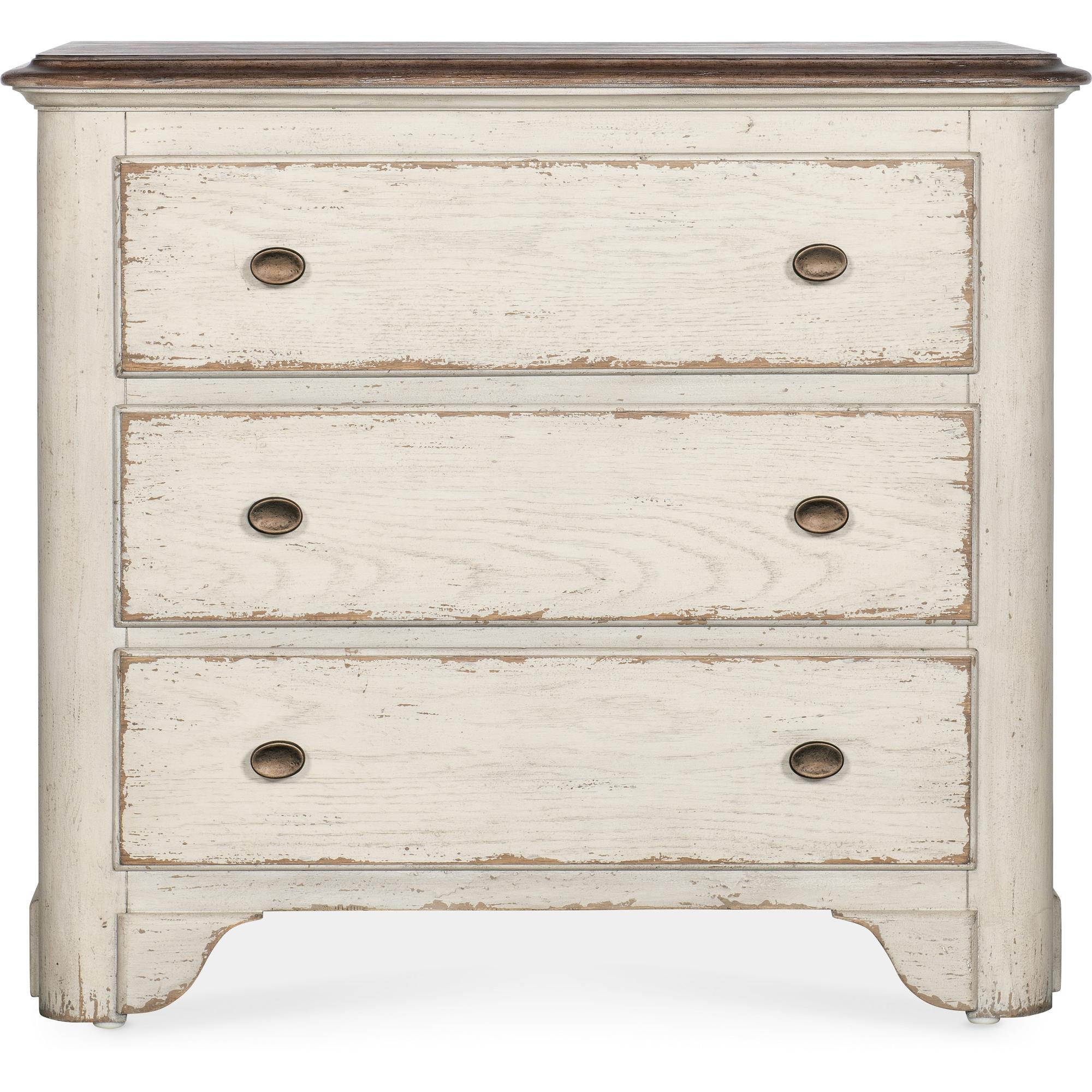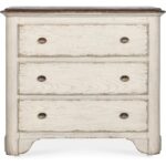 Finish: Daisy finish on base and Honey finish on top. The Americana Daisy finish is a time worn white finish on cathedral oak veneers representing the natural wear one might expect of pieces passed down through the family over time revealing the rich oak character beneath. The Americana Honey finish features a gentle, warm brown tone. The distressing hints at the passage of time, while the smooth surface invites you to run your fingers across it, connecting you with the generations who came before. Metal alloy pulls in an antique bronze finish.