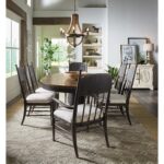 Finish: The Americana Molasses finish captures the essence of a well-loved heirloom, passed down through generations. The deep, dark tone over cathedral oak veneers add warmth, while the variations in color reveal the natural beauty of the wood beneath. The back of the arm chair is significantly more distressed with more rub-through than the side chair representing the usage over time and wear from gracious hosts.