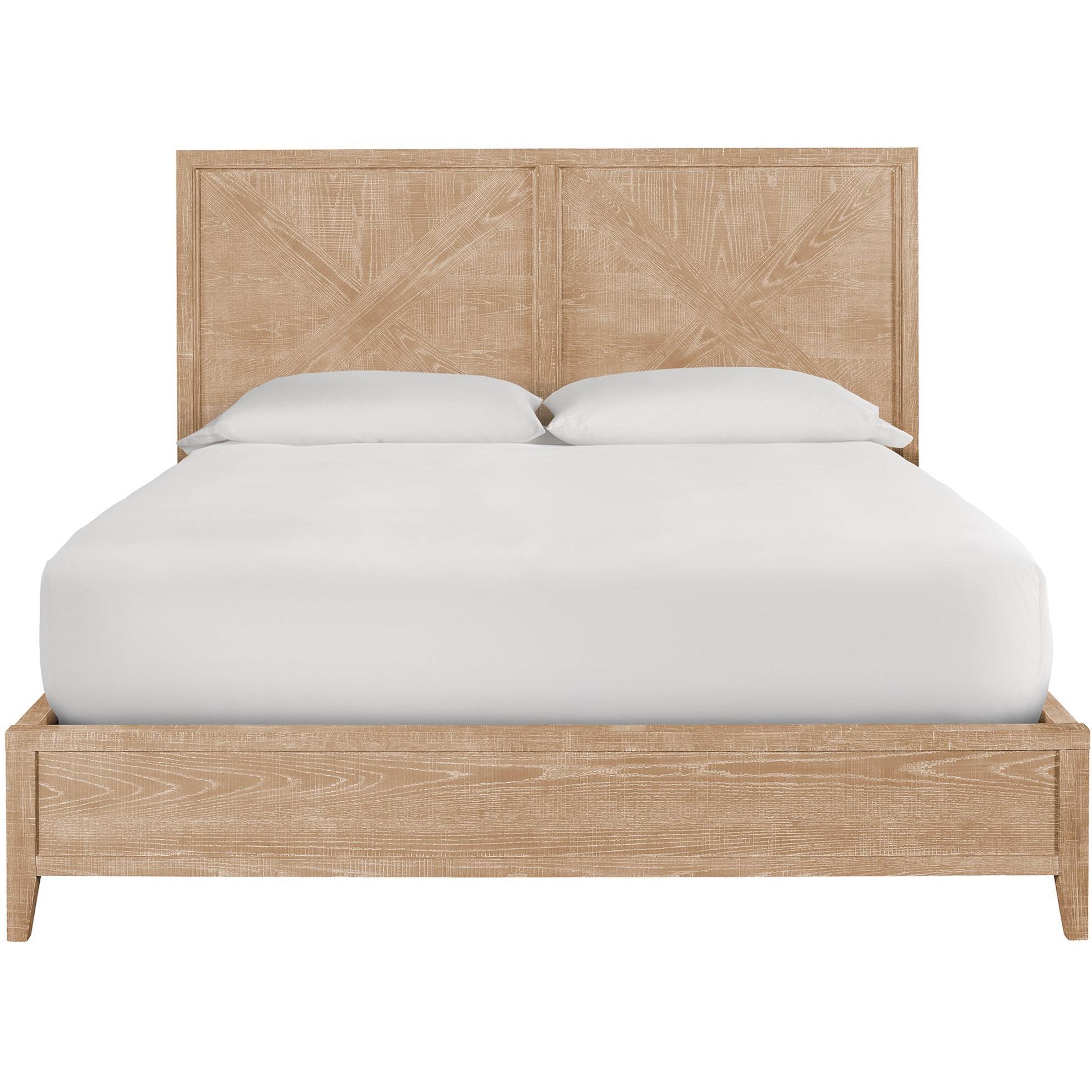 Showcasing refined elegance in a casual silhouette, the Ames Bed offers a contemporary farmhouse aesthetic with a rustic natural oak finish and plank-style panel detailing on the headboard.