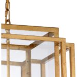 Antique gold leaf on iron with clear glass panels. Four lights. Comes with 9 feet of chain.