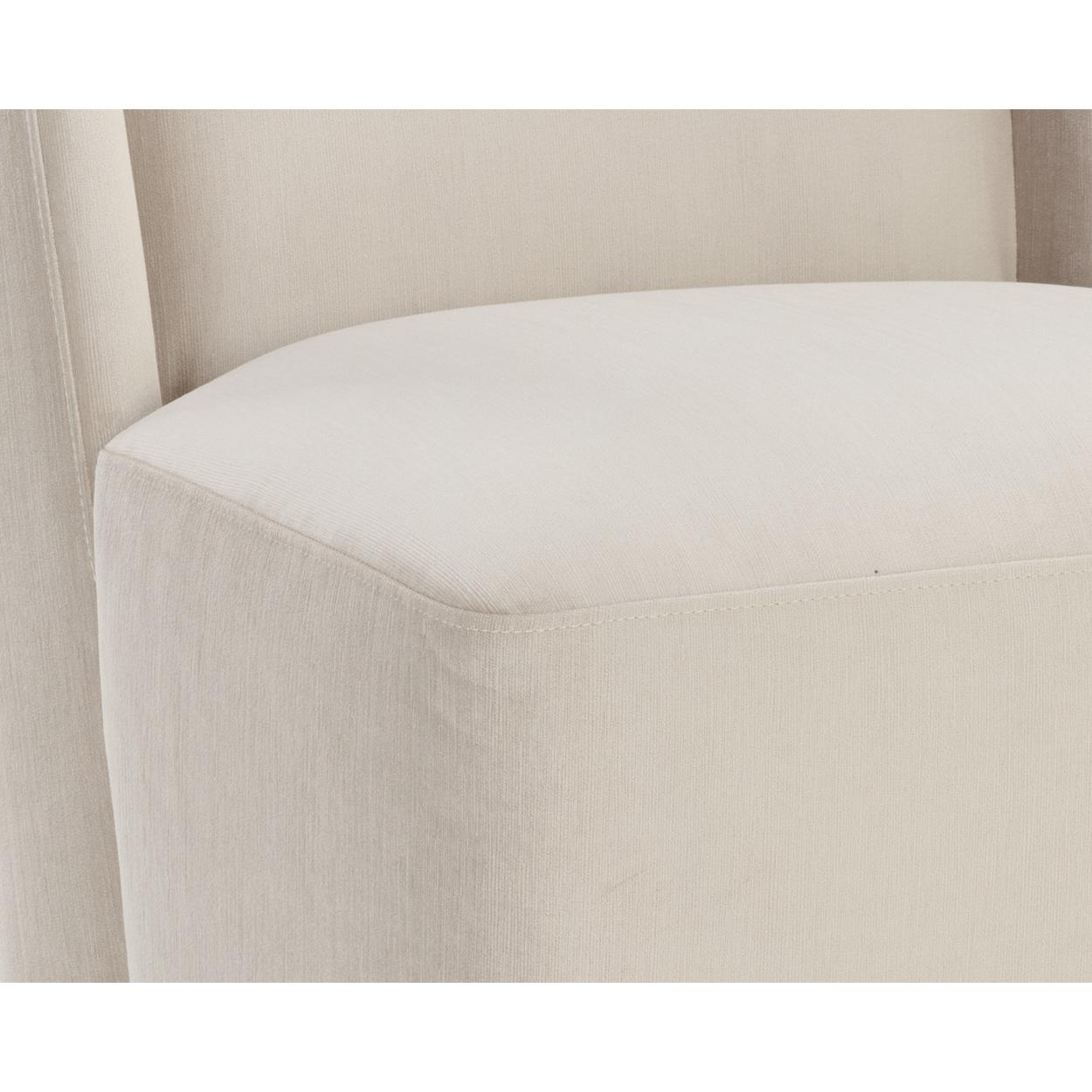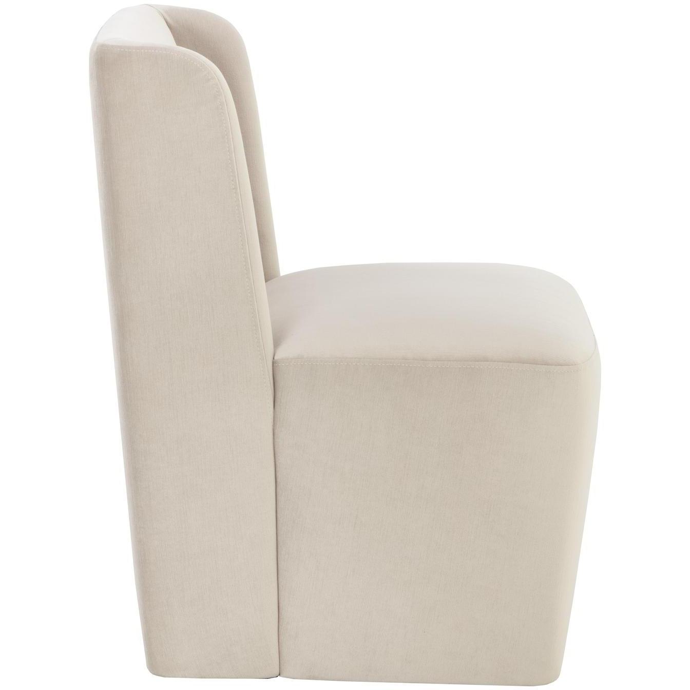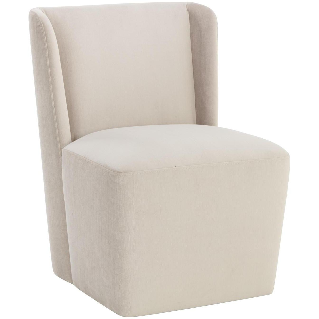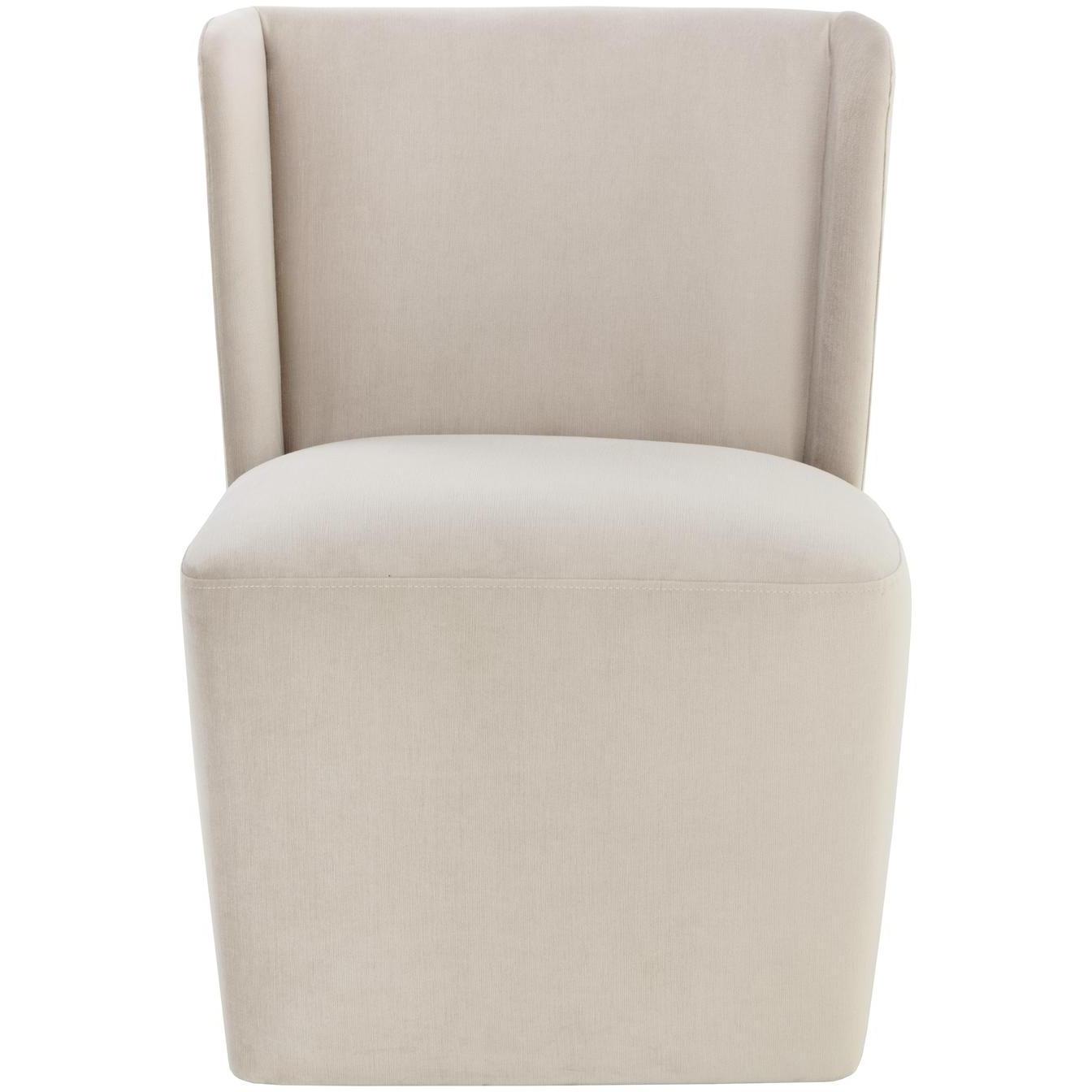 Soft curves define the classic silhouette of the Amita Wheeled Dining Chair. Fully upholstered in our piccolo prosecco performance fabric for soft comfortable seating. Performance fabric is moisture repellent, durable and easy to clean.