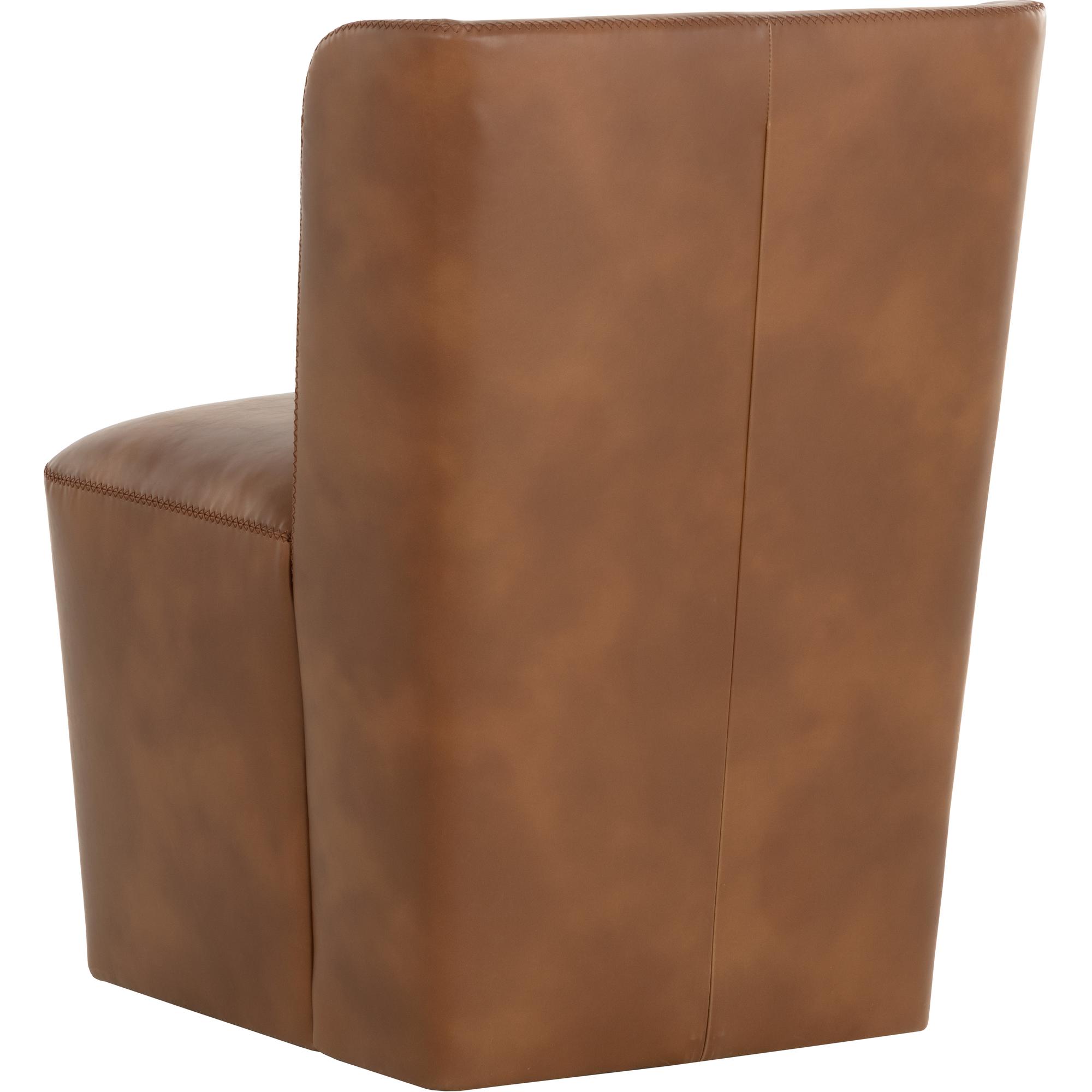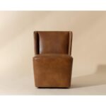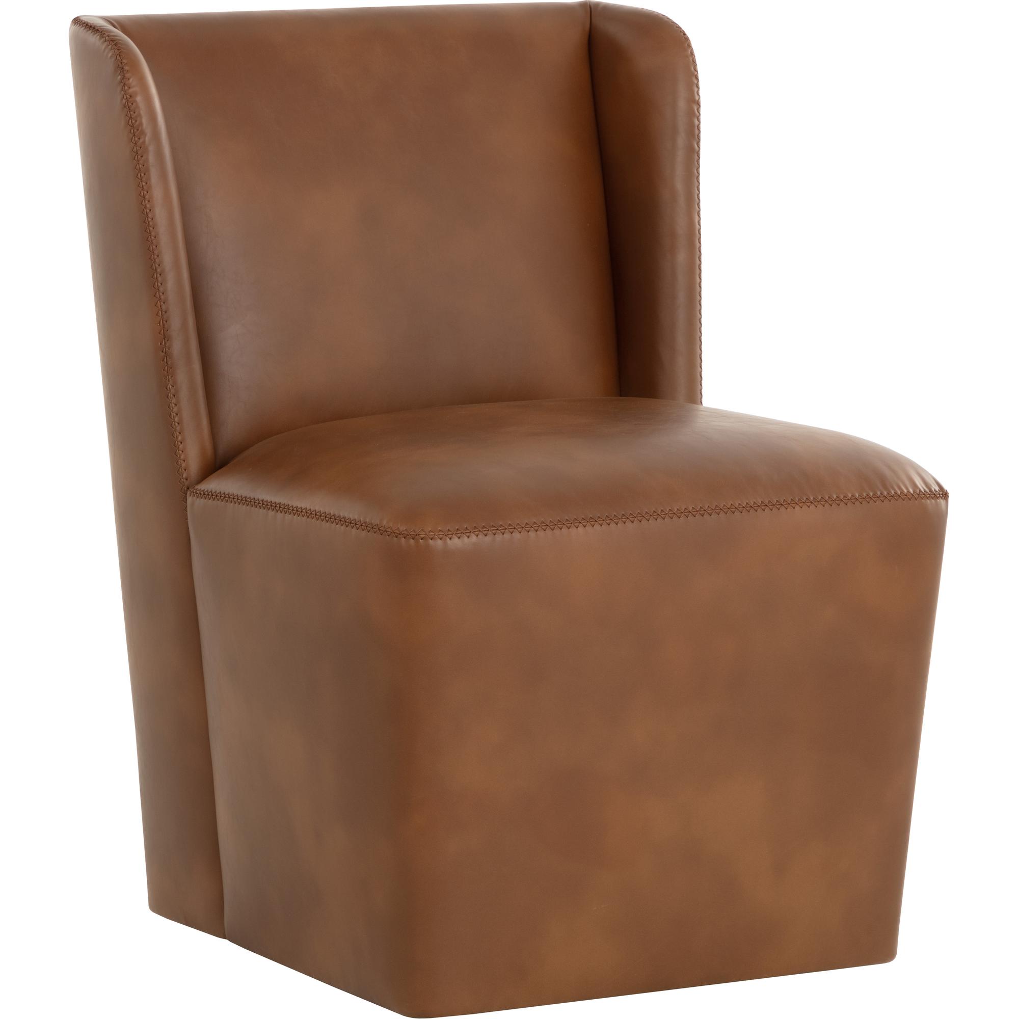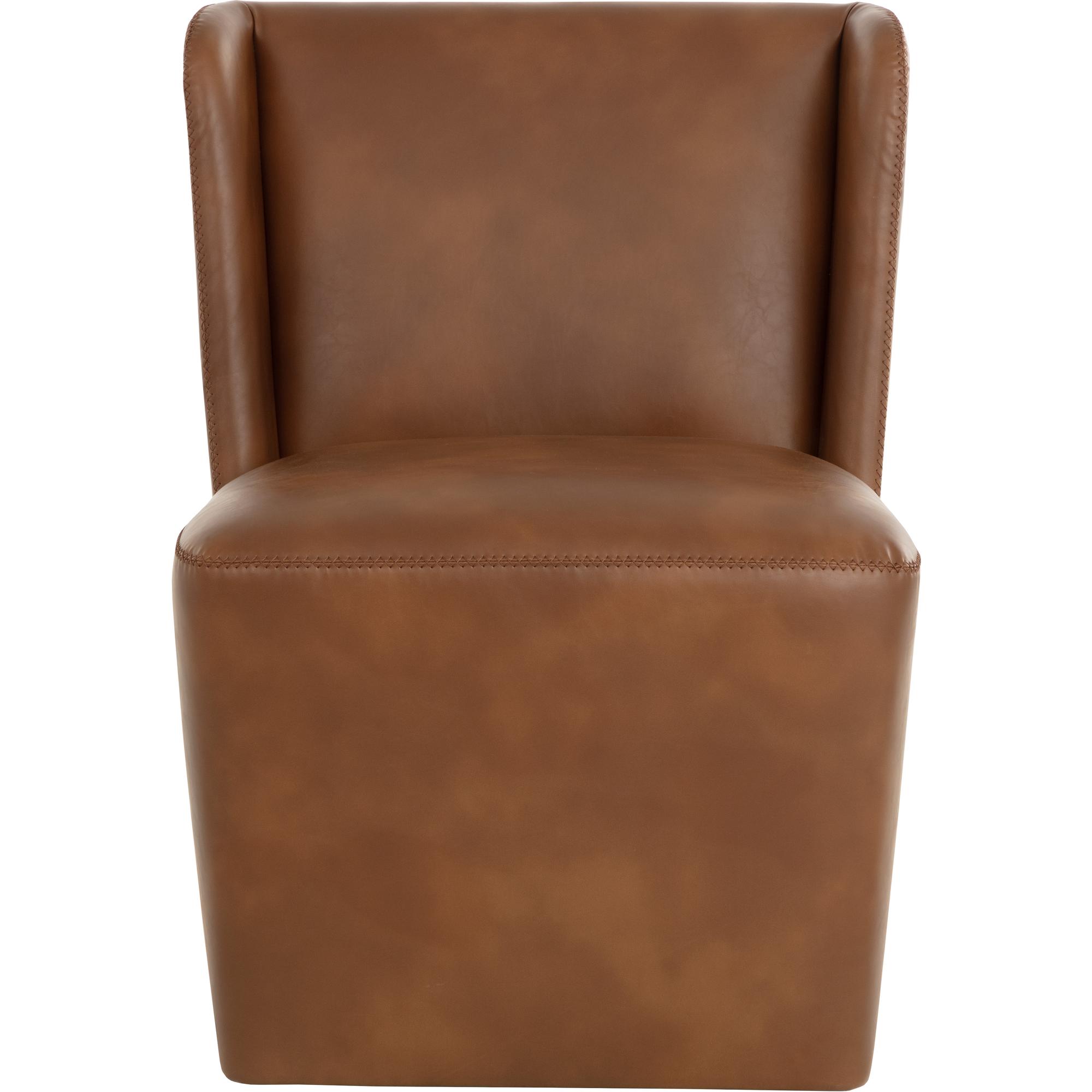 Soft curves define the classic silhouette of the Amita Wheeled Dining Chair. Fully upholstered in our tobacco tan faux leather for soft comfortable seating.