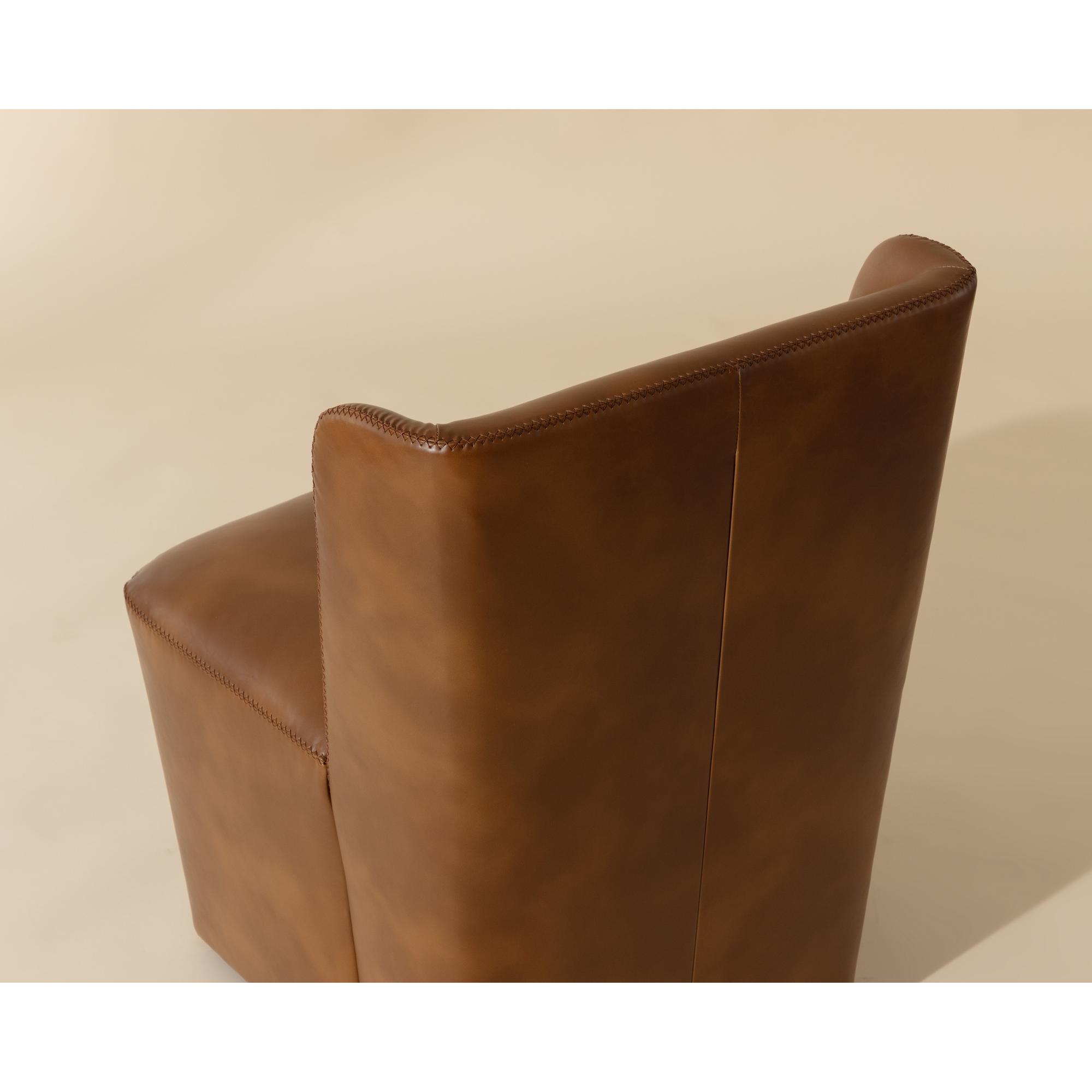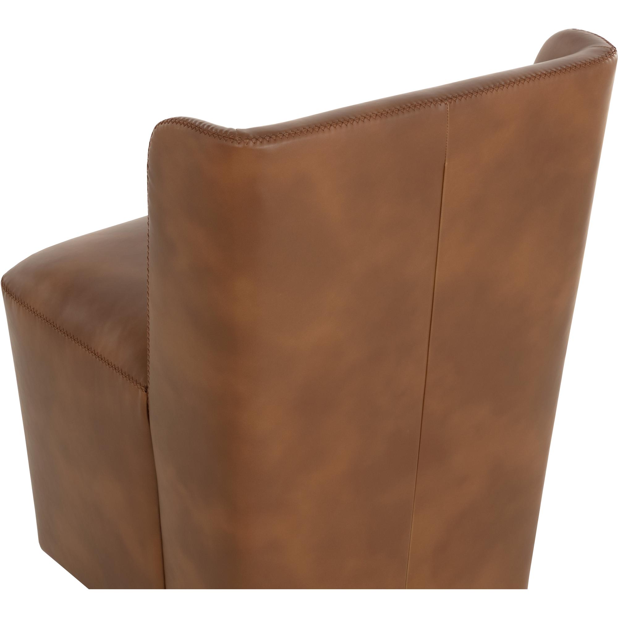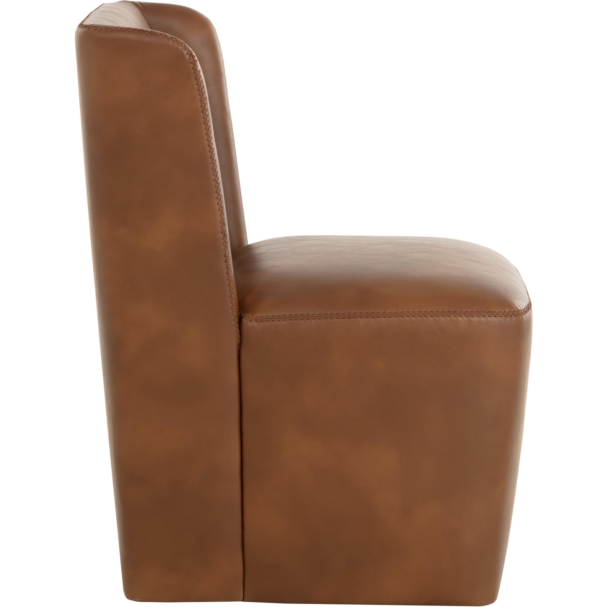 Soft curves define the classic silhouette of the Amita Wheeled Dining Chair. Fully upholstered in our tobacco tan faux leather for soft comfortable seating.