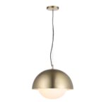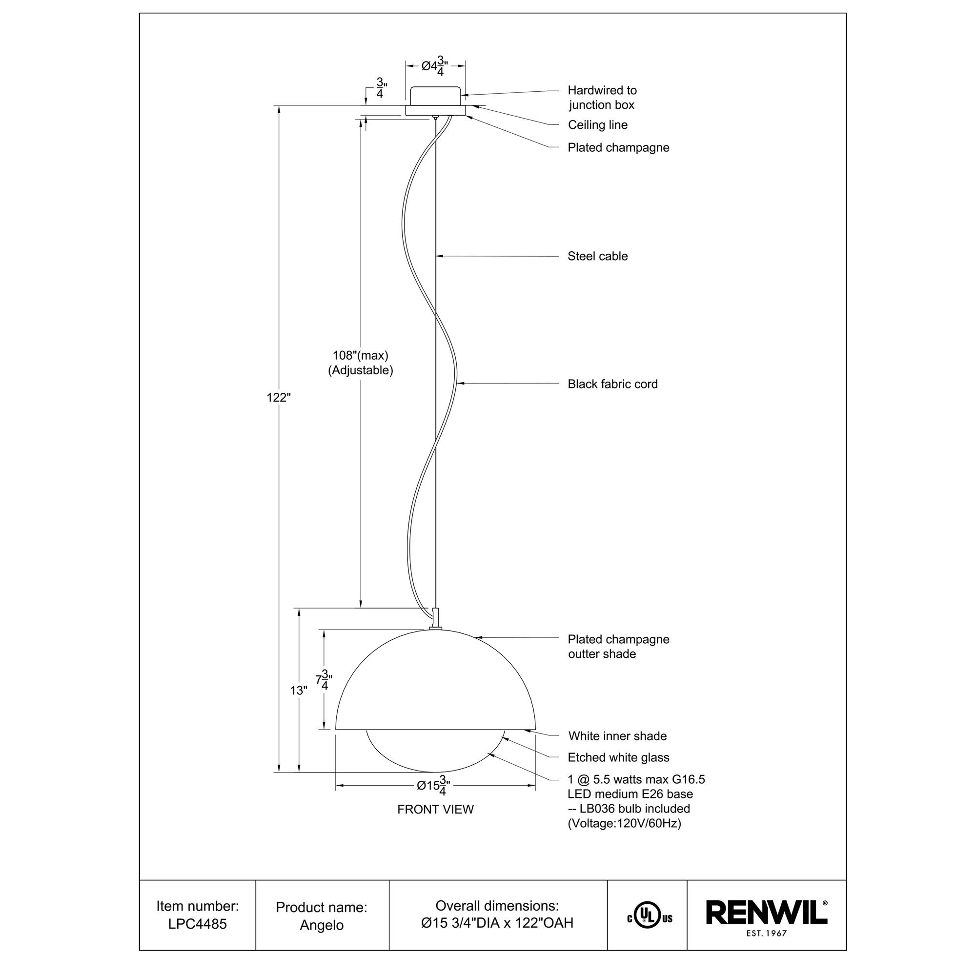 With a sleek, and minimalist silhouette, the Angelo ceiling light fixture offers an on-trend look that blends seamlessly in mid-century and ultra-modern settings. Clean lines and timeless finishes come to life through a sculptural dome-shaped shade in champagne-plated iron that holds a white etched glass globe. An eye-catching element even when turned off, once illuminated, this pendant fixture becomes even more beautiful, diffusing warm, ambient light anywhere it hangs. Including an LED bulb and hardwiring with a white cloth-covered cable, this hanging ceiling light fixture is ready to be installed over a dining table, kitchen island, or any spot that’s craving a shot of modern style.
