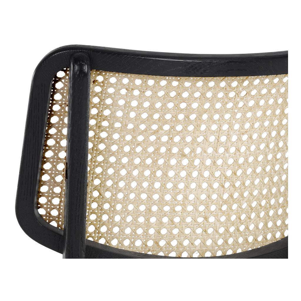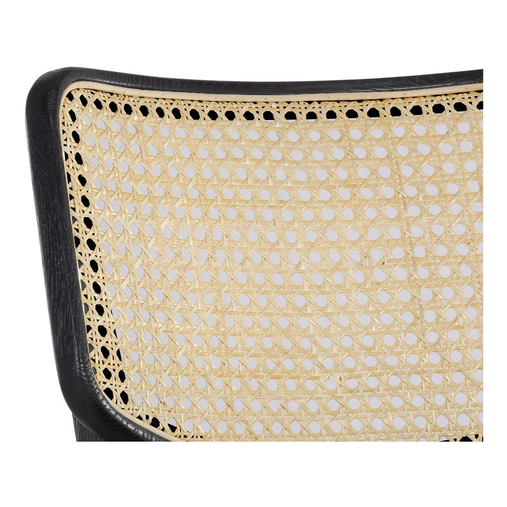This stylish dining chair will bring life to any living, lounge, office and dining space. Features a beautiful black seat with a natural rattan seatback. A solid black oak wood frame complete this naturally edgy design.