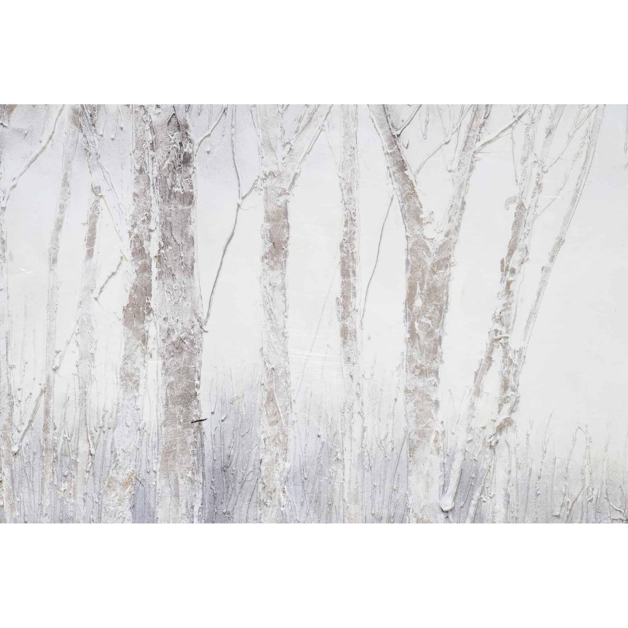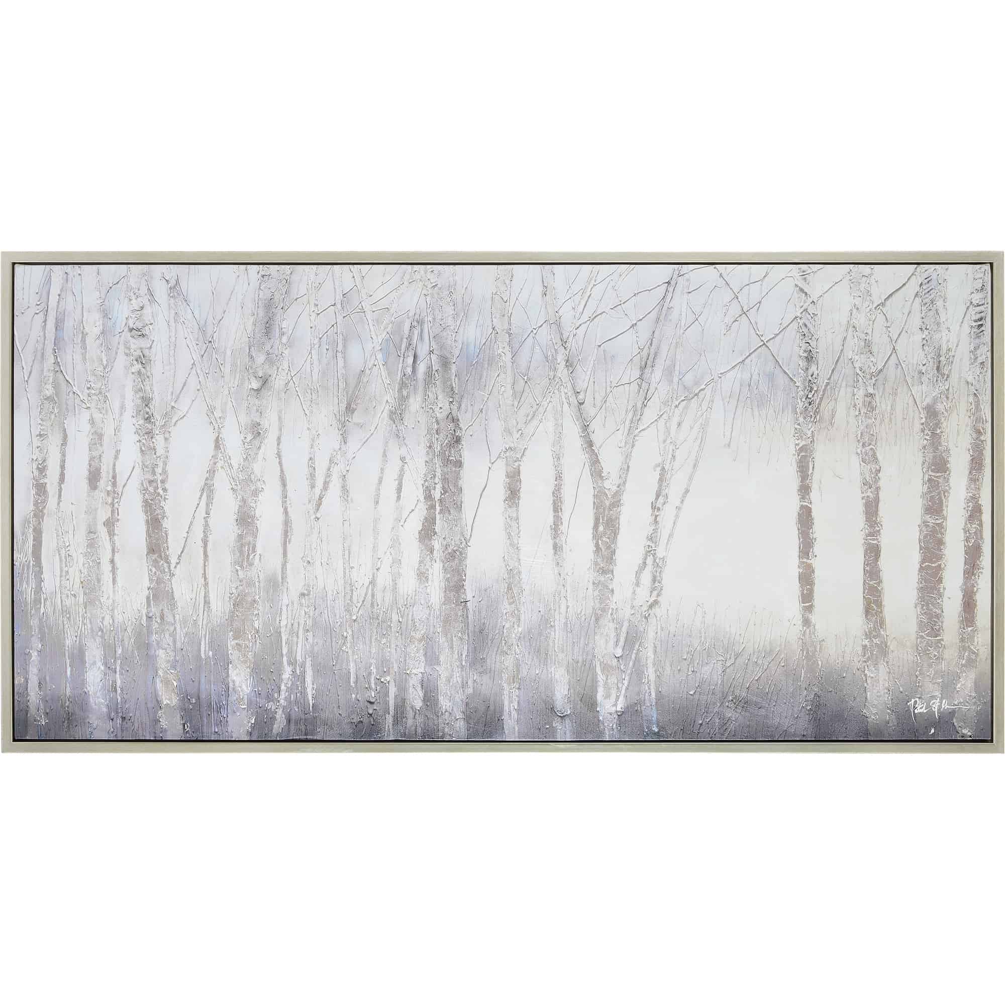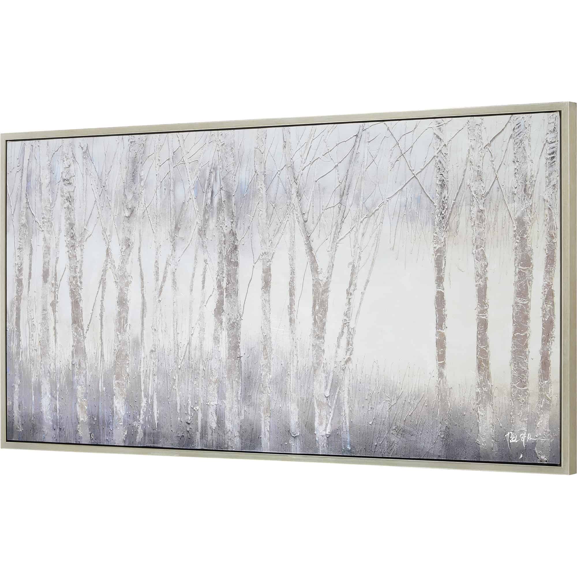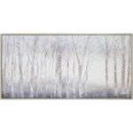 The dark energy of the woods on a crisp, cool day is captured within a canvas and poured into the home through this work of printed art. A silver frame serves as a cohesive addition to the grey palette. Grand in size, this design is at its best when set above a focal piece of furniture in any space.