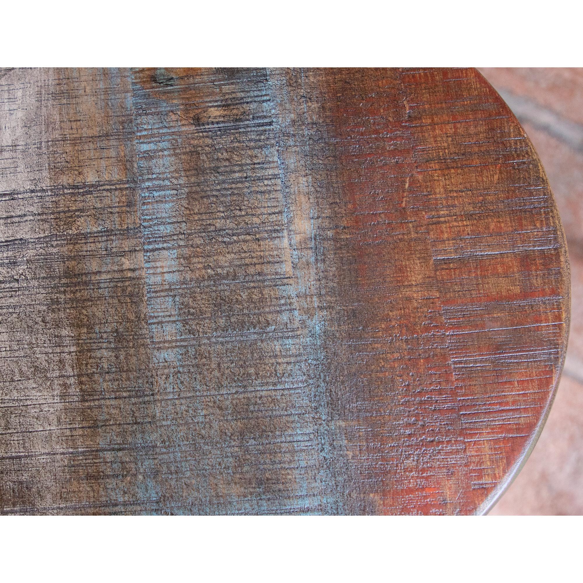 - Multi-step, soft multi-colored finish on hand distressed wood, complemented by a rust finish on the iron base.