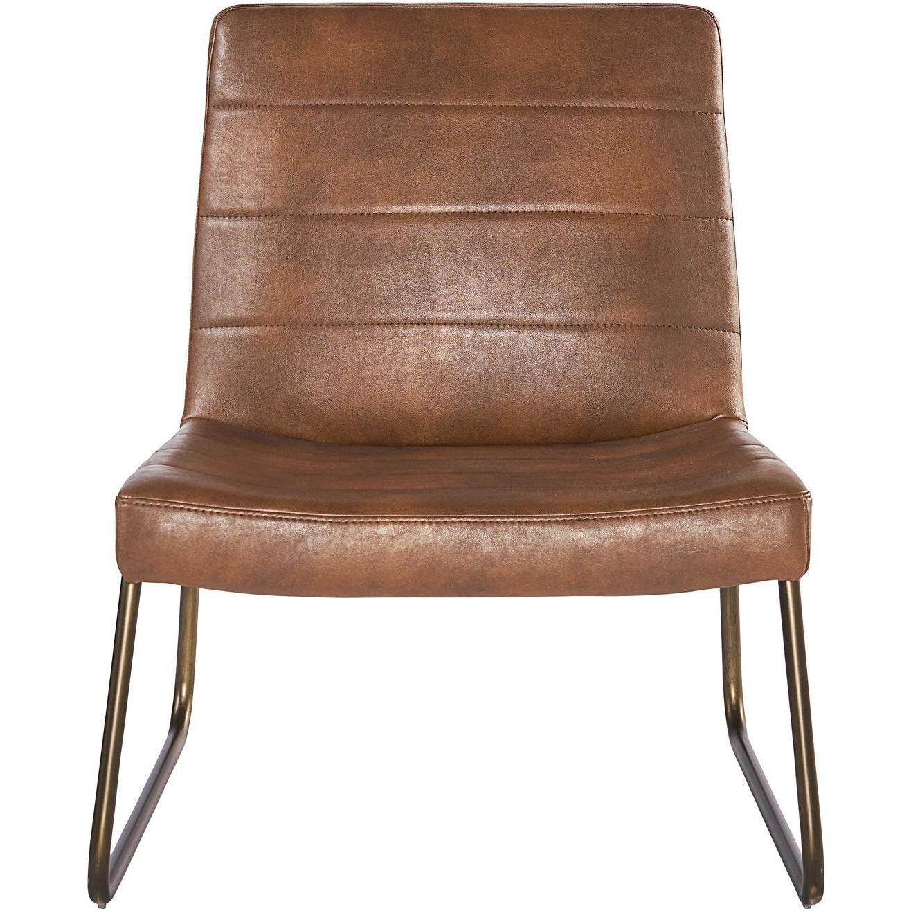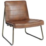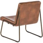 A handsomely designed lounge chair with a sculpted seat and seatback for comfort and style. Stocked in bravo cognac faux leather with an exposed rustic bronze steel cantilever frame. Can be placed in urban and contemporary dining and office spaces.