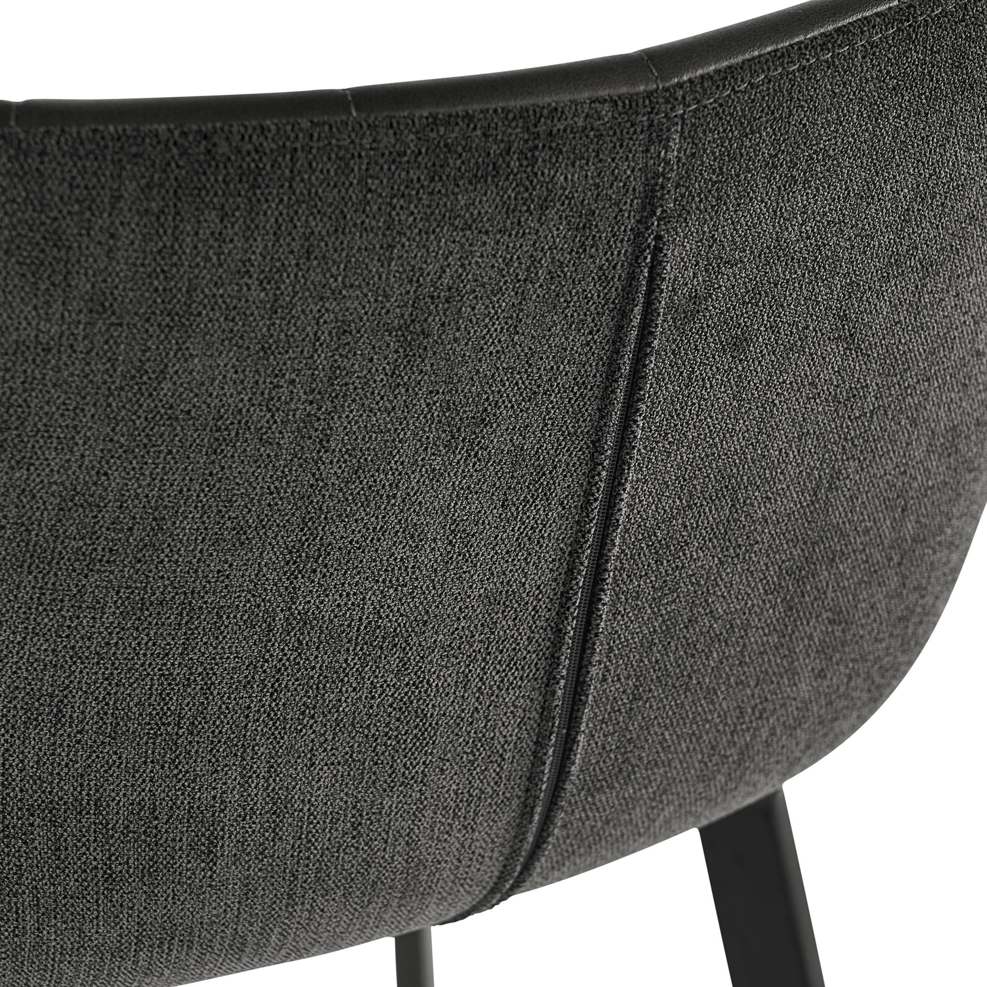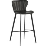 A compact barstool designed with a modern, feminine style. Features clamshell style tufting on the seatback. Stocked in bravo portabella faux leather with a contrasting kohl grey fabric exterior. Finished with black steel legs. A stylish seating option for dining spaces of all sizes. Handle With Care: This design has been crafted with faux leather. Faux leather is manufactured to reflect the natural characteristics of leather; as such, colour variations, markings wrinkles, grooves, and light scratches are appreciated characteristics. No two pieces will be alike. Visit our Product Care page for more information on how to ensure the lasting beauty of this piece.