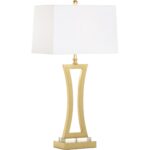 A geometric shape in metallic gold finish makes a beautiful accent for a modern home. The Arbor Table Lamp is sculptural with its open form and acrylic rectangular base, topped with a white rectangular shade.